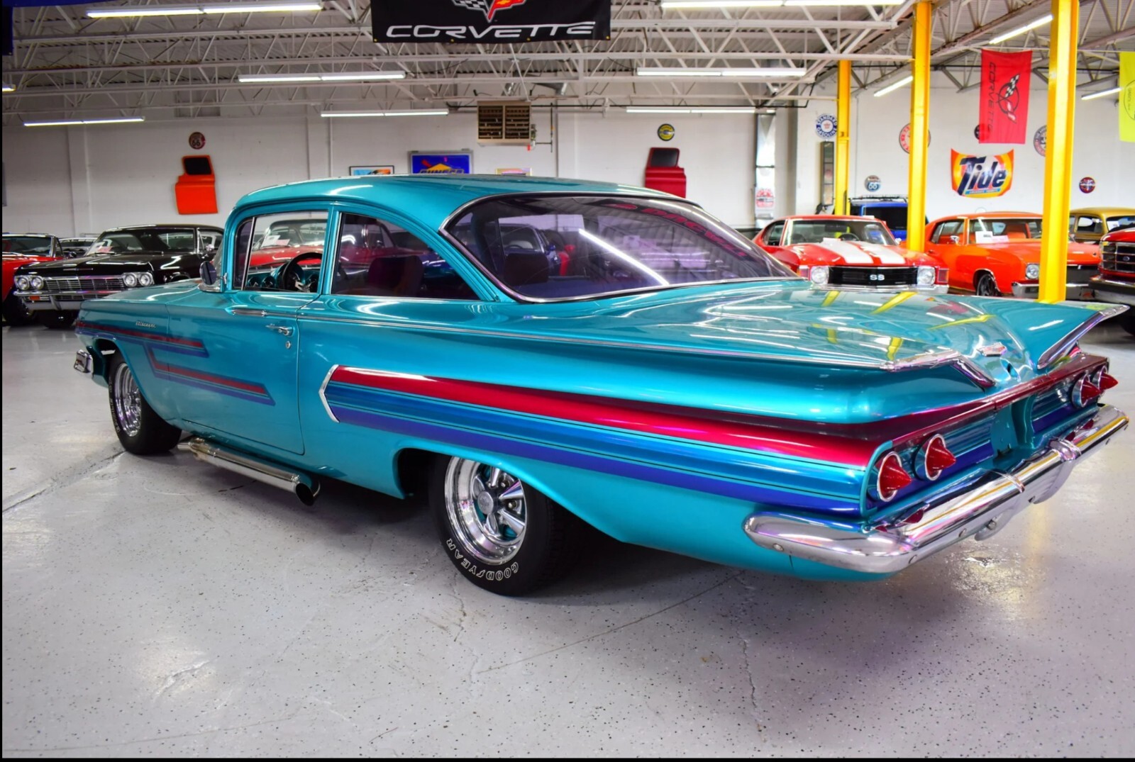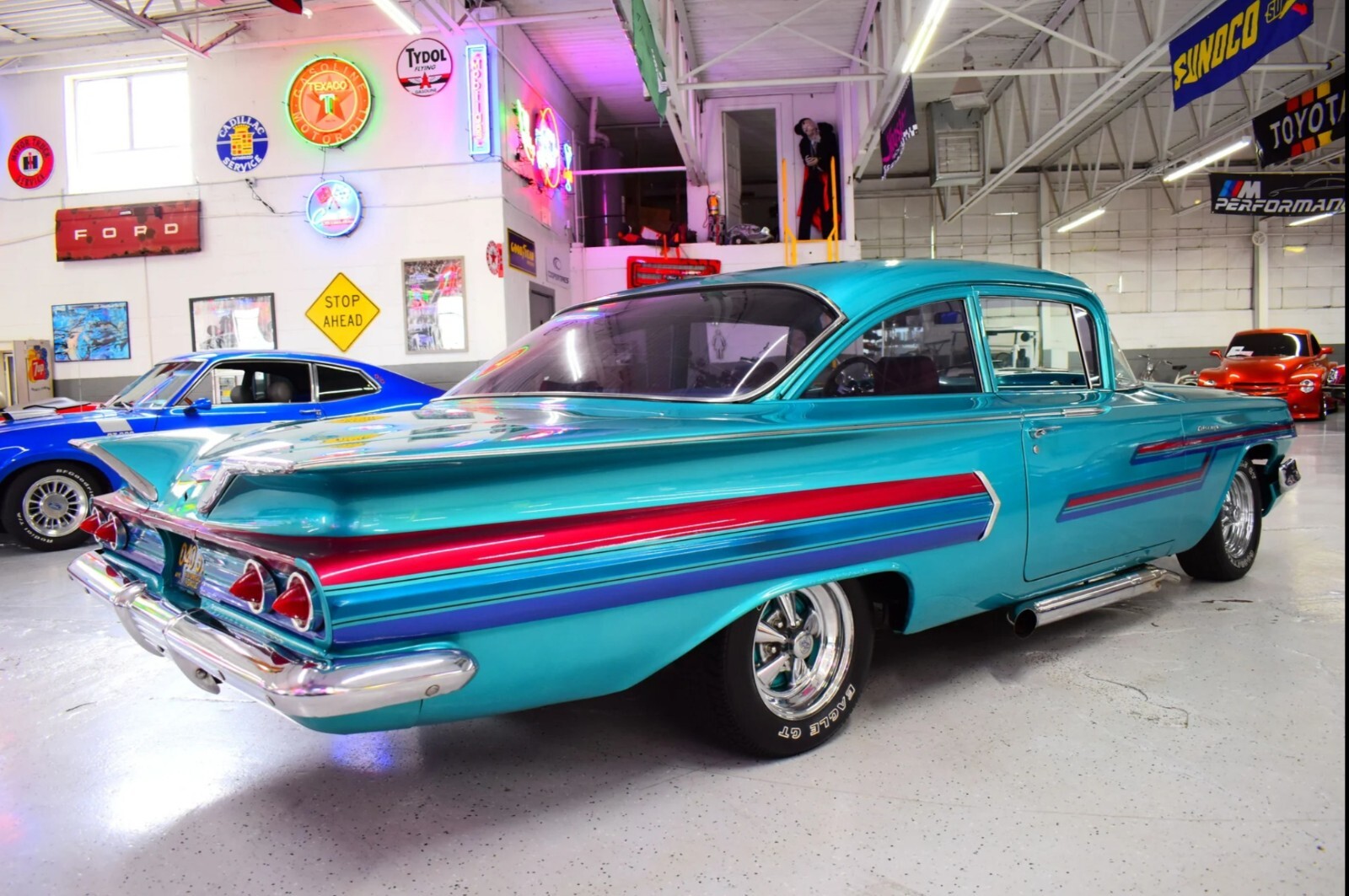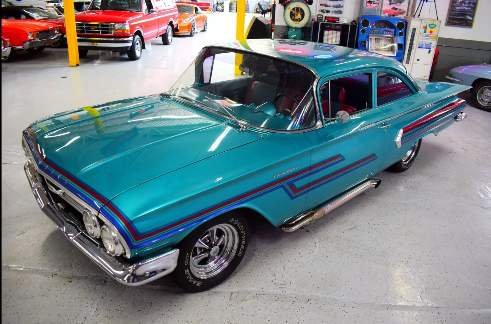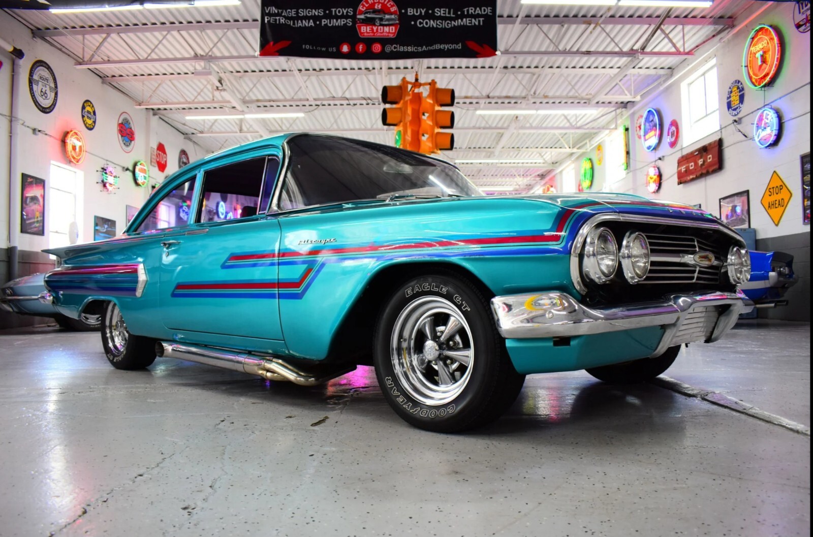 Dive into a bygone era of automotive flair with this stunning 1960 Chevy Biscayne,Painted in a captivating turquoise hue, accented by bold pink and blue racingstripes, this Biscayne commands attention wherever it roams. Its custom paint job exudes a retro-cool vibe that harkens back to the golden age of American muscle cars