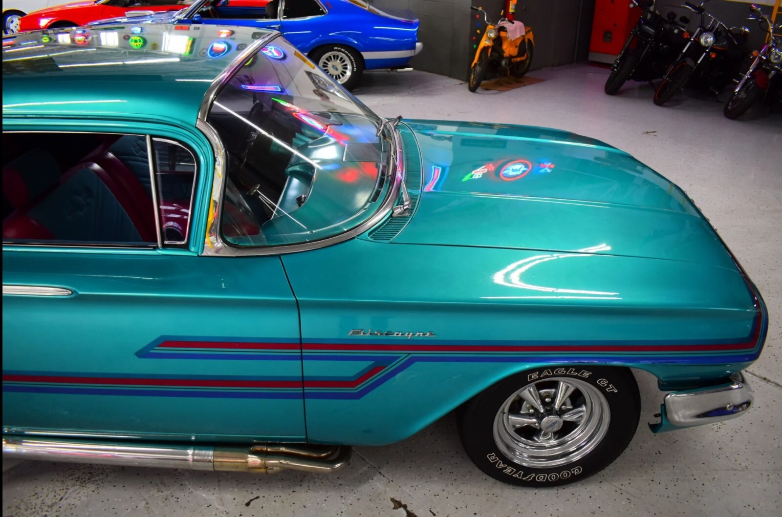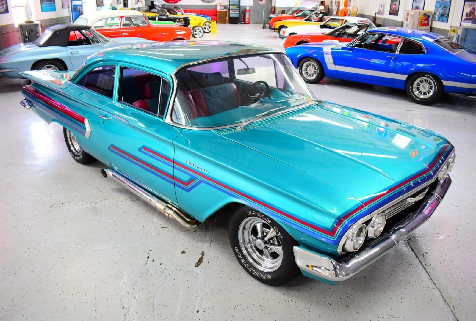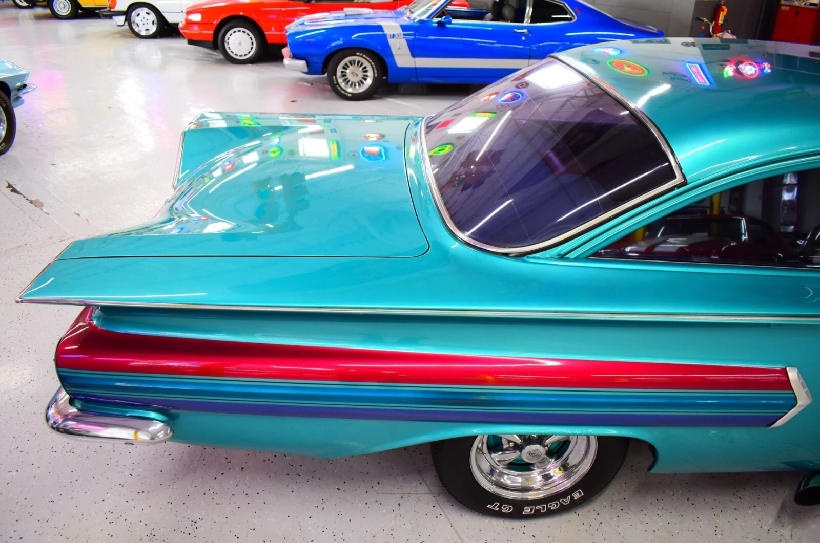 Dive into a bygone era of automotive flair with this stunning 1960 Chevy Biscayne,Painted in a captivating turquoise hue, accented by bold pink and blue racingstripes, this Biscayne commands attention wherever it roams. Its custom paint job exudes a retro-cool vibe that harkens back to the golden age of American muscle cars