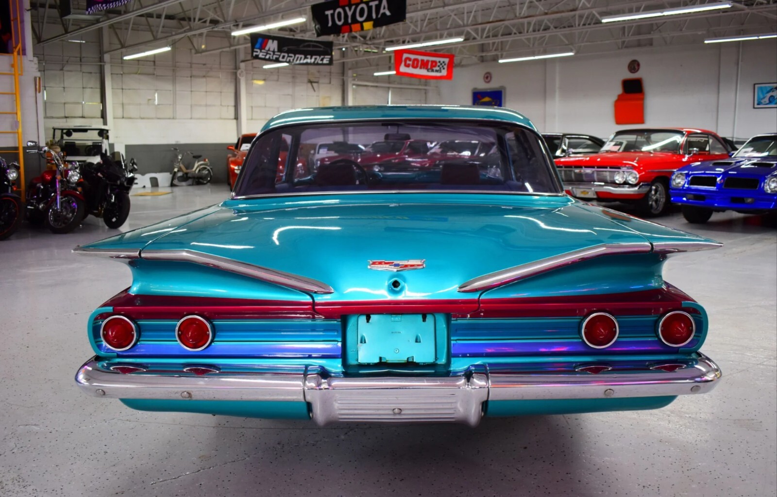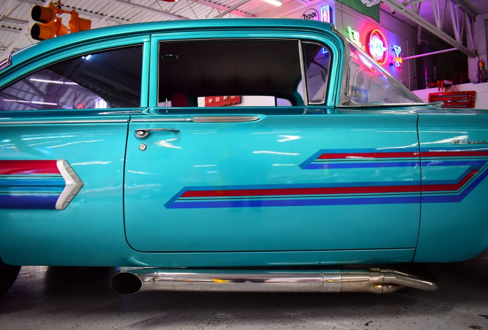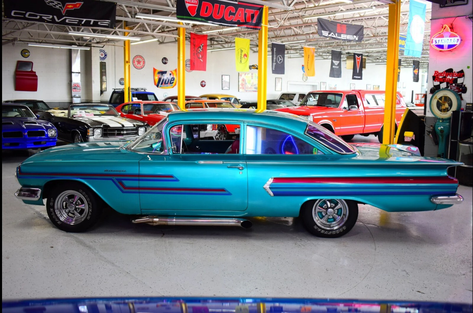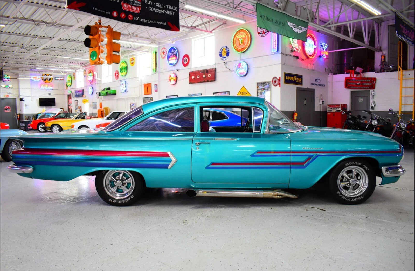 Dive into a bygone era of automotive flair with this stunning 1960 Chevy Biscayne,Painted in a captivating turquoise hue, accented by bold pink and blue racingstripes, this Biscayne commands attention wherever it roams. Its custom paint job exudes a retro-cool vibe that harkens back to the golden age of American muscle cars