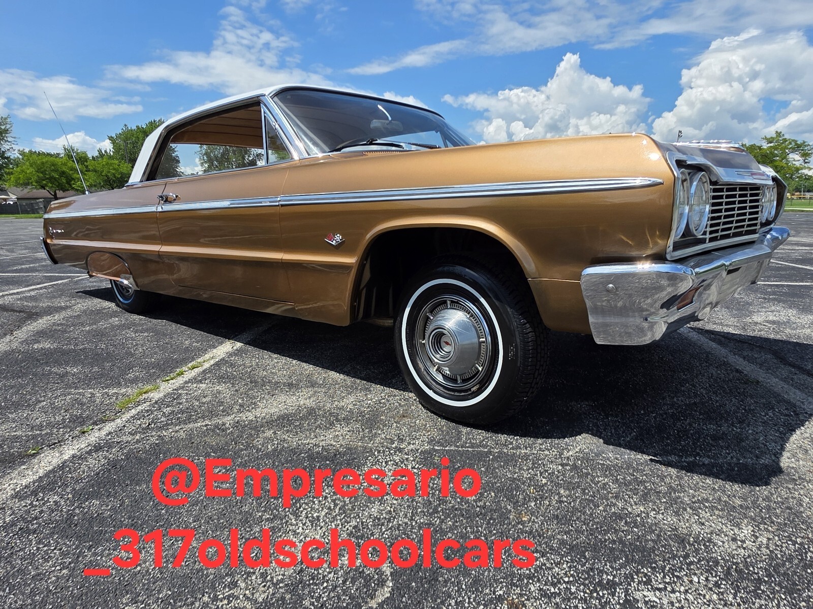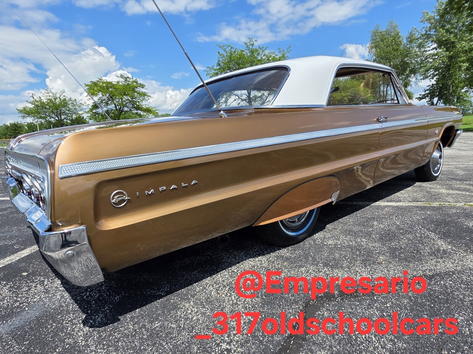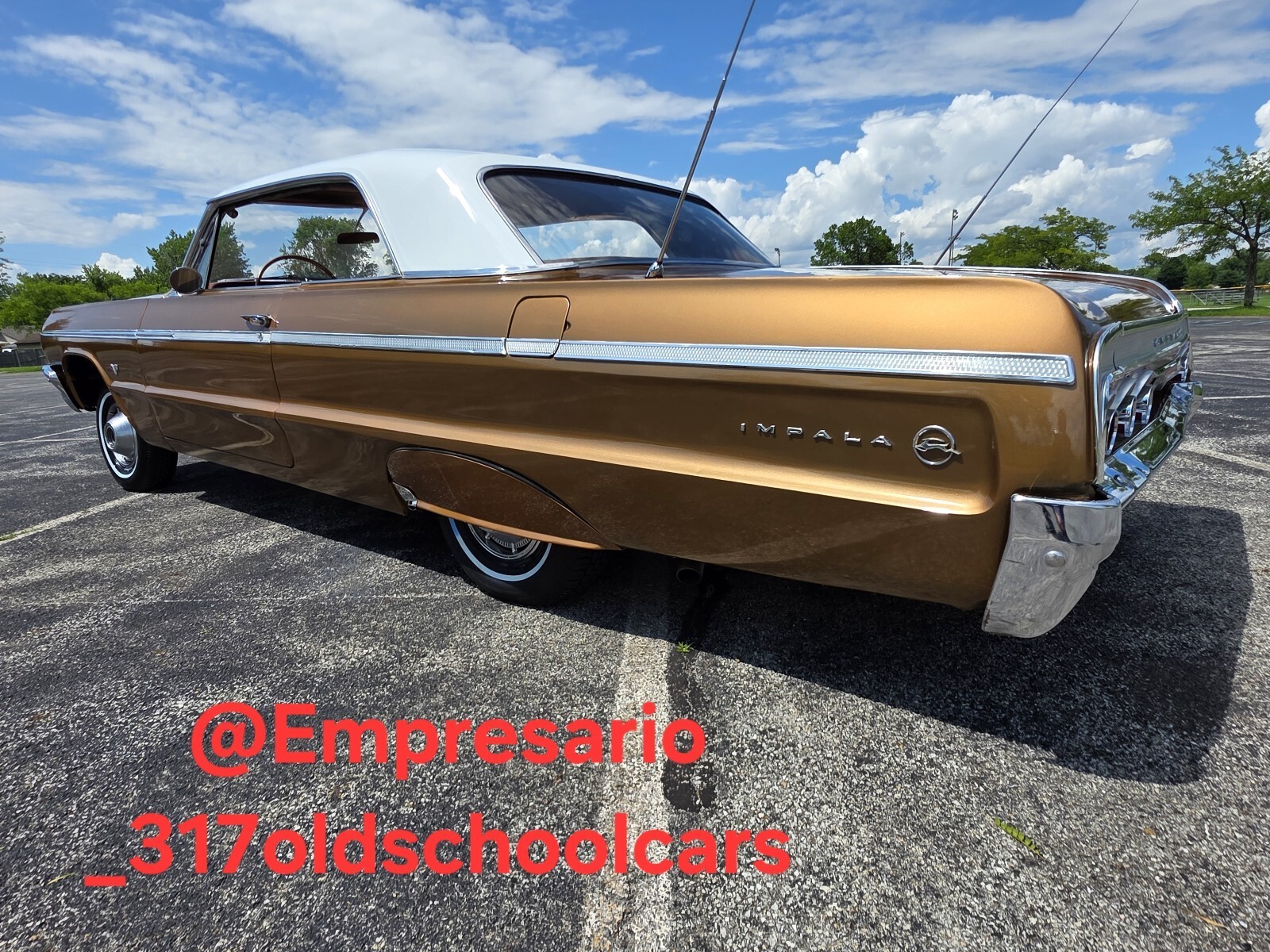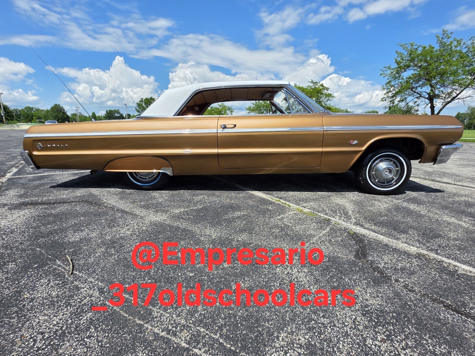1964 Chevrolet Impala. 327 V8 engine w/ TH350 automatic transmission. Factory color saddle tan poly with white top. Factory power steering. Runs & drives great. Clean custom interior. Aftermarket full audio system. Custom panels in trunk. Factory wheels. Double antennas. Skirts. Brand new springs, that haven't even been broken into yet. Floors and trunk are solid. Very clean car all around. Great cruiser. Clean title! No trades. $35,000. Located in Indiana.