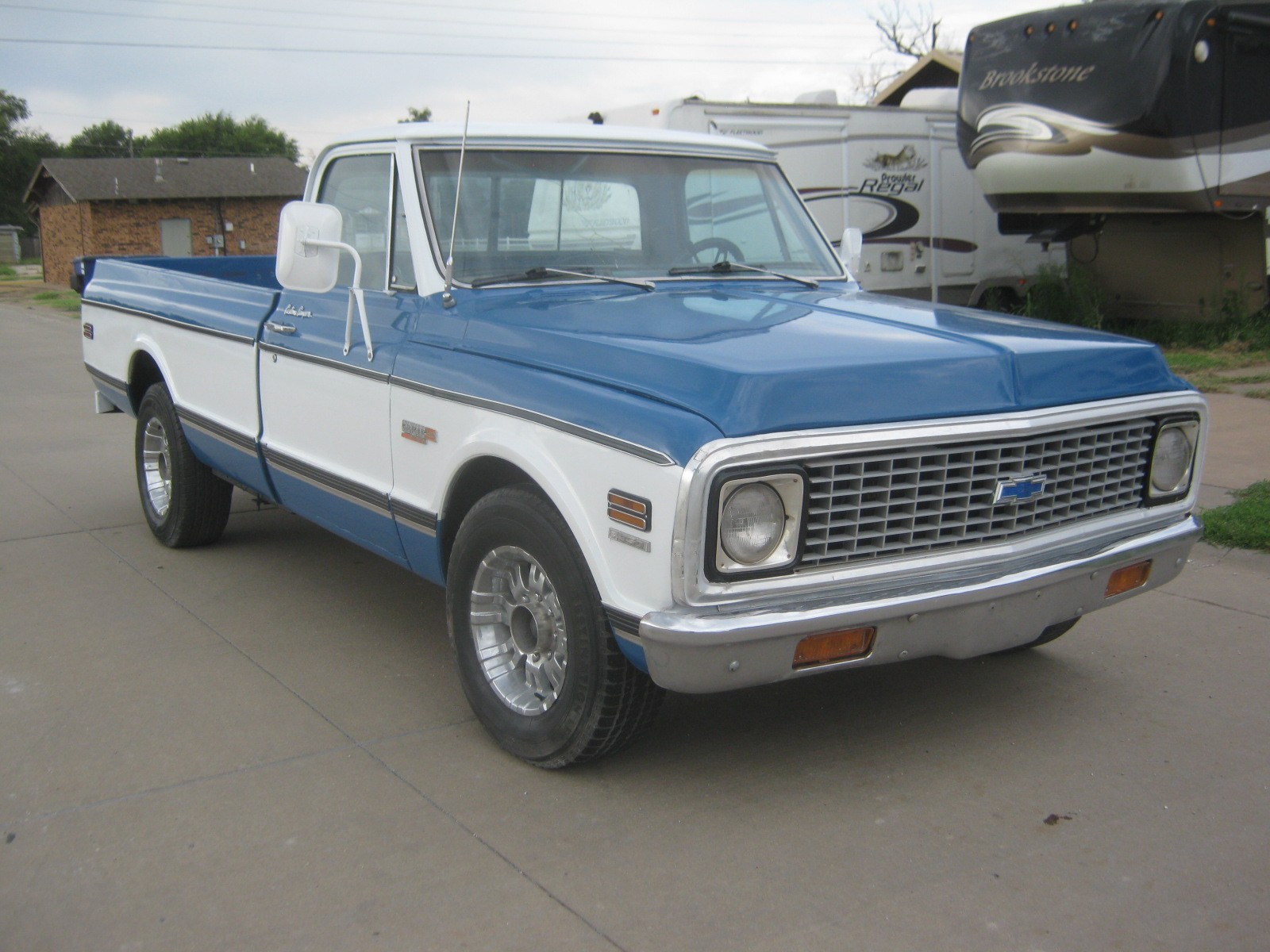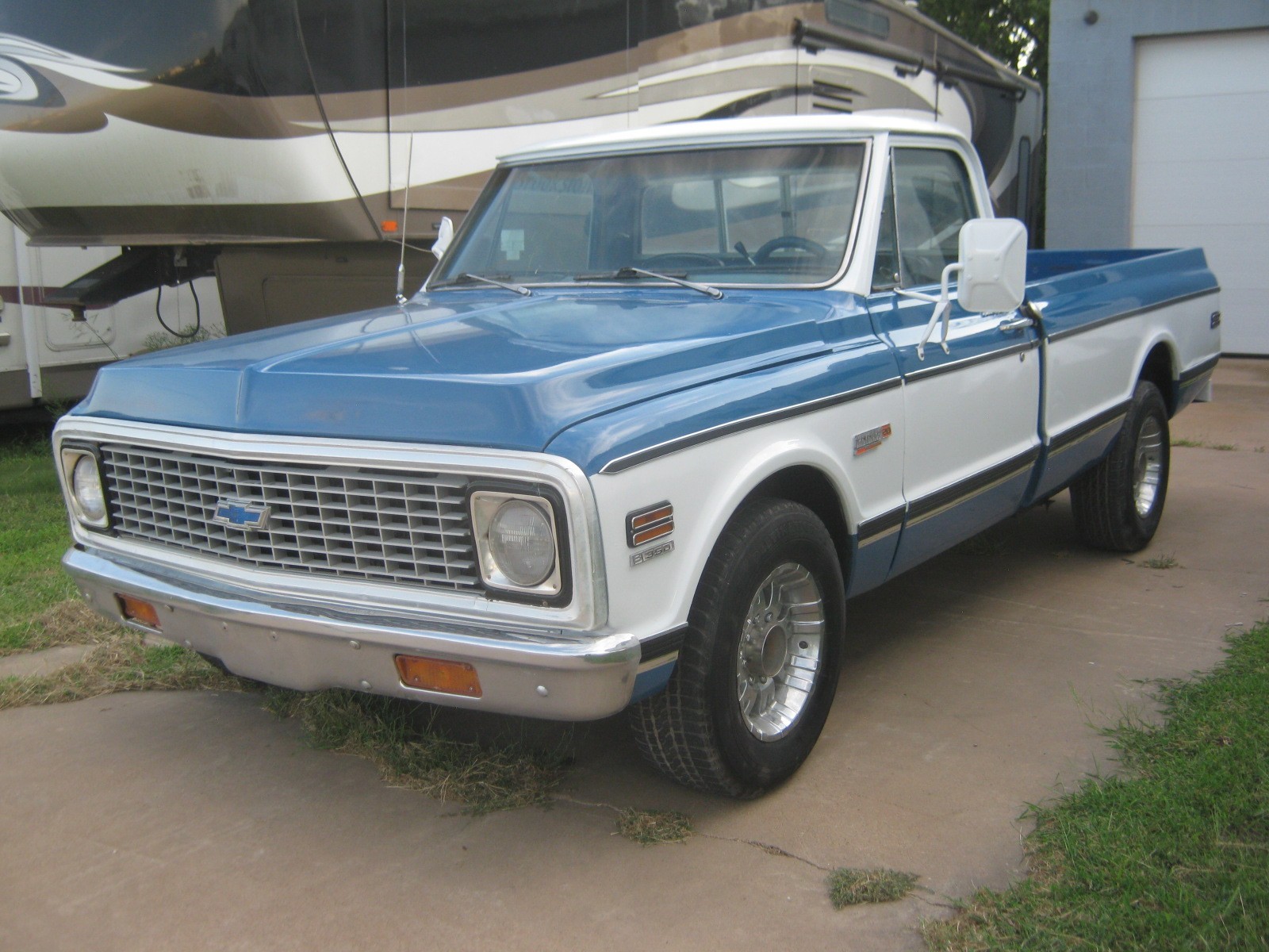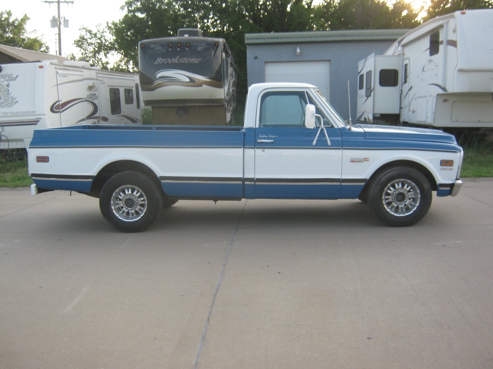 1972ChevyC20 Cheyenne Super Custom Camper. Has Power Steering,Power Brakes with disc up front, Air Conditioning,Bucket Seats with Console,Sliding Rear Window,showing 41K miles,I believe I'm the 3rd owner.I was told it had an overhead camper on it for the first 20 plus years of its life. The engine runs well with good oil pressure. It has a mild cam with a nice lope to the engine. The transmission has a shift kit installed. I was told all this was done back in the 70's when it had a camper on it and towing a boat for more power.The tailgate was replaced as the original one had a bend in it from being used as a porch when the camper was on it for 20+ years.It has 3 gas tanks,But I was told not to use the two saddle tanksas the have some very old gas in them.It still has a spare mounted under it.The truck is mainly original with some nice factory options.I got this as a partial trade for a 5th wheel travel trailer and have owned it for a short time., I never insured it, so I haven't driven it much.Please ask all your question you may have. I would also be happy to show it to anyone that want to inspect it or have it inspected.All this needs to be done before the end of the auction. I have a clean Oklahoma Title in my name.