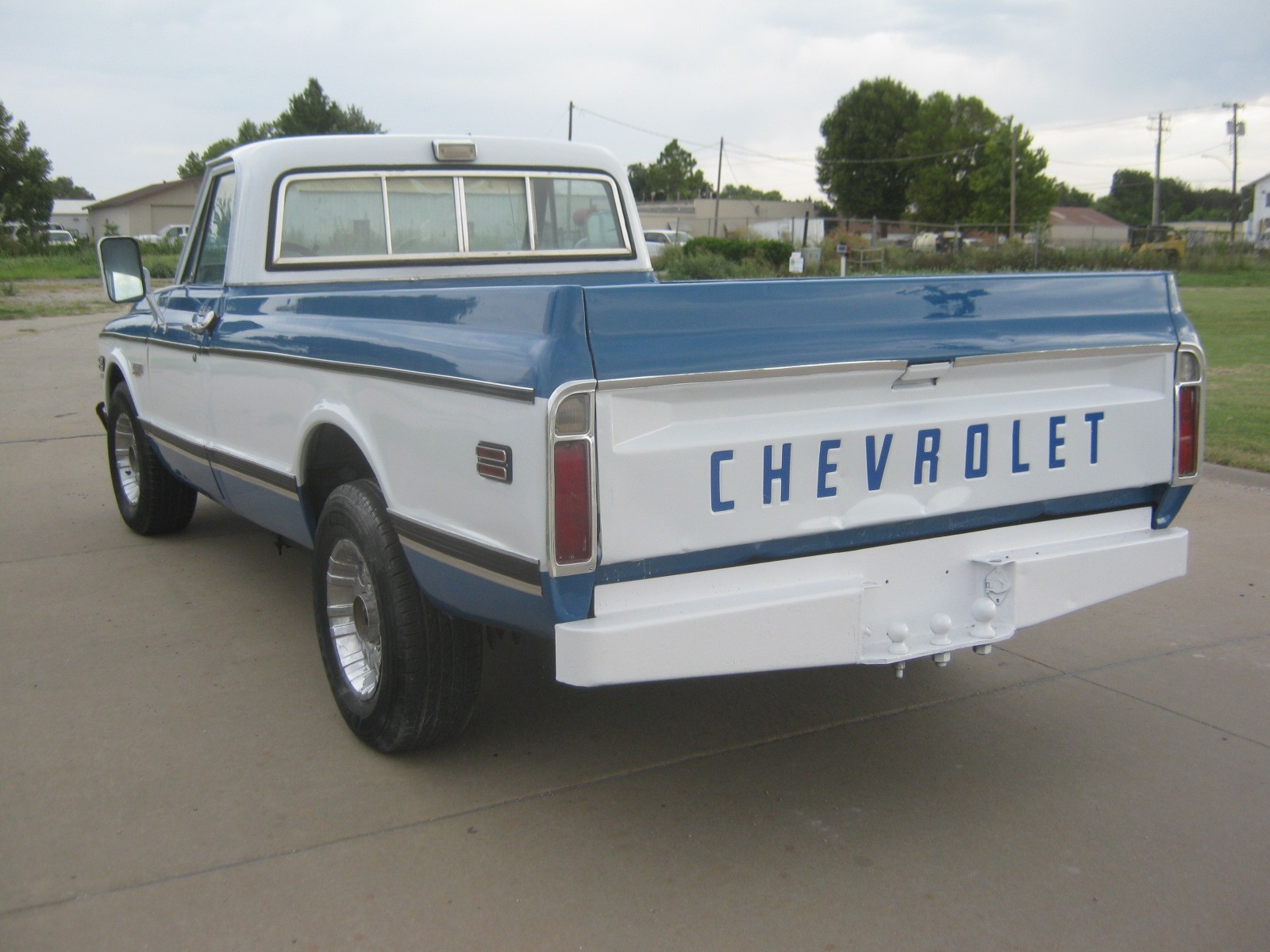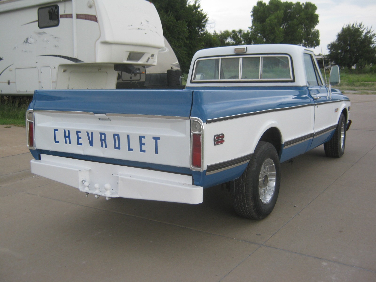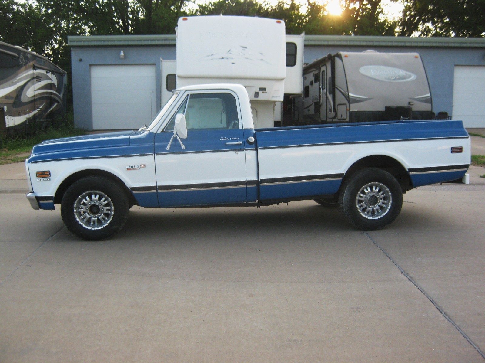 1972ChevyC20 Cheyenne Super Custom Camper. Has Power Steering,Power Brakes with disc up front, Air Conditioning,Bucket Seats with Console,Sliding Rear Window,showing 41K miles,I believe I'm the 3rd owner.I was told it had an overhead camper on it for the first 20 plus years of its life. The engine runs well with good oil pressure. It has a mild cam with a nice lope to the engine. The transmission has a shift kit installed. I was told all this was done back in the 70's when it had a camper on it and towing a boat for more power.The tailgate was replaced as the original one had a bend in it from being used as a porch when the camper was on it for 20+ years.It has 3 gas tanks,But I was told not to use the two saddle tanksas the have some very old gas in them.It still has a spare mounted under it.The truck is mainly original with some nice factory options.I got this as a partial trade for a 5th wheel travel trailer and have owned it for a short time., I never insured it, so I haven't driven it much.Please ask all your question you may have. I would also be happy to show it to anyone that want to inspect it or have it inspected.All this needs to be done before the end of the auction. I have a clean Oklahoma Title in my name.