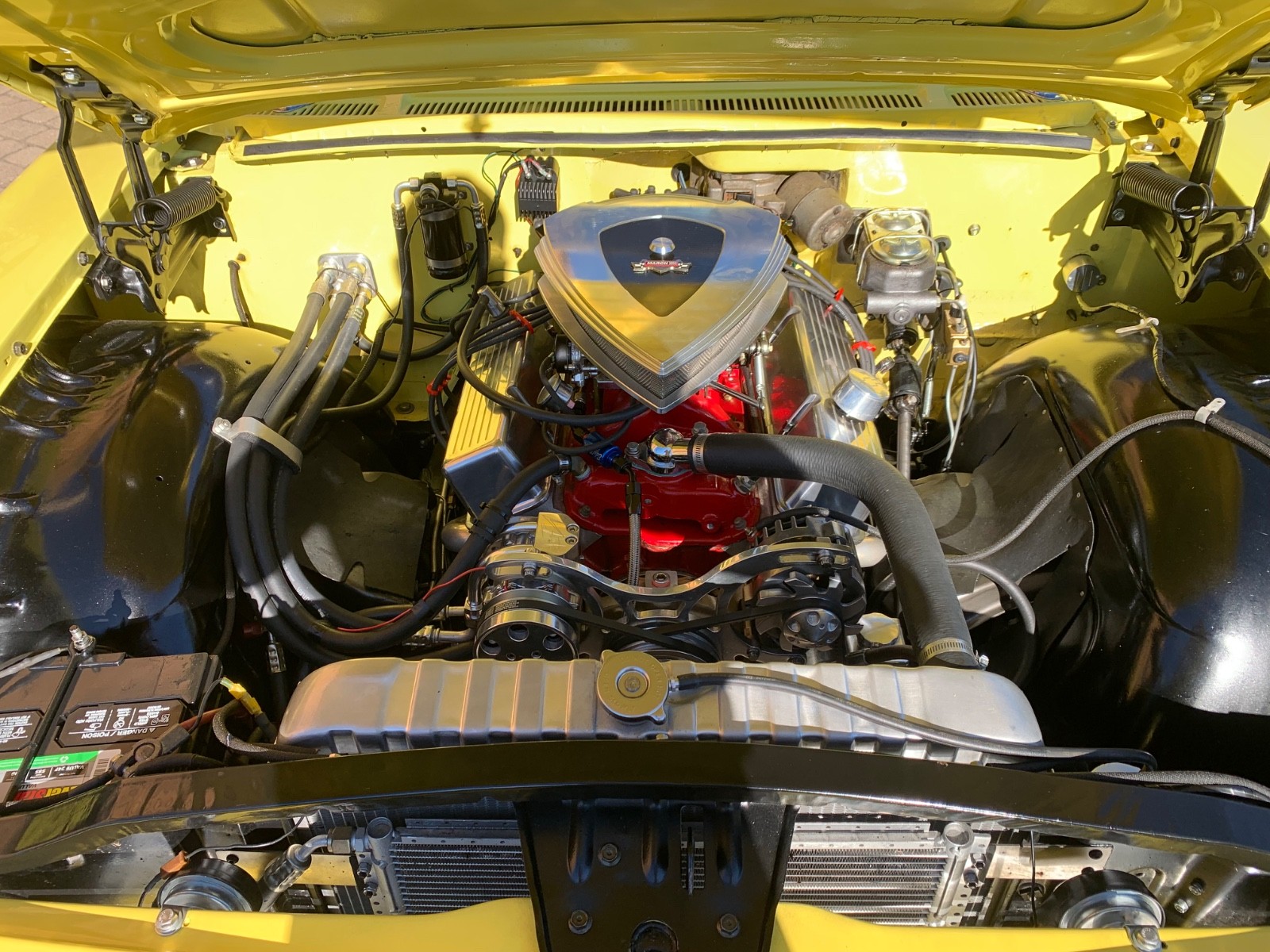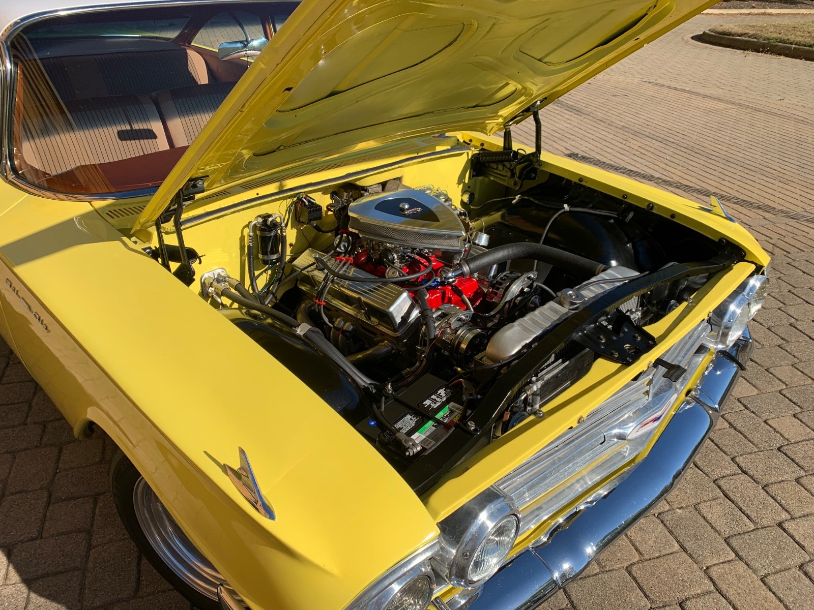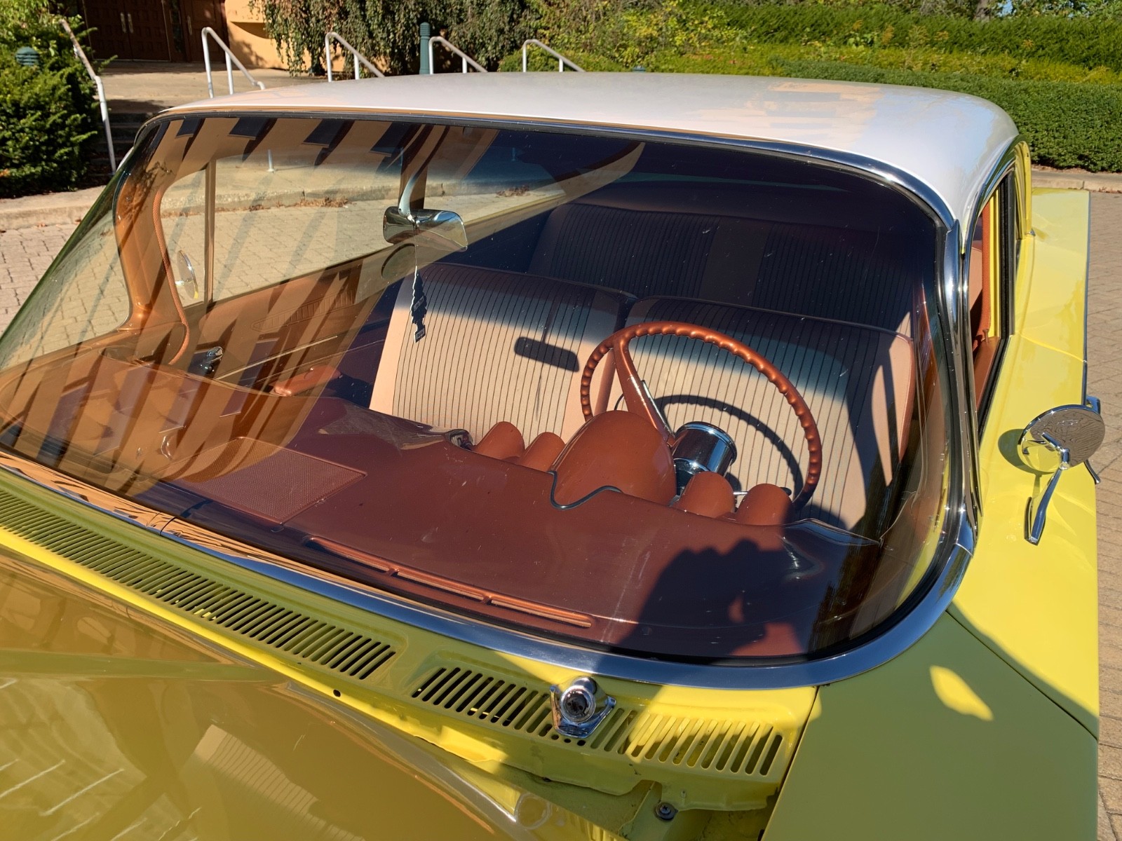 1960 Belair 2 door, 383 cubic inch V8, 5 Speed Tremec, 9” ford rearend posi.Yellow in color/White roof gorgeous tan/copper interior nicely finished.Fully restored, many new or refurbished parts.