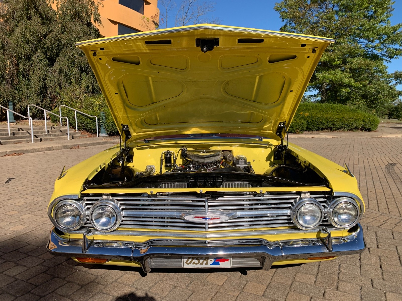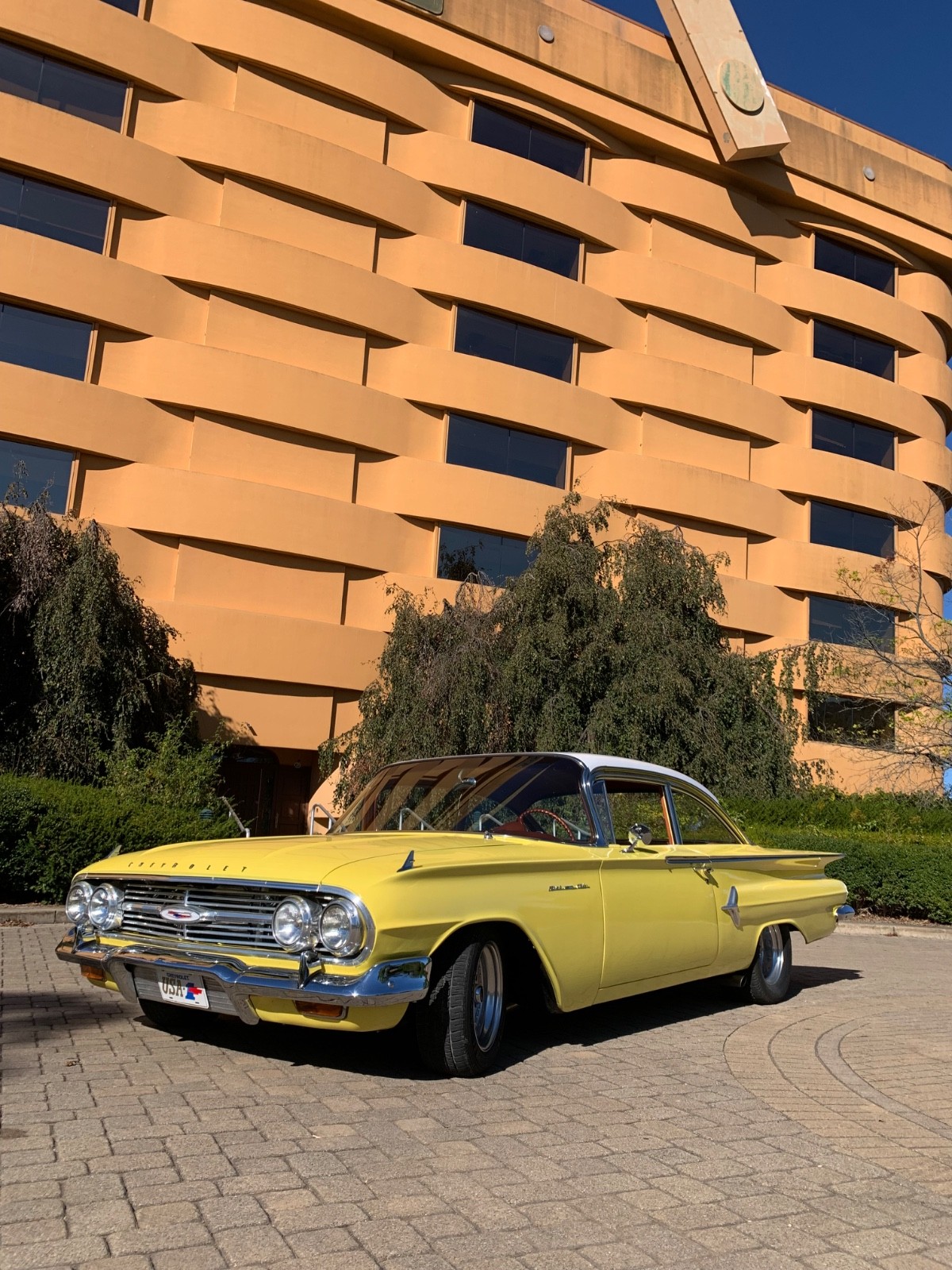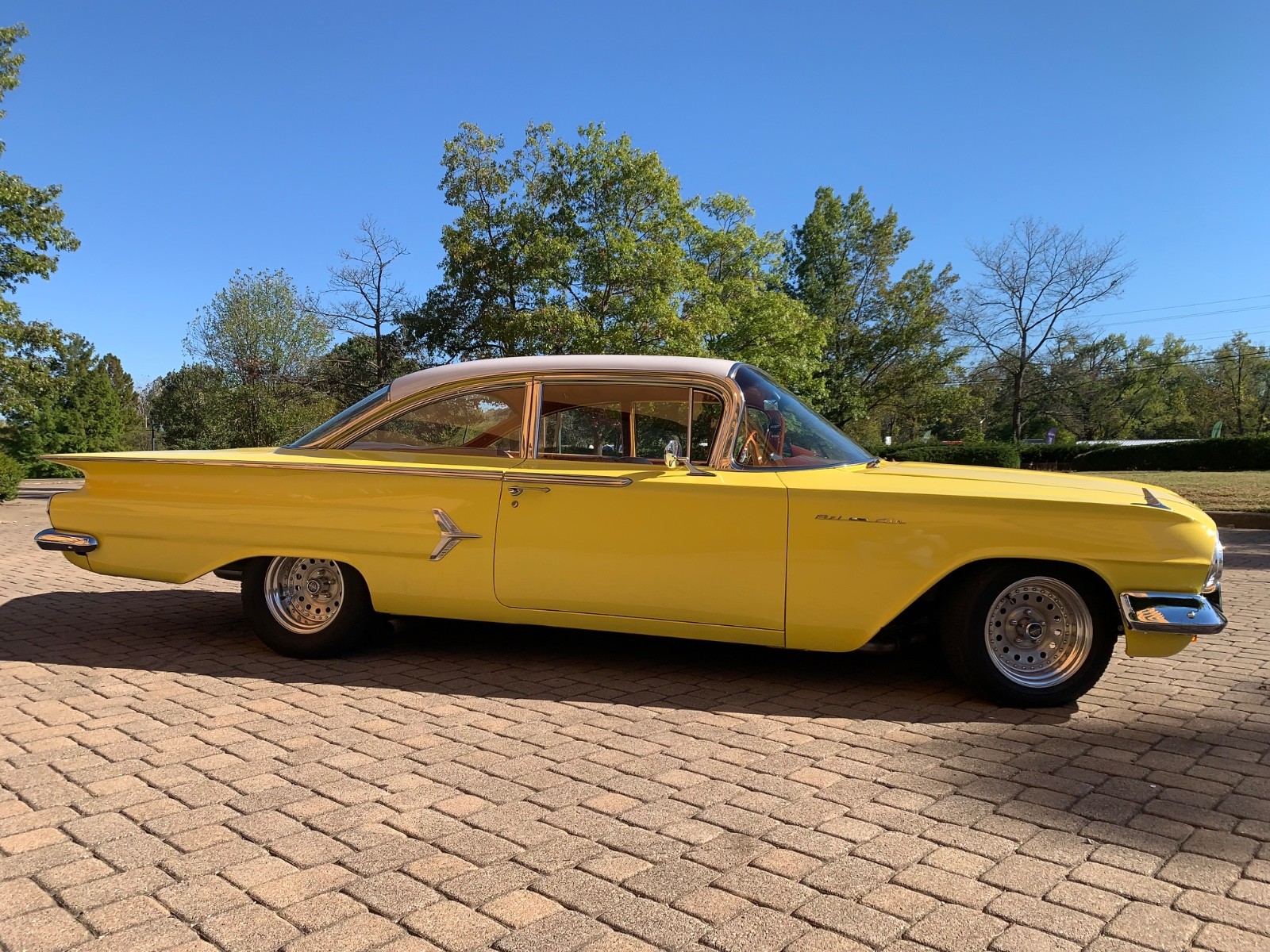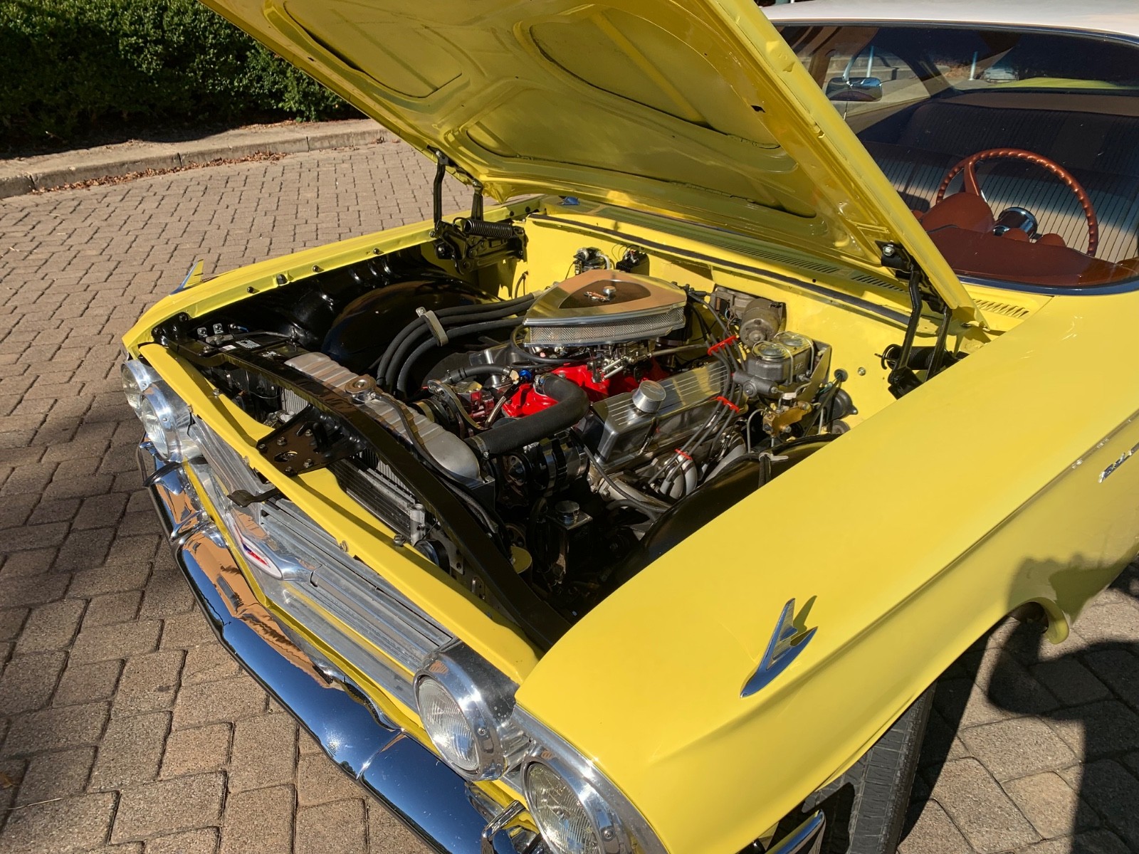 1960 Belair 2 door, 383 cubic inch V8, 5 Speed Tremec, 9” ford rearend posi.Yellow in color/White roof gorgeous tan/copper interior nicely finished.Fully restored, many new or refurbished parts.