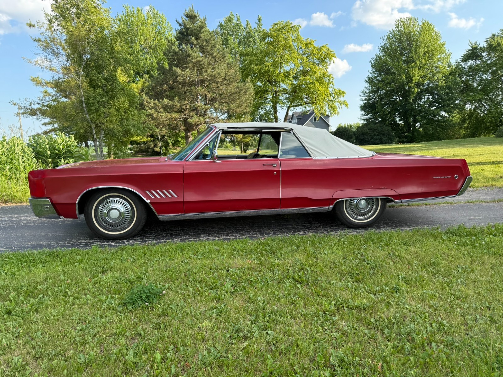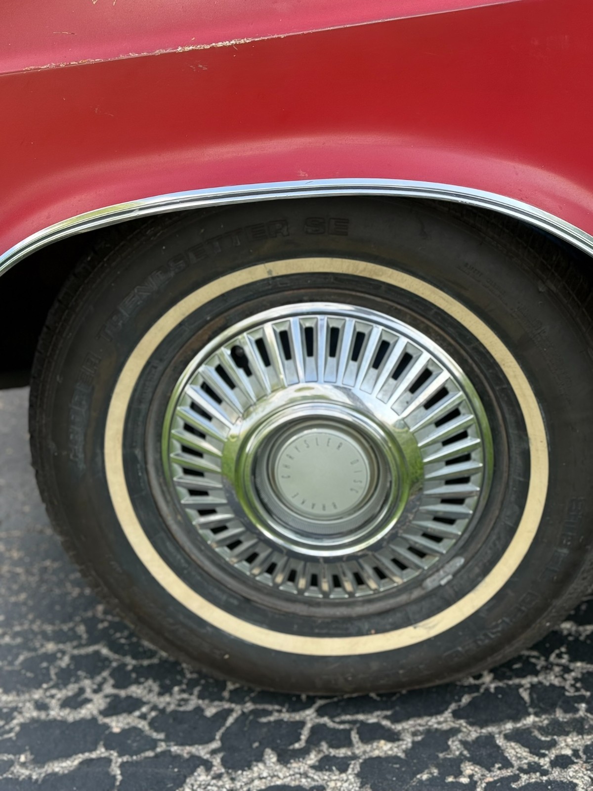 All the sheet metal is clean and very straight. I’ve owned many Mopar over the years and this one of the nicest original cars I’ve seen. Very solid body and frame. Very little rust. Truck pan is excellent. Paint appears to be original but shows normal age-related fading. All the chrome trim moldings are present – not perfect but very presentable. Bumpers are original chrome and shine up great! This car still has its original factory 15” wheel covers. The flip headlights work great! 3 of the 4 power windows work. One rear window needs a motor (NOS replacement power window motor is included in the sale). The convertible top opens and retracts smoothly without any issues. The white top currently on the car will need replacing. A new black top kit and glass back window will be included with the car. This car is 99% factory original. It was born a factory red car. Body panels are extremely clean, straight and solid.