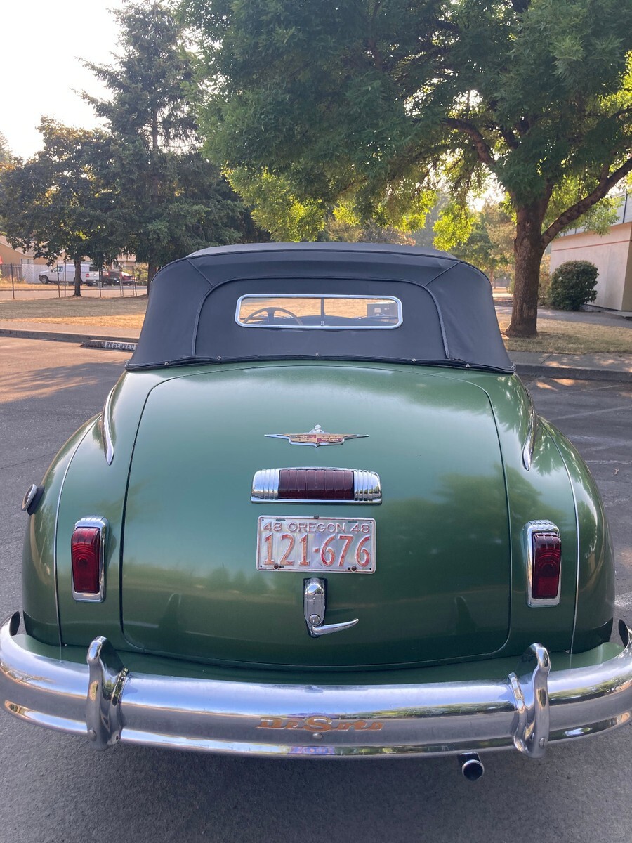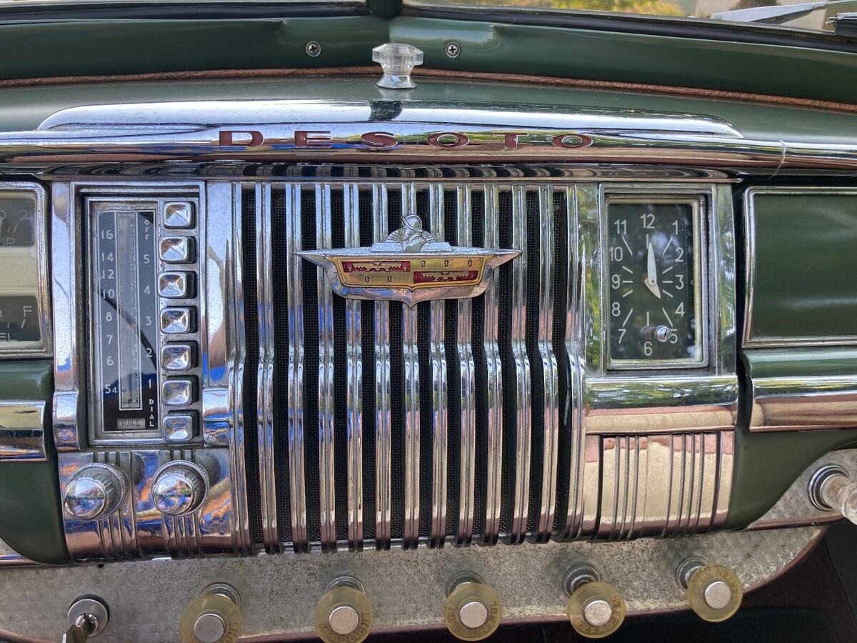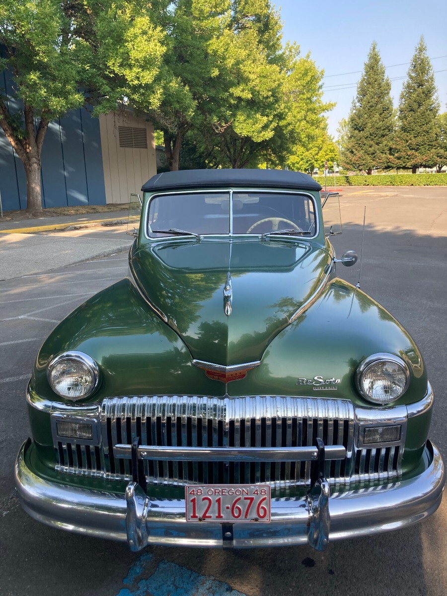This is a 1948 DeSoto Custom Convertible. It is a beautiful and mostly original, unmolested car that was owned by one California family for 73 years. Originally bought by a woman in Modesto, California in 1948, it was handed down to her granddaughter, then her great-grandson and was in the family until I purchased the car in 2021. It has been in California its entire life until her great-grandson obtained the car in recent years and kept it in Portland, Oregon. I have photos of the car with the original owner and her family, showing the black California license plates that were the last plates on the car when she owned it. The plates are included. The car is currently in non-op status and just driven around my rural property occasionally. I have a clear California title in my name. It was repainted in the original Andante Green in 1985. It looks great but there are some small chips and flaws here and there. At some point the front seat lower cushion was reupholstered in a material close to the original. Otherwise the interior is original as is the top boot. The original chrome is shiny and looks nice but there are some areas that have light pitting. The doors and trunk fit perfectly and open and close well. The windows roll up and down nicely and the original window and door handles are in great condition. The only items I have replaced are new old stock gearshift and turn signal knobs.This car starts easily and runs smoothly and quietly. It drives, steers and stops as it should. A new battery was just installed. The top works well as do the headlights, turn signals, wipers, horn, etc. Clock and radio do not work. The original owner's great-grandson told me that the engine was rebuilt in the late 1970's. The engine runs great but it does smoke when you are on a downhill grade with your foot off the gas. The four speed semi-automatic Fluid Drive transmission works very well, shifting smoothly and automatically up and down in each range as it should. A manual choke has been added which is operational.The prior owner said the odometer stopped working at 53K miles and he estimated that it now has about 65K miles. Recently the speedometer made noise and may be inoperable. Not sure if it's the speedometer or cable or both. Included is a new old stock speedometer cable. Also included are a new old stock headlight switch since the switch in the car was sticky, and a new old stock gas sending unit since the gauge is not working.