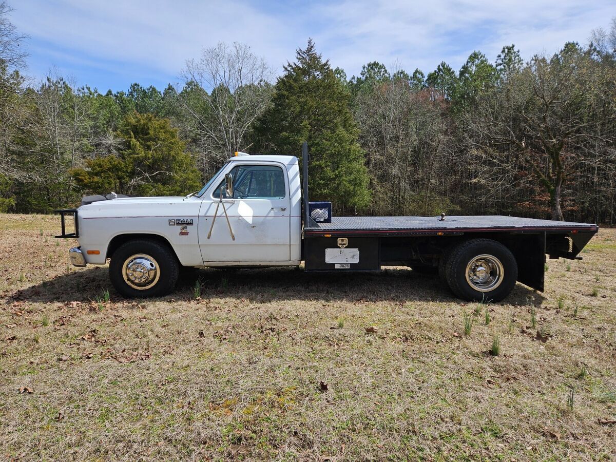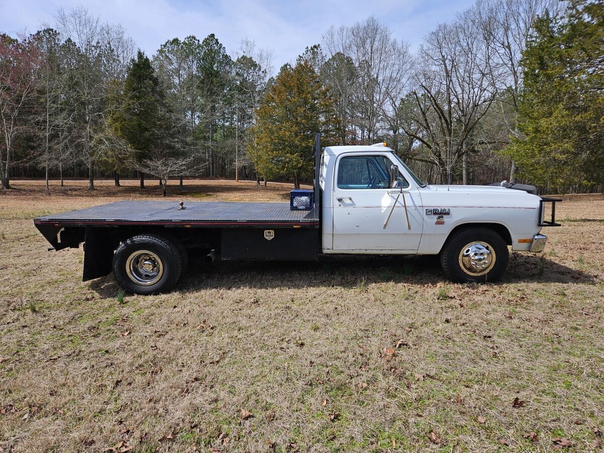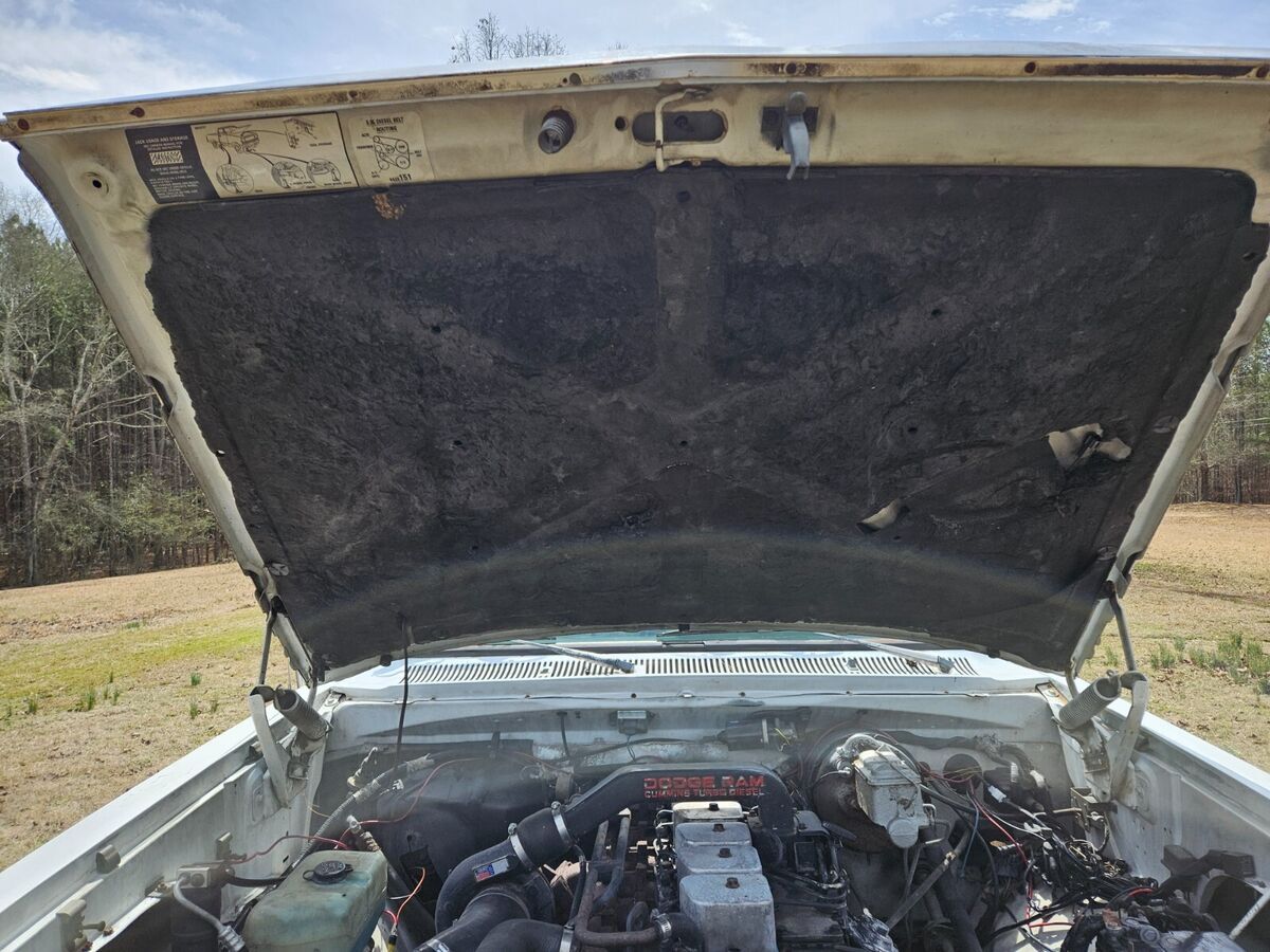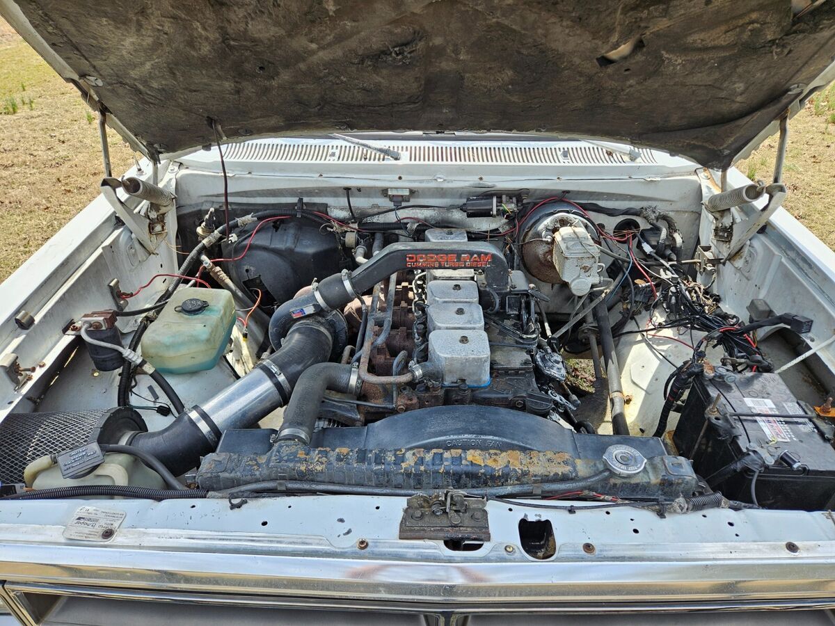 Classic first-gen, first-year Cummins Diesel Ram. Highly original, relatively well cared for flatbed truck. Bought in MO in early 2023, however it has been largely unused and has sat idle since. The truck is in good shape for its age. Engine starts and runs well, transmission shifts properly. Odometer and speedometer don't work; true mileage unknown (TMU). Dash coolant temperature gauge and under-dash oil pressure gauge both work. Floor carpet is missing. Blower motor inoperative, unsure if heat and A/C work. Emergency brake cables need replacement. Good basic work truck, but an excellent restoration project truck. Titled only with no registration in storage; it's only occasionally driven a few miles locally. Clean title in-hand. Being sold as-is. Seller can assist in flatbed delivery for a fee if/as negotiated.