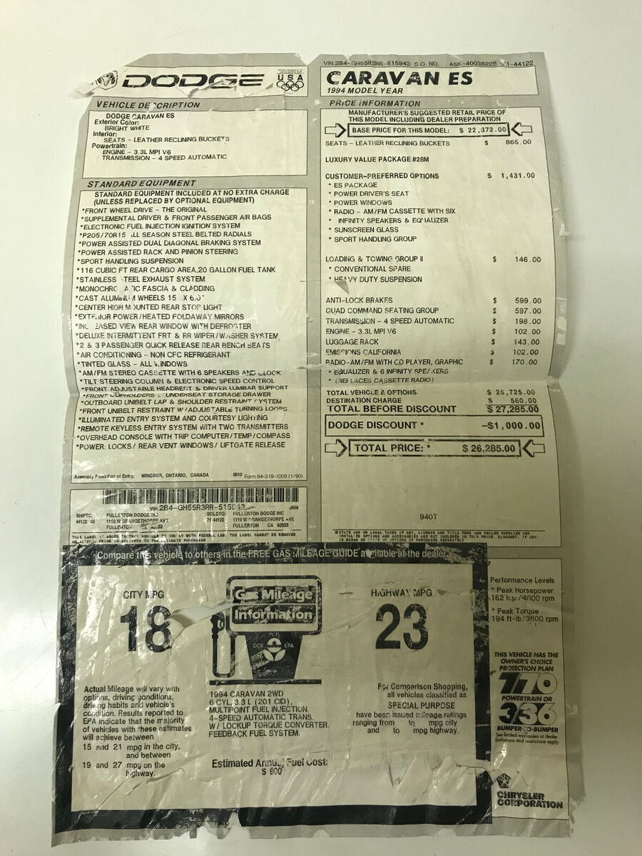 1994 Dodge Caravan ESOriginal owner since newCalifornia MinivanPlease read full description-I'll be happy to answer any questions.PAYMENTS: I only accept only approved eBay payments. I ask that all bidders will please make payment within (10) days for U.S. customers, (14) days for overseas...unless prior arrangements are made.CHECK OUT MY OTHER ITEMS FOR SALE THIS WEEK!