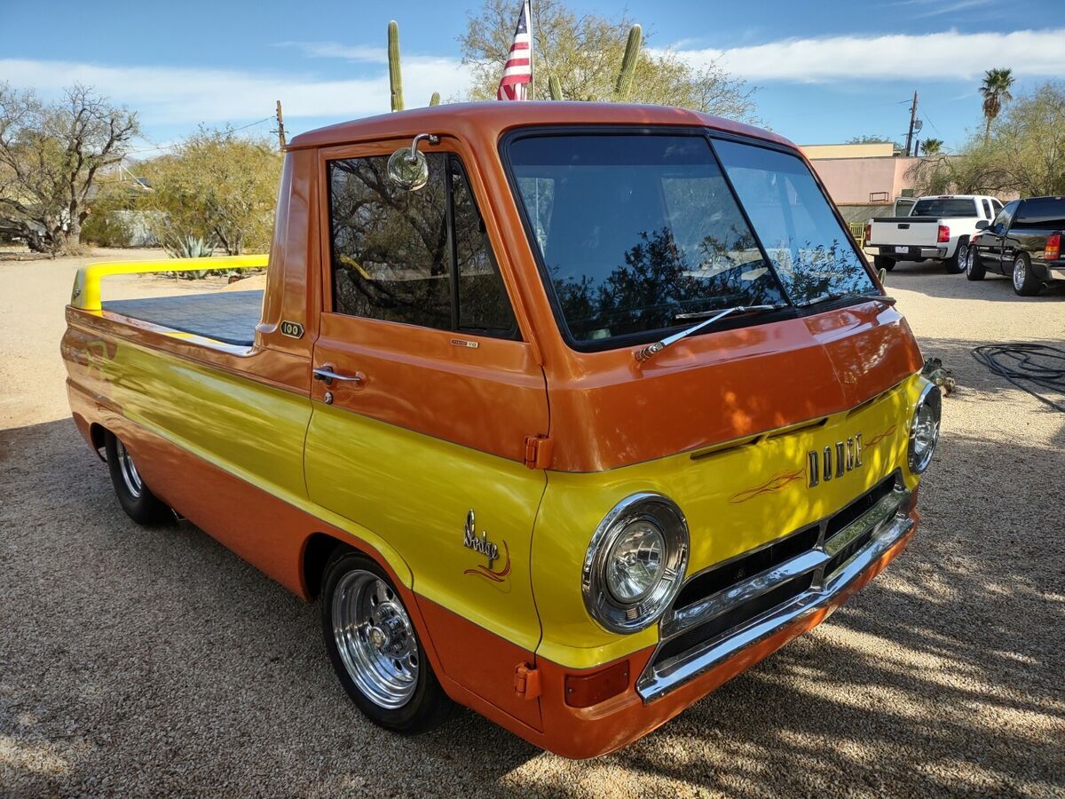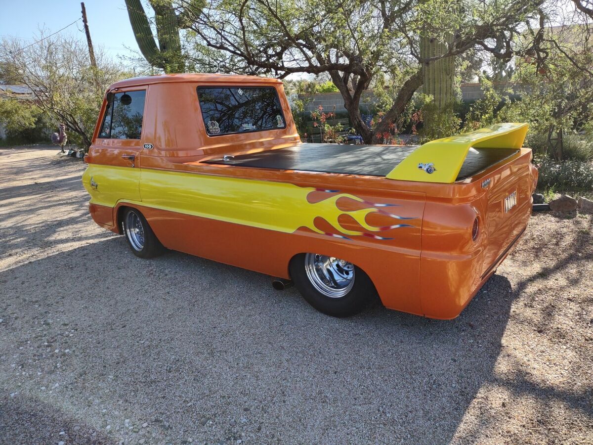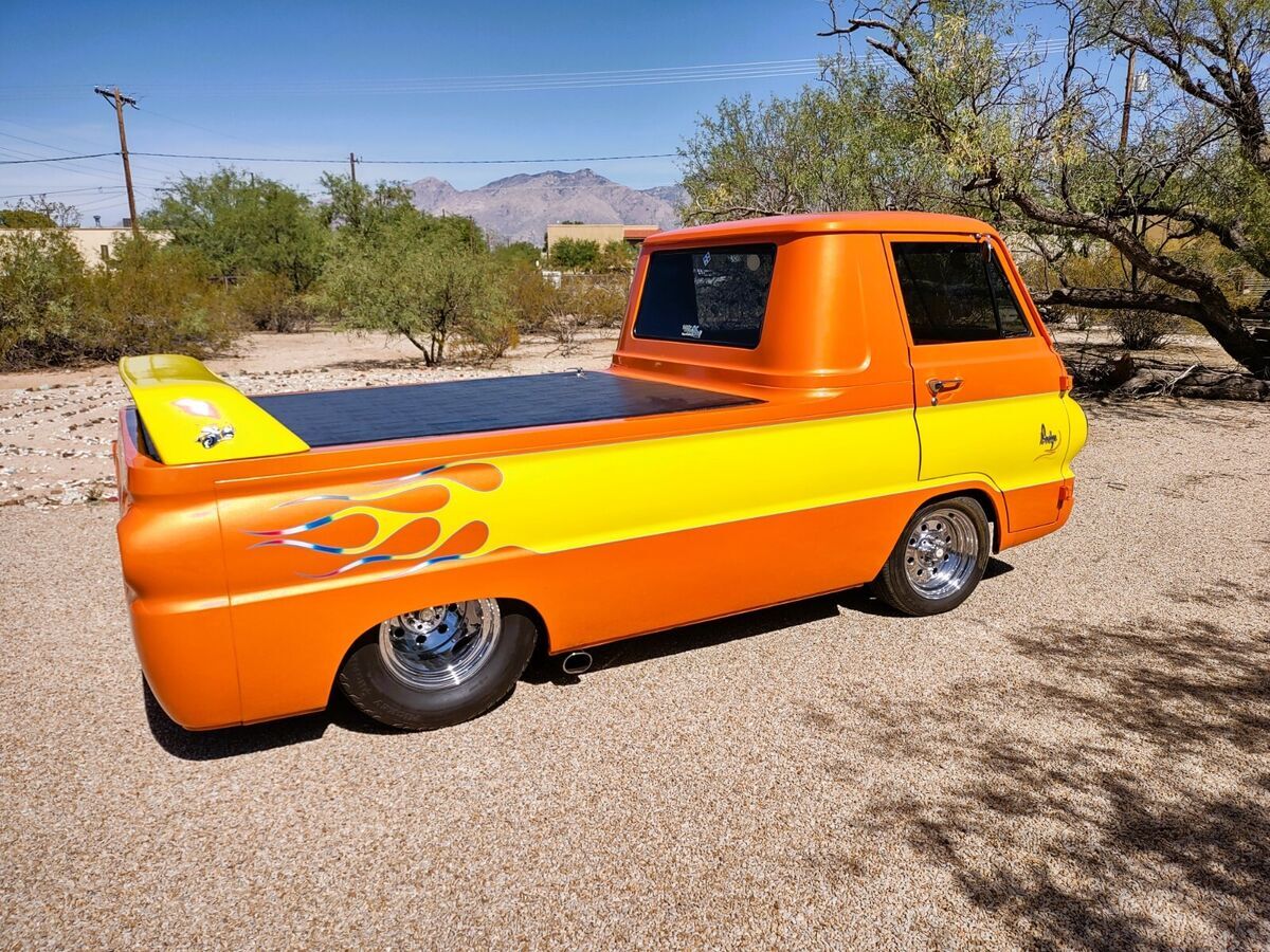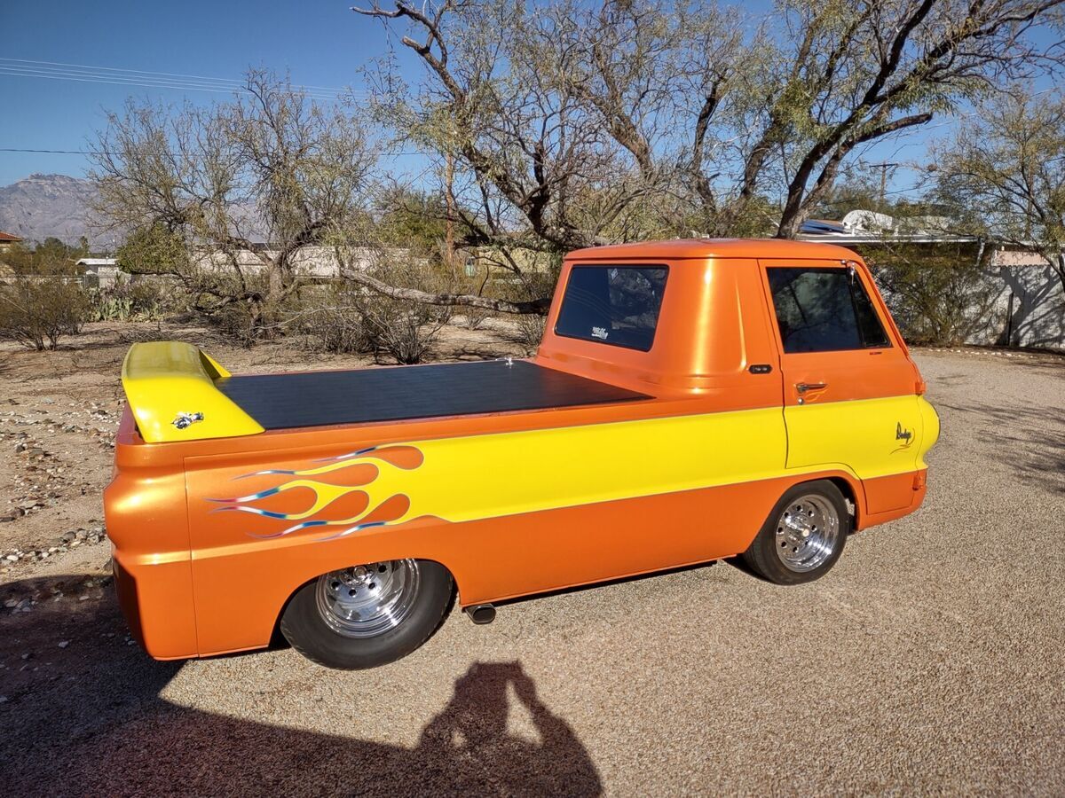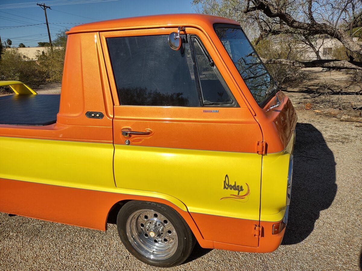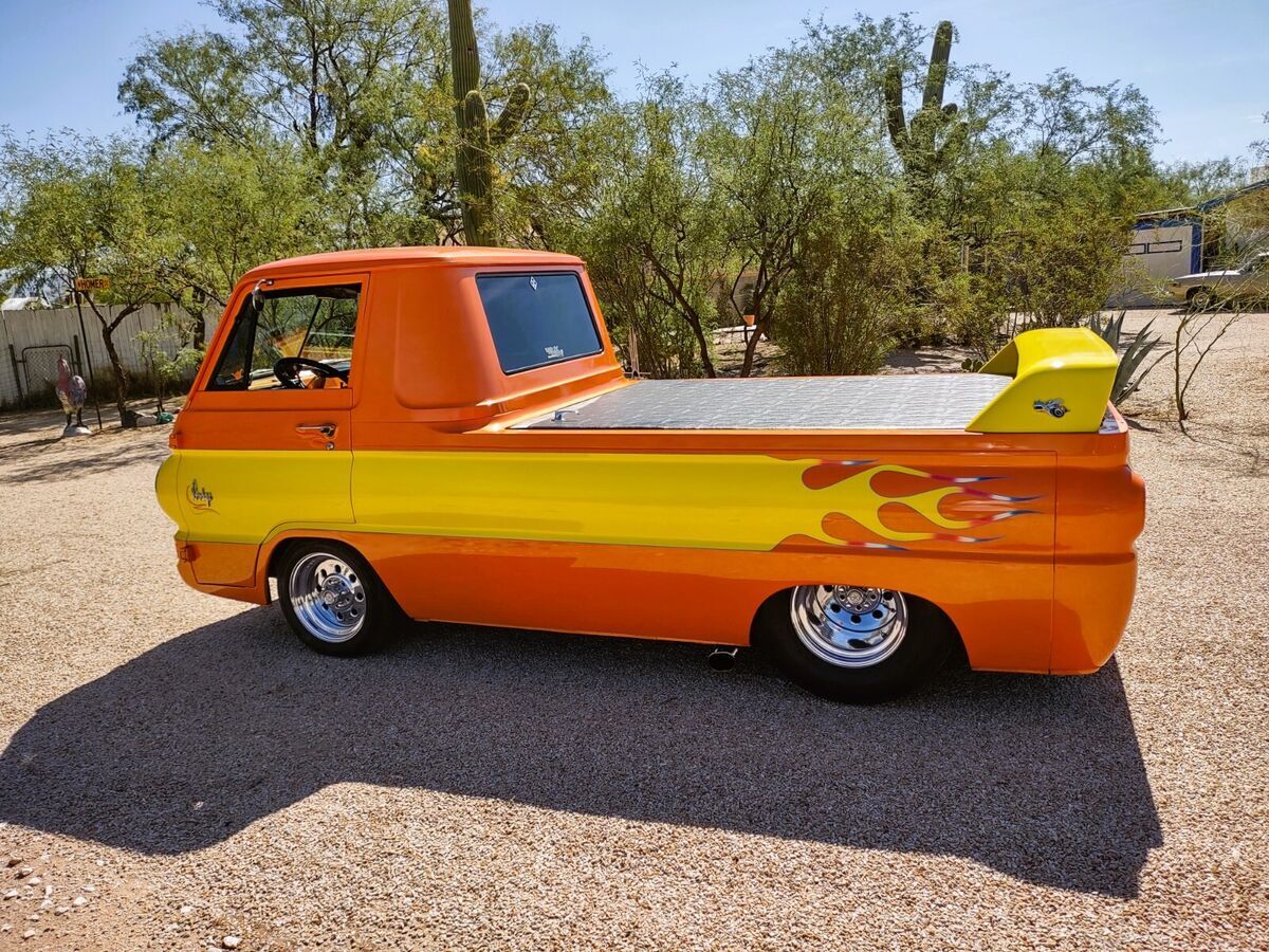 Please read the full description below.I purchased this A100 nearly 2 years ago from the builder (ex-Drag Racer) that took about 5 years to complete.Medical problems are the reason to sell.1st time ever on Ebay for sale.I've only driven this truck to local car shows / club meetsIt is not a race truck although it looks like one.It is tight & fast.1968 Dodge A100 One of a kind Custom built show truckCustom Painted Tangerine and Yellow with Flames (painted not decals)Hand custom pinstriped.Chrome Grill / Chrome aluminum Headlight bezels.All bright trim is rust free / pit free.New Windshield and gasketsFeaturing a Pro built Magnum 360 C.I.V8 -Holly Double pumper 4 bbl. carb. Exhaust Headers to nicely sounding turbo style mufflers exiting in front of the rear wheels.Rebuilt A727 3 spd. Automatic transmission with factory dash mounted Shift lever.Has Aftermarket working Air ConditioningAluminum radiator with both motor pully fan and electric pusher fan to keep the motor cool.Has a custom fresh air intake to the radiator under the center interior podSeparate Transmission oil coolerFord 9" rear axle assembly with rear Disc brakes.Straight axle front end with disc brakesThe Factory instrument cluster is in-op except for lights & turn indicators. All gages including gas gage are in the center pod.Speedometer is read in the GPS unit to the left of steering wheel.Has a back-up camera also.AM-FM Cd player for sounds.Full finished off interior with Tinted glass and 3 point Shoulder seat belts.This truck is Tubbed and has an Air bagged suspension.Compressor and Air tank located in the bed with controls at the steering column.Rolls on Polished Weld Brand Aluminum 15" wheels with (195/80R/15-front) Mickey Thompson Sportsman Rears 15 x16" wide tiresAn aluminum Fuel Cell in the bed as is the battery.A permanent tonneau cover tops off the bed with the front 1/3 as the access opening that locks.The tail gate no longer functions as a gate.Has Custom lights with LED tail lamps and full LED strip as brake lights and Turn signal lights.The Wing at the rear is from a late model SRT Dodge pickup that fits like it was made for this truck.If you are the winning bidder :Down payment must be sent within 48hrs.Balance to be paid within 7days.Free and Clear / clean AZ title in my name.5 ** two ** zeroFour / two 9Three 2 one 1NO OUT OF COUNTRY BIDDERS / NO OUT OF U.S. CHECKS-MOsI DO NOT use Ebay Secure payment process.Payment arrangement made directly to myself by US Certified Bank check / US. Bank Wire Transfer /or Of course CASH.Found 1 other A100 listed on Ebay today at Streetside Classics in Charlotte NC1964 A100 Listed at $65,000.00