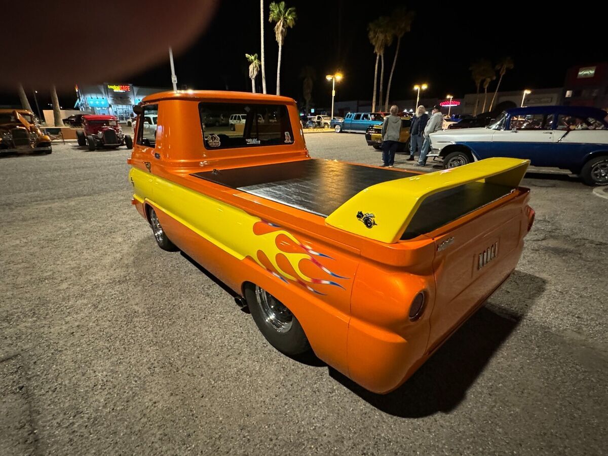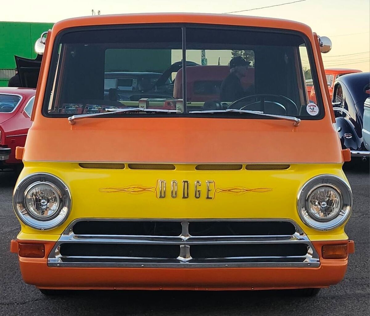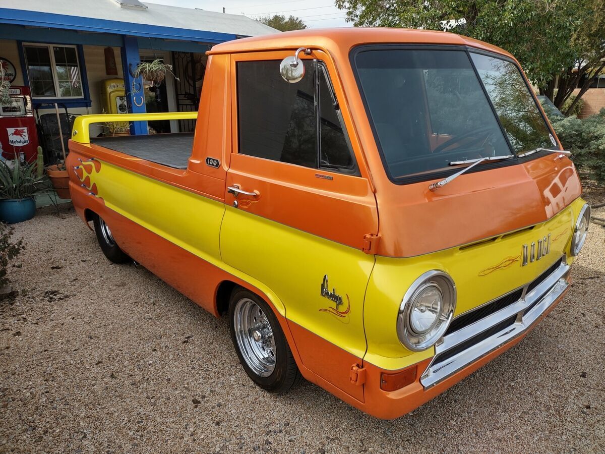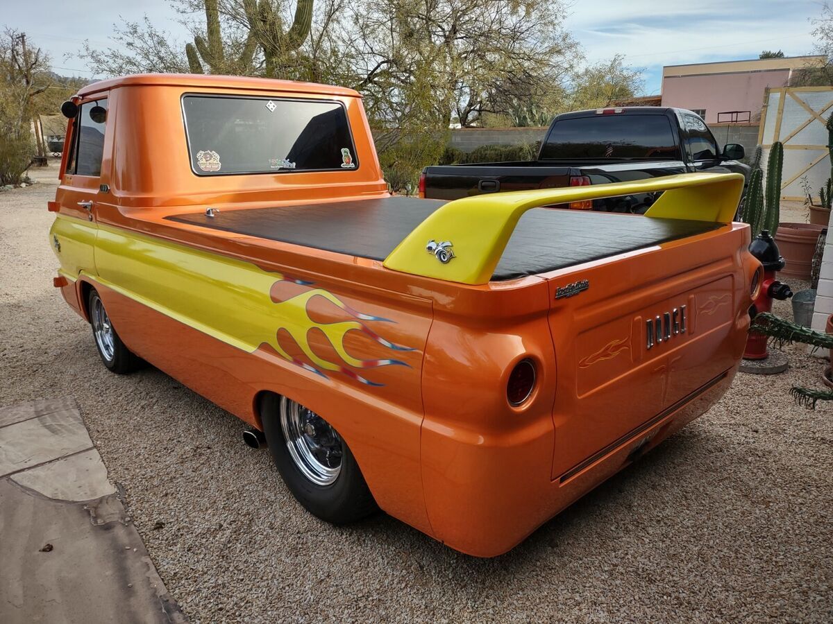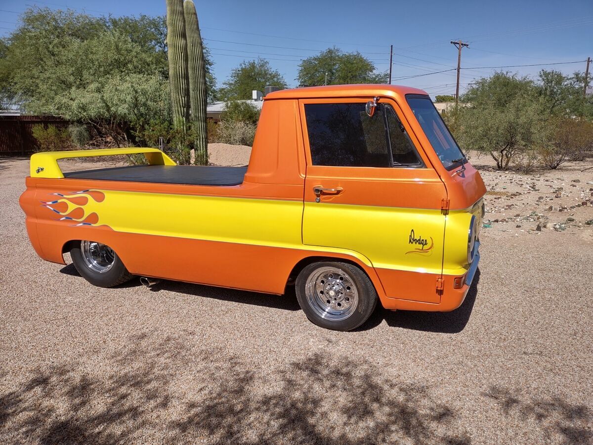 Please read the full description below.I purchased this A100 nearly 2 years ago from the builder (ex-Drag Racer) that took about 5 years to complete.Medical problems are the reason to sell.1st time ever on Ebay for sale.I've only driven this truck to local car shows / club meetsIt is not a race truck although it looks like one.It is tight & fast.1968 Dodge A100 One of a kind Custom built show truckCustom Painted Tangerine and Yellow with Flames (painted not decals)Hand custom pinstriped.Chrome Grill / Chrome aluminum Headlight bezels.All bright trim is rust free / pit free.New Windshield and gasketsFeaturing a Pro built Magnum 360 C.I.V8 -Holly Double pumper 4 bbl. carb. Exhaust Headers to nicely sounding turbo style mufflers exiting in front of the rear wheels.Rebuilt A727 3 spd. Automatic transmission with factory dash mounted Shift lever.Has Aftermarket working Air ConditioningAluminum radiator with both motor pully fan and electric pusher fan to keep the motor cool.Has a custom fresh air intake to the radiator under the center interior podSeparate Transmission oil coolerFord 9" rear axle assembly with rear Disc brakes.Straight axle front end with disc brakesThe Factory instrument cluster is in-op except for lights & turn indicators. All gages including gas gage are in the center pod.Speedometer is read in the GPS unit to the left of steering wheel.Has a back-up camera also.AM-FM Cd player for sounds.Full finished off interior with Tinted glass and 3 point Shoulder seat belts.This truck is Tubbed and has an Air bagged suspension.Compressor and Air tank located in the bed with controls at the steering column.Rolls on Polished Weld Brand Aluminum 15" wheels with (195/80R/15-front) Mickey Thompson Sportsman Rears 15 x16" wide tiresAn aluminum Fuel Cell in the bed as is the battery.A permanent tonneau cover tops off the bed with the front 1/3 as the access opening that locks.The tail gate no longer functions as a gate.Has Custom lights with LED tail lamps and full LED strip as brake lights and Turn signal lights.The Wing at the rear is from a late model SRT Dodge pickup that fits like it was made for this truck.If you are the winning bidder :Down payment must be sent within 48hrs.Balance to be paid within 7days.Free and Clear / clean AZ title in my name.5 ** two ** zeroFour / two 9Three 2 one 1NO OUT OF COUNTRY BIDDERS / NO OUT OF U.S. CHECKS-MOsI DO NOT use Ebay Secure payment process.Payment arrangement made directly to myself by US Certified Bank check / US. Bank Wire Transfer /or Of course CASH.Found 1 other A100 listed on Ebay today at Streetside Classics in Charlotte NC1964 A100 Listed at $65,000.00