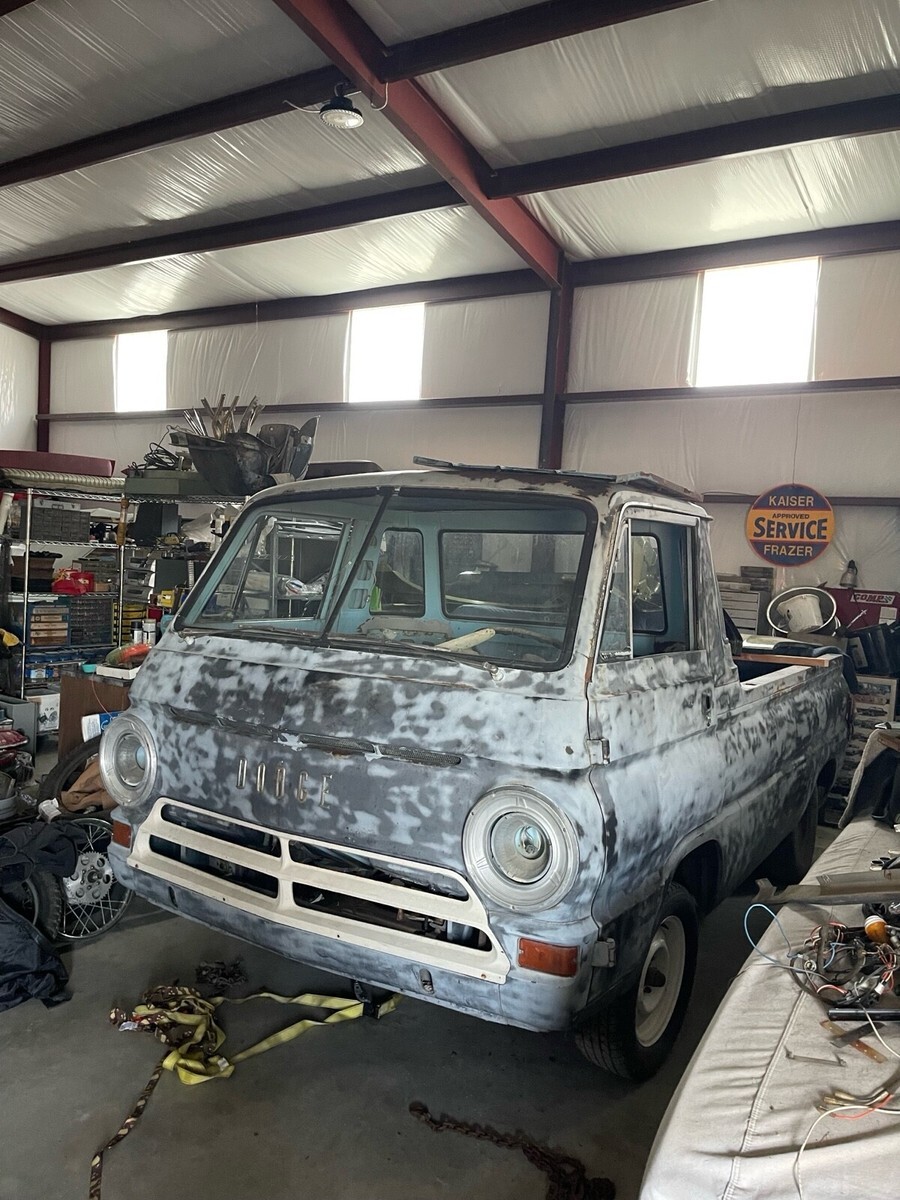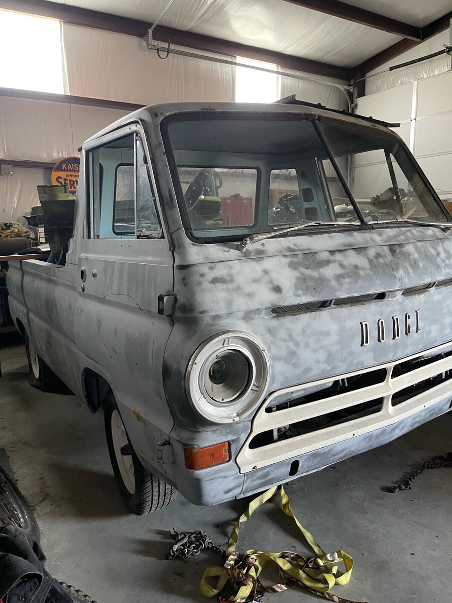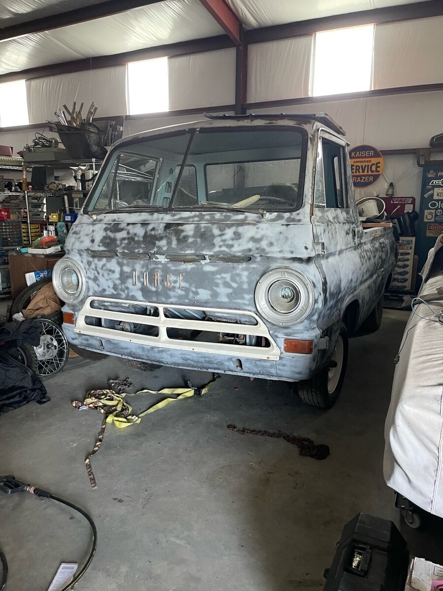 The truck was originally a six cylinder with a three speed manual transmission a conversion to a dash shifted automatic has been started. The truck comes with a running, low mileage 318 engine from a 1969 A-100 camper. The transmission is an original 727 automatic, designed for this truck and is from the same donor vehicle. the engine transmission will be securely stored in the back of the truck for transportation.