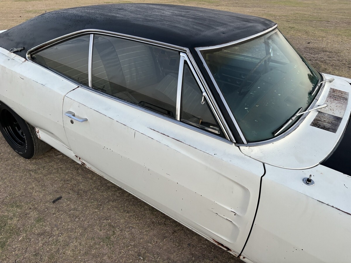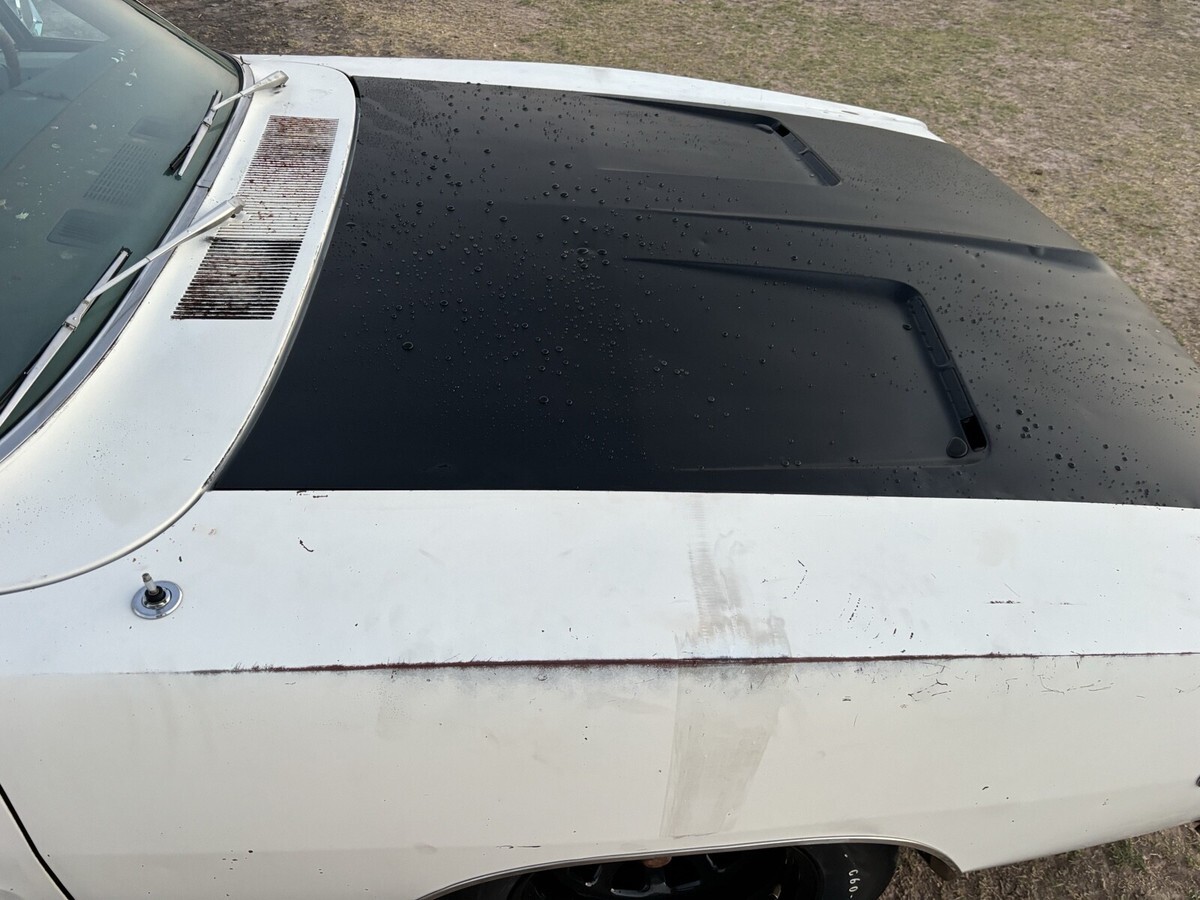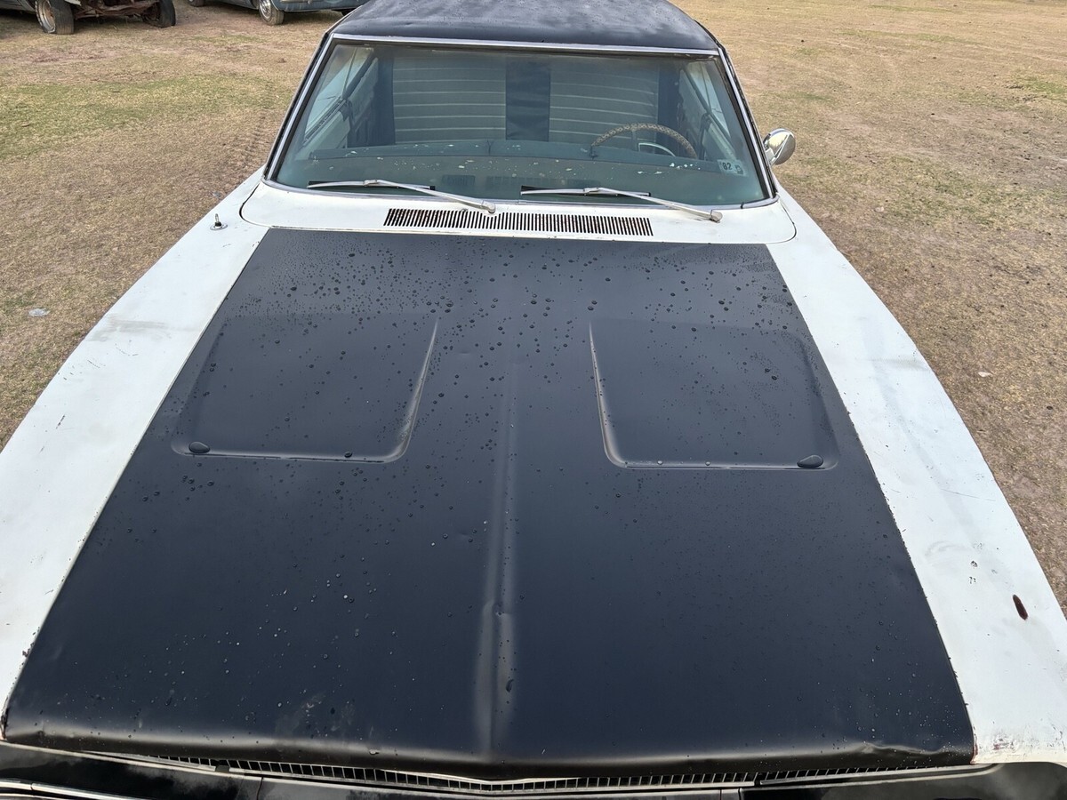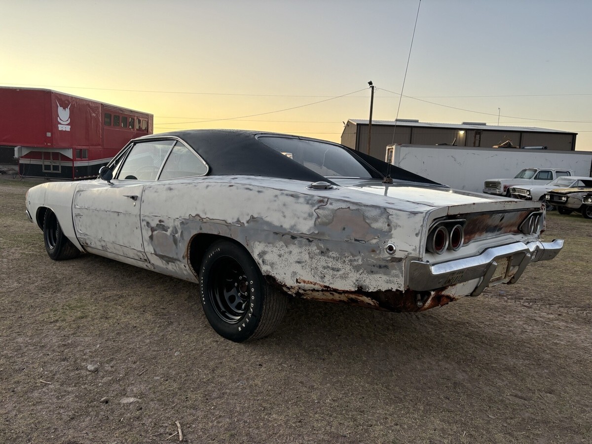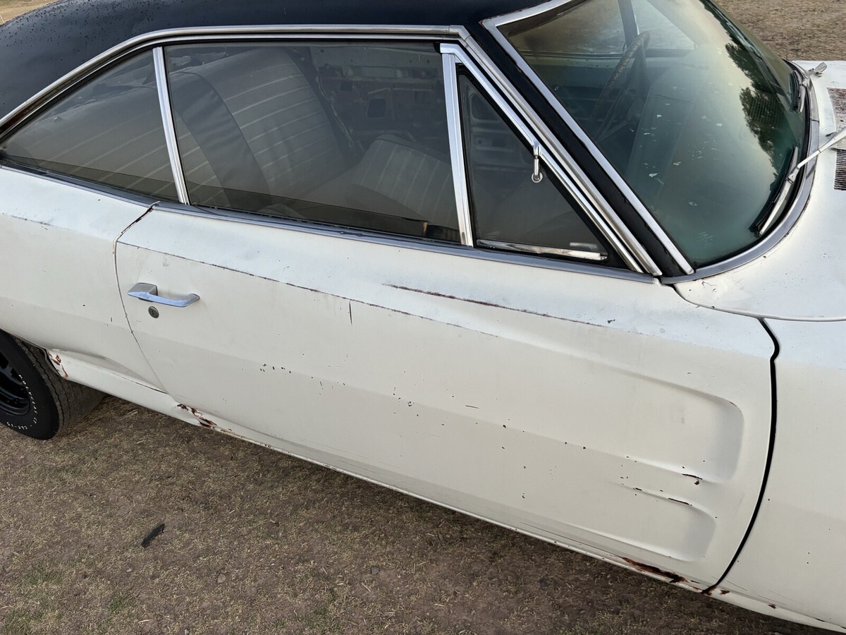 Was originally a vinyl top, and white car. No trim tag on the fender. No engine or trans but do have an extra 383 with trans I can throw in depending on deal. It does have nice seat, clean black interior trim, center consol, all the glass is there. Does have the usual rust spots from the charger, rust in bottom of rear quarters, needs full floor replacement. Crossmember is broken but I do have a new one for it. Will provide more pics over the weekend for those needing mor, thanks for looking. If the post is up it’s available Will come with another set of wheels