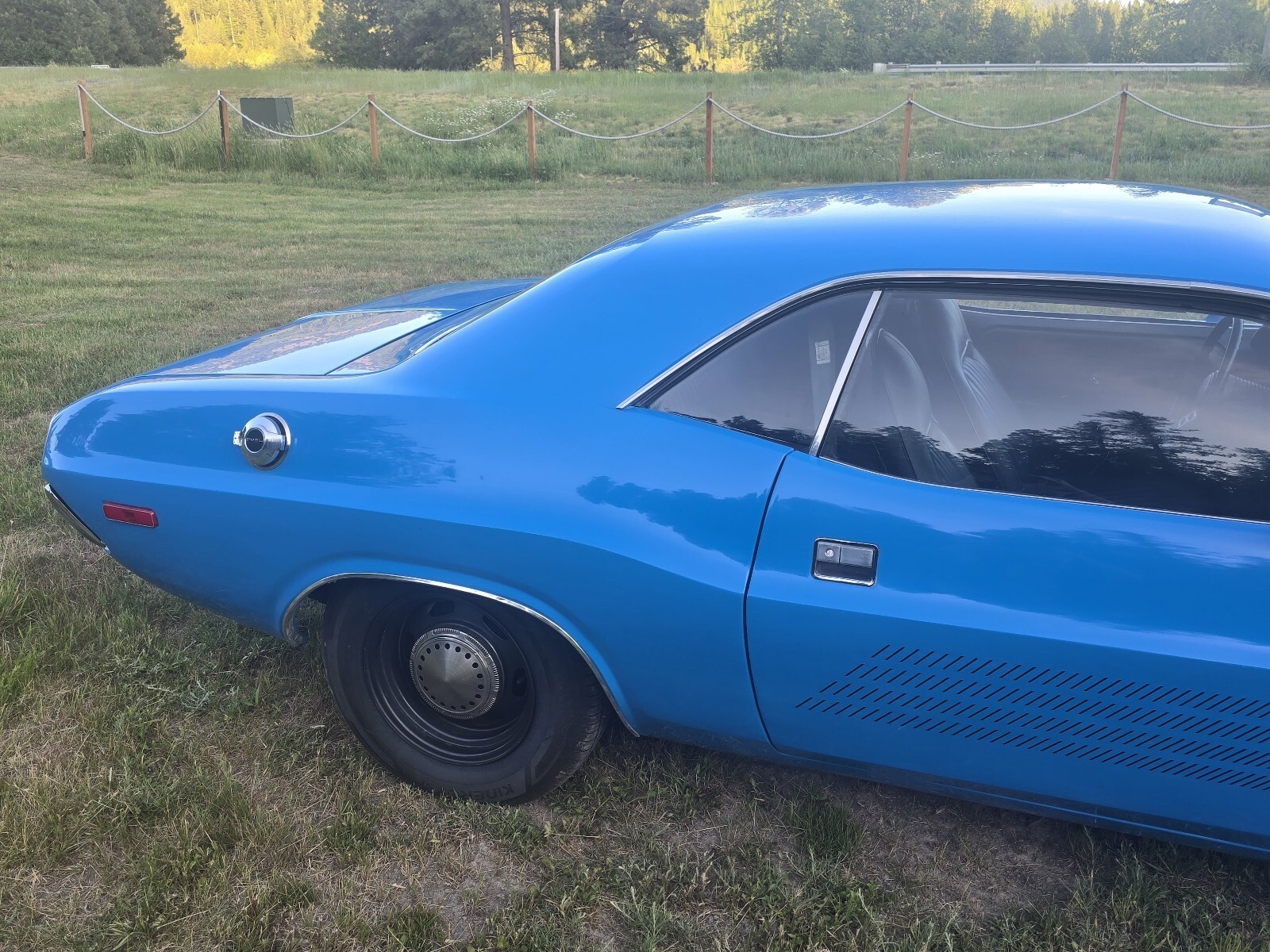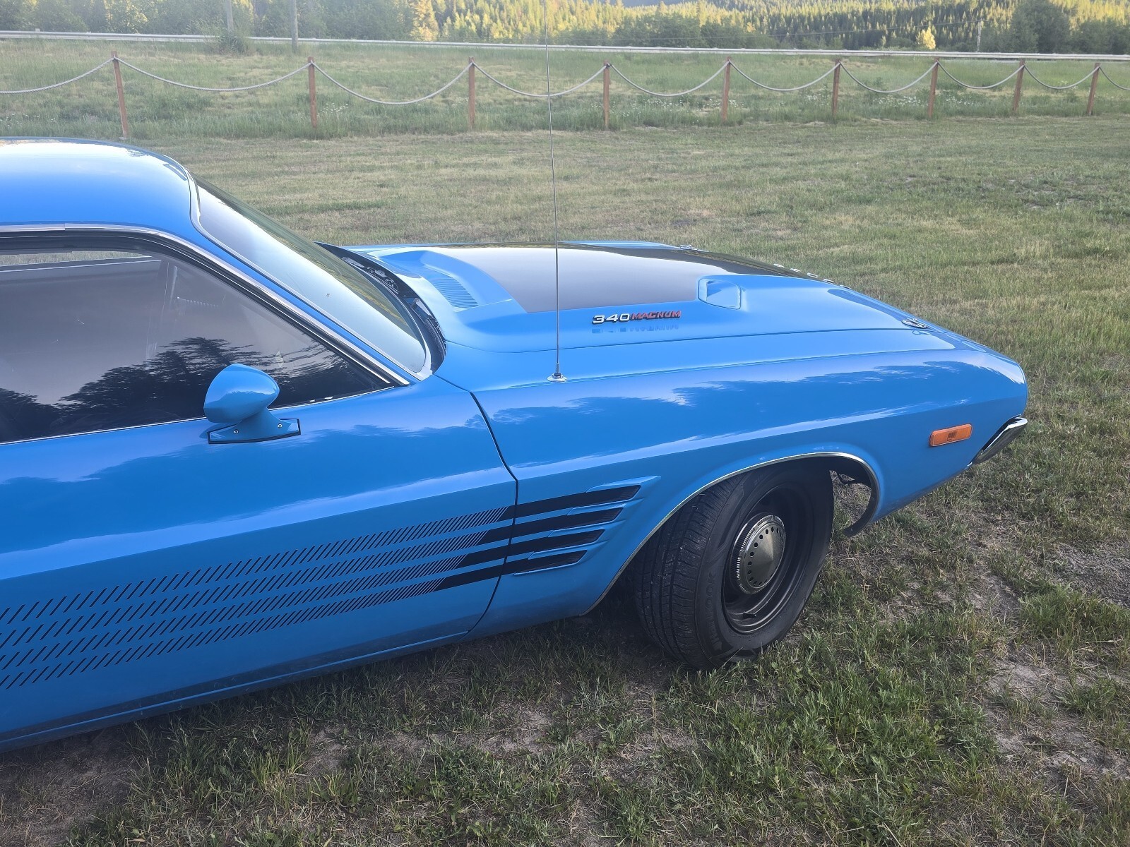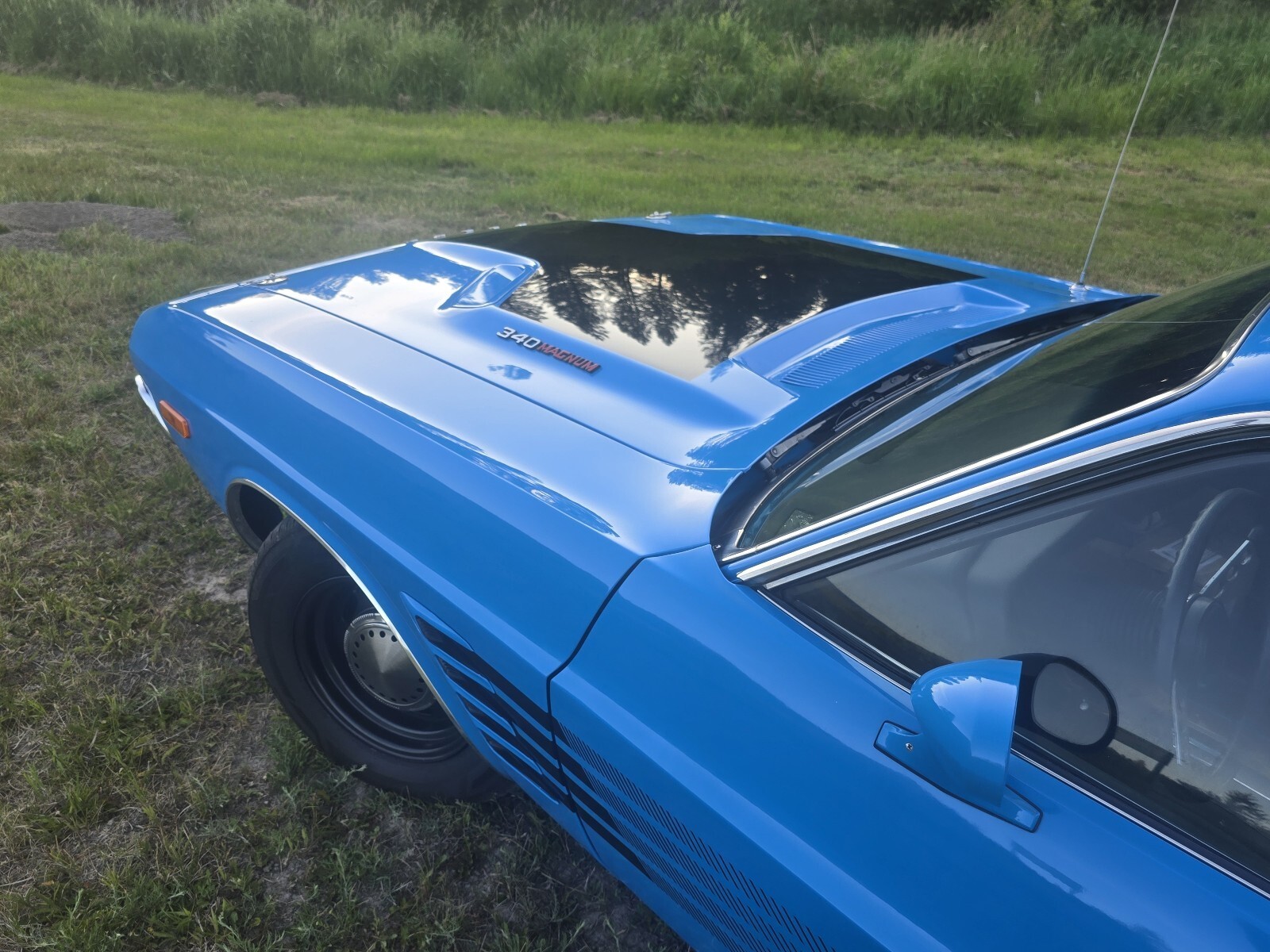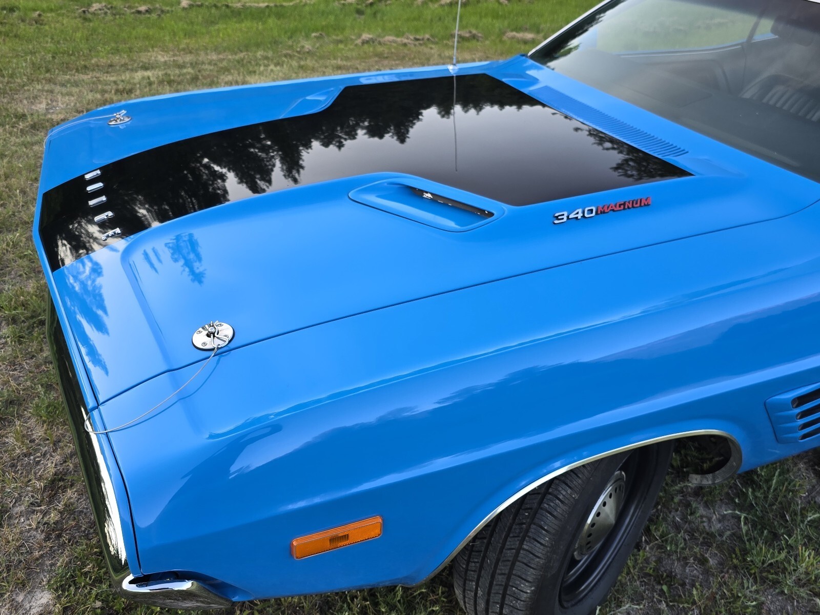 A very Rare original 1972 Dodge Challenger Rallye 340. The Engine and Automatic Transmission are original to the car Matching #'s. Whats makes this beautiful car Rare is it's an original Petty Blue color B3; with White Vinyl top and Black Interior; . Typically white Vinyl top Challengers had White interior. Unfortunately the owner before me had the Vinyl top removed for a more modern look; which can be considered good or bad depending on your taste. You always have the option to have it put back on with aftermarket molding pieces.
