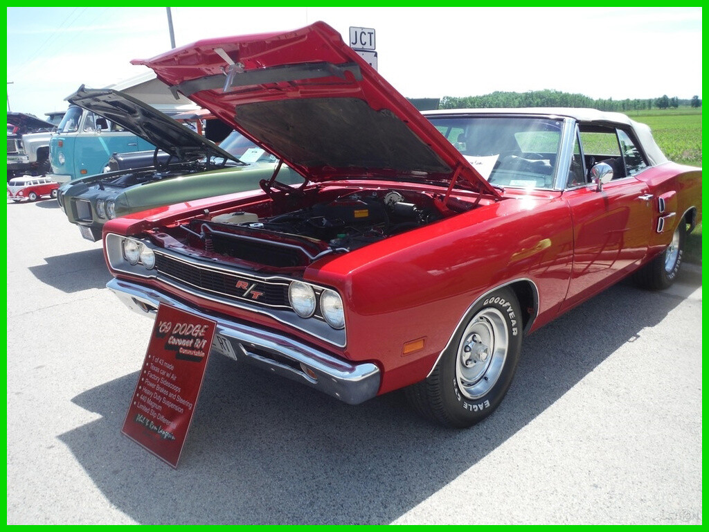 1969 Dodge Coronet R/T Convertible (1 of 43) For Sale in Algoma, WI 54201 This Rare Coronet is powered by a 440 Magnum V8 engine paired with a 3-speed automatic TorqueFlite transmission. It has 69,000 miles and is shown with a red exterior and a black interior. This vehicle has been well-maintained. Features 1 of 43 Made with Factory A/C Factory Side Scoops Heavy Duty Suspension Power Steering Power Disk Brakes Limited Slip Differential 440 Magnum 6 Pack Internals 6 Pac Rods (much heavier than stock 440 rods .060 overbore