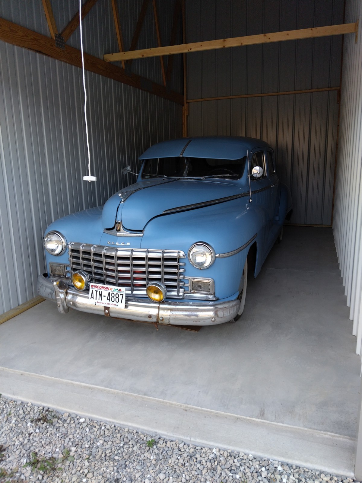 This 1946 Dodge D-24 custom sedan Vin # D2416831 with suicide doors and the rare fluid drive manual transmission three speed on the tree (shift column) flat v-6 with 95,300 miles is an original 79-year-old gal still running strong. We just fired her up after sitting in storage for 7 months over the winter with no issues. Last drove around town in November 2024. With its original interior and baby blue color she still turns heads when we drive her around, we call her baby blue. Originally once part of the Minnesota Blue & White Cab company she was known as car #211 and the original key and key tag #211 we have. At one point in her life someone put in a backup fuel source coming from a portable gas tank coming from the front. Not sure if the original pump in the rear tank went out or the reason behind the change, as shown cracked side window as well, this is not a show room car in perfect condition. The car will need full restoration or drive as an original survivor; she looks good from about 20 feet away.