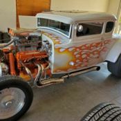 a 327 V8 with a 4 speed transmission.Starts quickly with exceptional power and shifts smoothly. High capacity radiator keeps the engine temperature down. TPI-Tech calibrated gauges. 9" Ford rear end with 4 link suspension and coil over adjustable shocks that can raise and lower the suspension.Ceramic coated Sanderson headers, Flowmaster mufflers and custom exhaust. Rack and pinion steering, dropped spindles, chrome coil over shocks and vented disk brakes up front. Boxed 32 Ford frame with solid feel and no rattles.