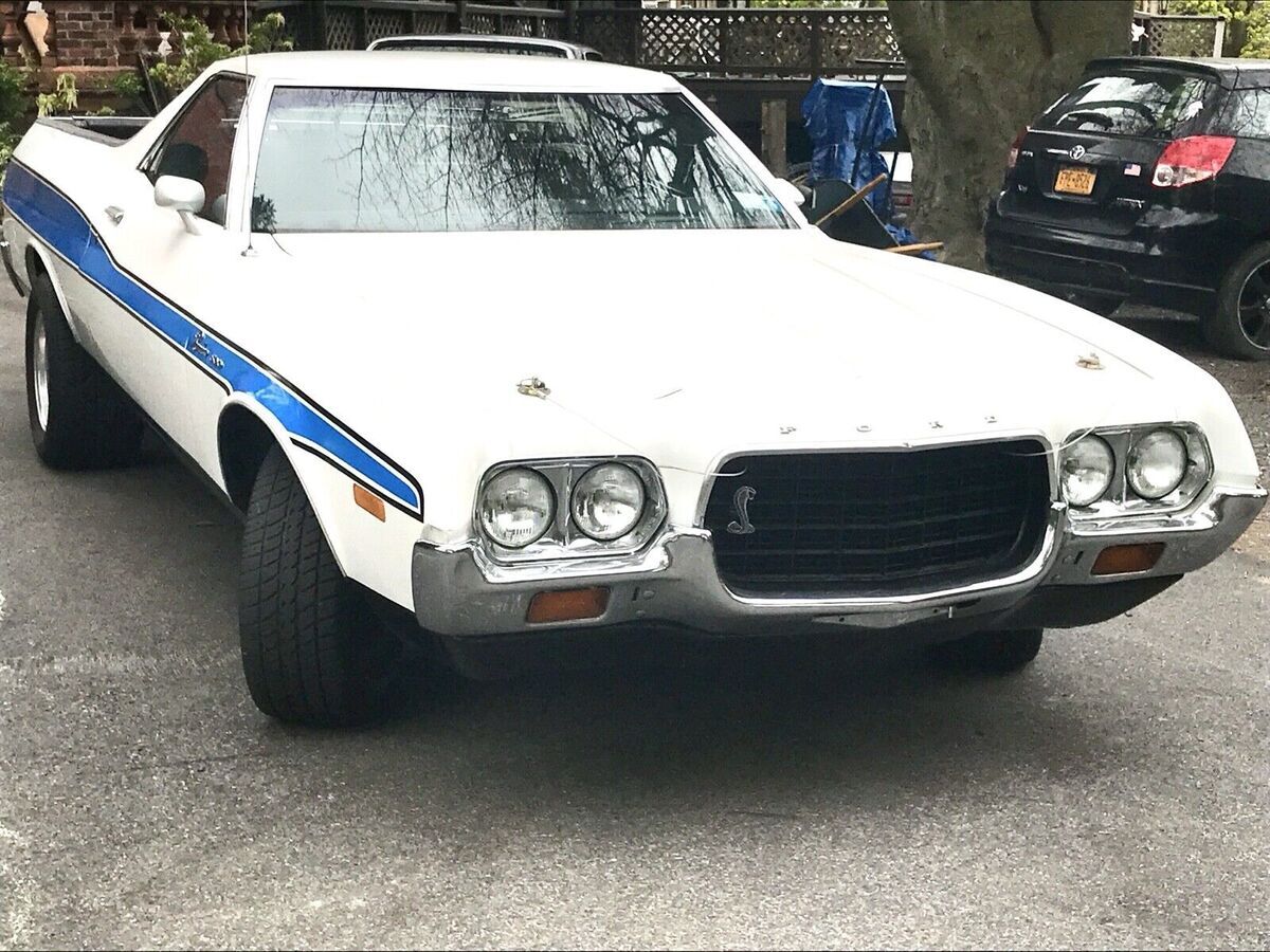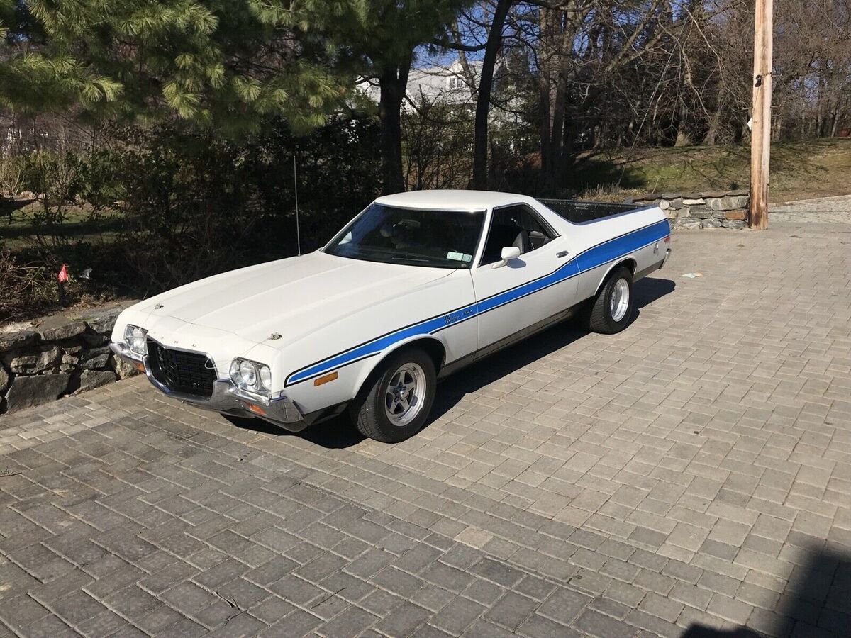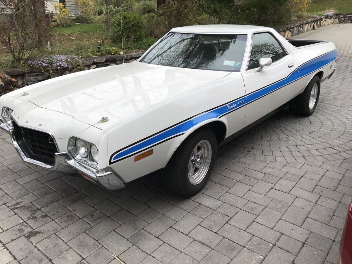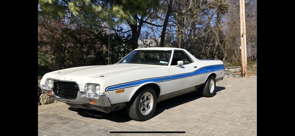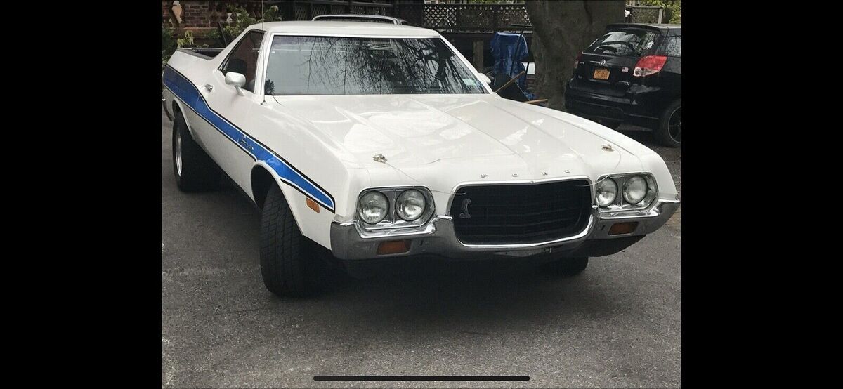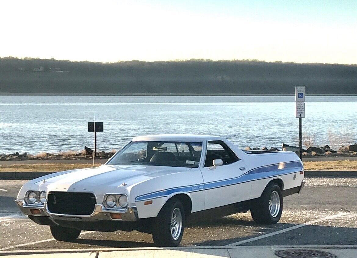 Purchased from original owner after he lovingly had every aspect of this cars mechanics inspected and replaced any parts with medium to heavy wear. He literally had dozens of McDonalds in California and used this vehicle for his personal use and carrying supplies back and forth while developing his chain of stores. This Ranchero was lovingly cherished and cared for by him for nearly 50 years in his collection. This 1972 Ford Ranchero GT is an original gem that has been well-maintained as well by its current collector / user in heated garage and good maintenance. I had a ford specialist mechanic who maintain my fords including 3 Rancheros and Torino. The vehicle runs smoothly and is mainly used weekends among a 14 car collection.. This baby is precious, beautiful and runs super great including a/c. Purchased maybe 8 years ago direct from California original owner.. Clean title and mileage of 34,800. I can’t remember but i do not think this odometer turned over 100k - this car was immaculate and refreshed like WOW when i bought it from original owner i have full belief this is original Local Miles from his use. The car's exterior is a white color with slight sparkles and the paint is old- don’t know when repainted but looks really great with normal use and look overs. Needs touchups to win in shows. Car has easily changeable blue period striping that complimented the muscle car look in the 70s. There are many new Decal Sets with spectacular effects and colors that are interchangeable between decades of Ranchero Styling. My 1970 for example has a more straight like piercing sleek stipe Gold to Grabber Orange side decals that adds to that car. Driving this one is much better than My 70 or 78 Rancheros in control, smoothnes and drivability. Extra set of staggered rears for larger wider rear muscle look.