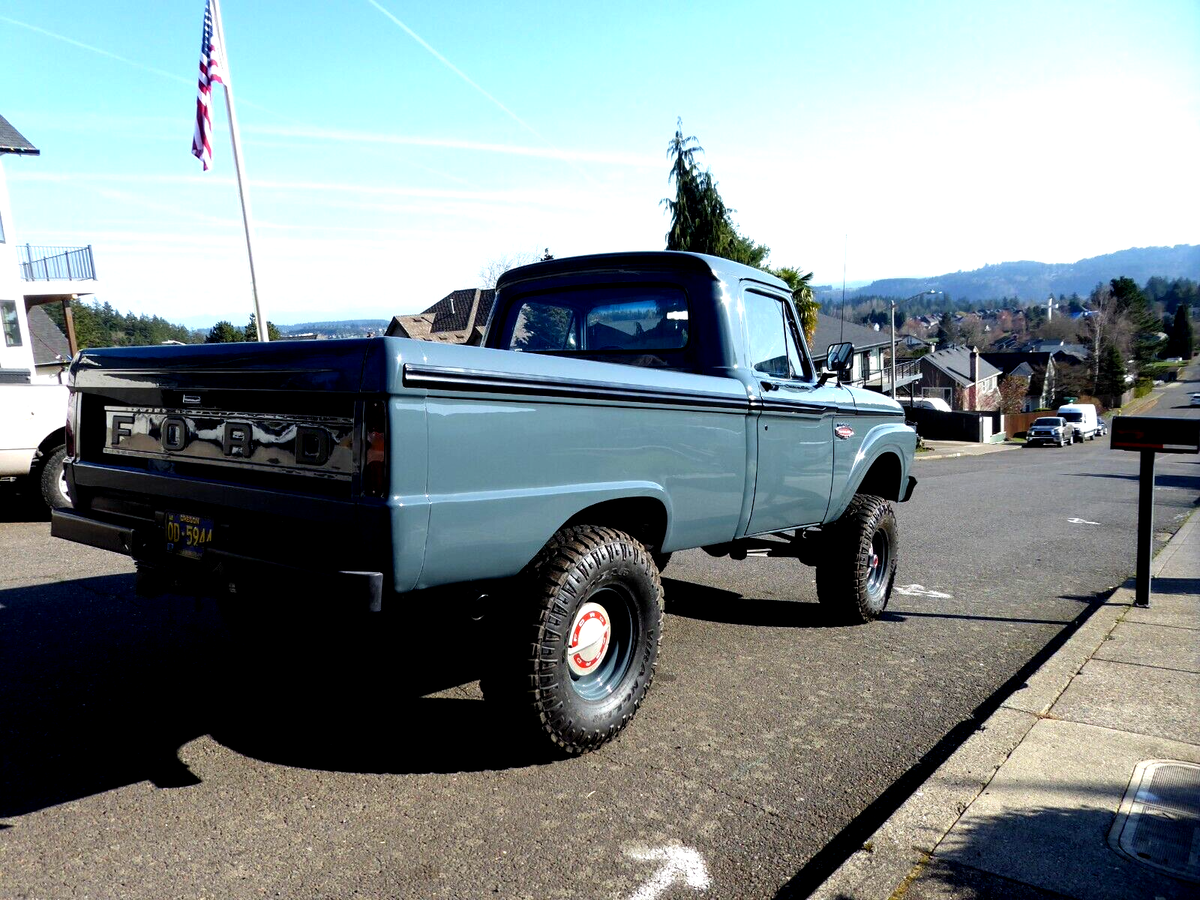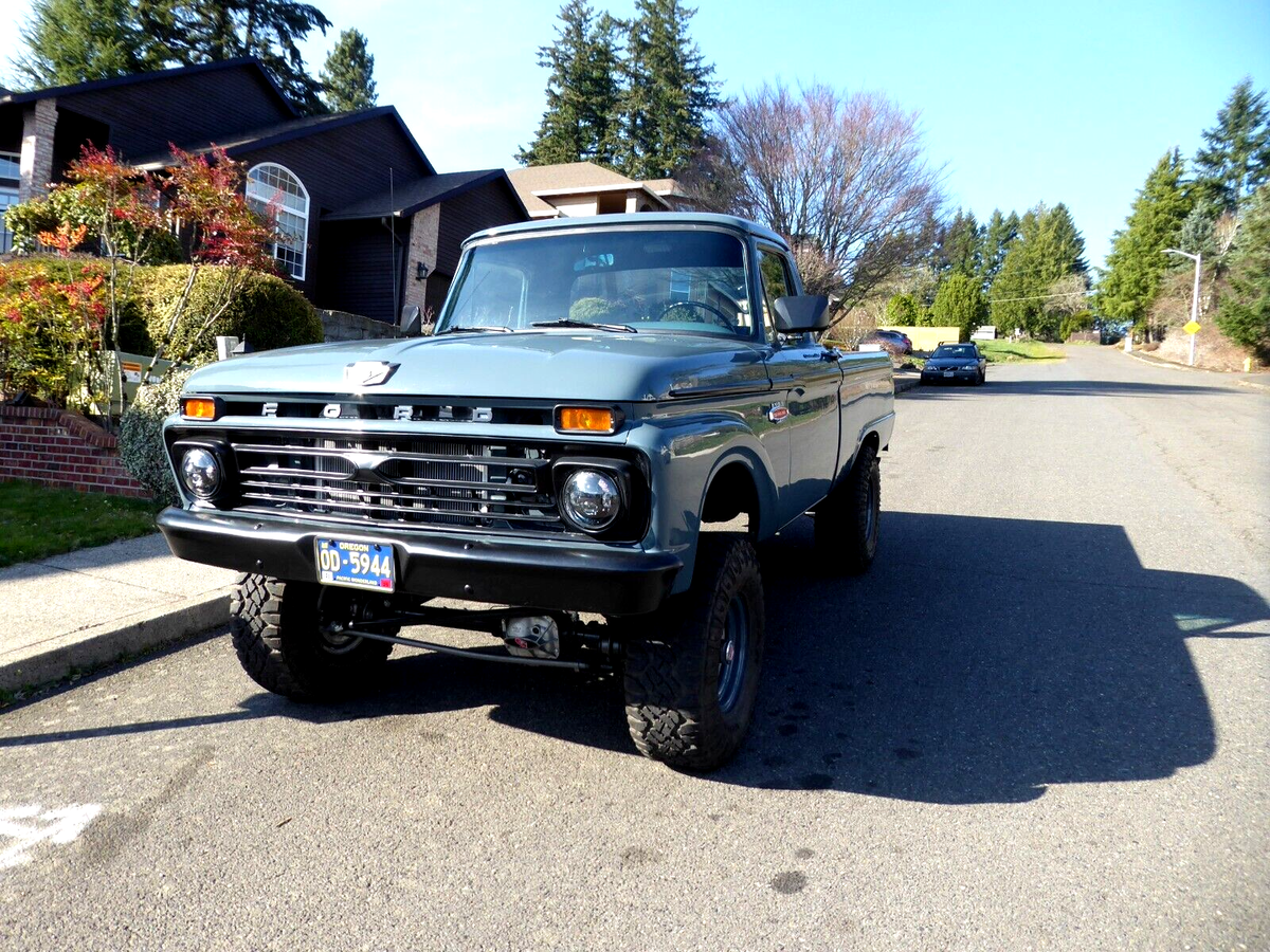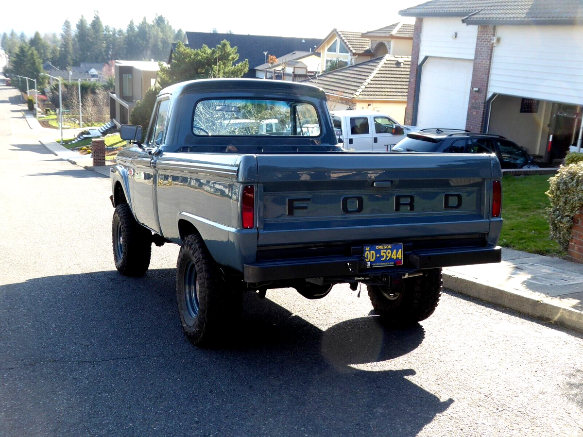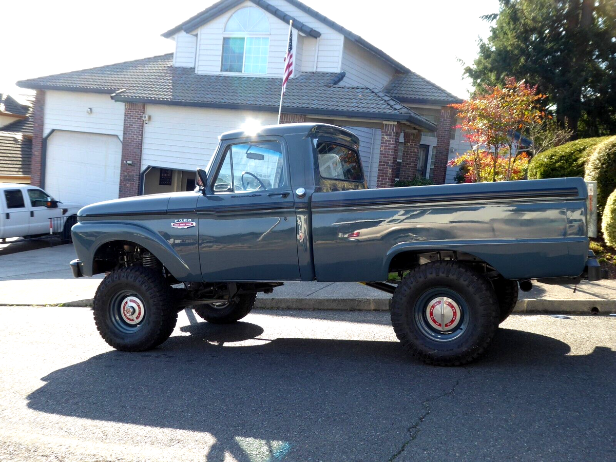 We are proud to list this beautiful example of a hard to find 1966 F100 Short Wide slick. The truck was a San Jose built factory 2wd 6 cyl 4 speed from the factory. It is NOW a 1966 SWB 4x4 302 4V C6 AT with Hydro Boost brakes and power steering, custom built C6 automatic with Ford NP205 transfer case. The front and rear differentials are from a 78 Ford Bronco and are redone with 3:50 trac loc gears. The front dana 44 is refurbished and the brakes are new discs. Driveline is Tom Woods. The brake lines, prop valve, and brakes are 78 Ford Bronco and new. Hence the F11 designation on the door tag.Engine: C8AE-6015 rebuilt .030 overbore, Aluminum intake with Holley 650 cfm carb, auto choke, Pertronix ignition and coil, new 9mm wires and plugs, electric fuel pump, and new 2 1/4" aluminized exhaust with black powder coated custom exhaust tips. A new factory style ps pump and new billet pulleys were installed with a large core aluminum radiator. The engine has a nice dress kit and large K&N air cleaner assembly. The heads are mustang milled with large SS valves and hardened seats using the Comp Cam magnum tip roller rockers( 145-150 lbs. compression) The body was excellent to start with and we just made it better. The cab and bed are ORIGINAL sheet metal, weren't dinged up and the bed had zero rust. The paint is a 2014 Jeep color called "ANVIL BLUE" Nason base with USC 7500 clear coat. Extra paint is included with the sale.We fished and seal coated the entire undercarriage of the cab and bed with BLACK RAPTOR and stripped all the emblems and side molding to be painted semi gloss black including the mirrors. The body has new fasteners, sound proofing in cab. carpet, upholstery, and headliner. We installed a new Kenwood blue tooth stereo because YOUR music is better than FM music in most cases and the PYLE speaker system sounds awesome. The heater core was replaced as was the temp control valve with a fresh quiet motor. Functions well. The tinted windshield, gasket, door gaskets, and fasteners are all fresh. The door arm rests are original now but we have new replacements on order to complete the interior. The new LED headlights have the orange halo for turn signals wired in and give AMPLE light. lol I rubbed through a spot above the radio and have an appointment at the body shop to repaint a small part of the dash on Tuesday. Other than that small cranial rectal inversion it is ready to rock. The wheels are custom 15x10 with factory centers so the hub caps would work like factory. The mud terrains are 33-12.50R15 and brand new. We used a painted front bumper and a custom rear step bumper with receiver hitch and a FORD lighted third brake light switch. The step grip is 3M and used on the rear bumper and cab sill ledger for anti slip.The tailgate is original and the hardware is redone. Most all the small parts were media blasted, etch primed and painted semi gloss black with three coats. Probably won't be too susceptible to rust any time soon.Disclaimers: The truck is very nice but built to go on or off road. There are no warranties expressed or implied. There are no warranties for merchantability period. The truck "is what it is and nothing more" We have tried to present it as it really is, not even close to perfect. We whole heartedly recommend personal inspections of the rig and hope the buyer can find the time to inspect it before purchasing or hitting the buy it now button. Any questions not already answered on the ad can be answered by contacting me( the builder) at [email protected]. Inspection appointments can be set up and we have a hoist to put it up in the air if desired. Good Luck and thanks for your interest. Wire transfer is best for immediate release of vehicle but we will accept any legal tender or good check. The vehicle and clear title will be released immediately after funds are deemed good by our bank. We are also very happy to assist your transporter of choice on pickup dates and times.