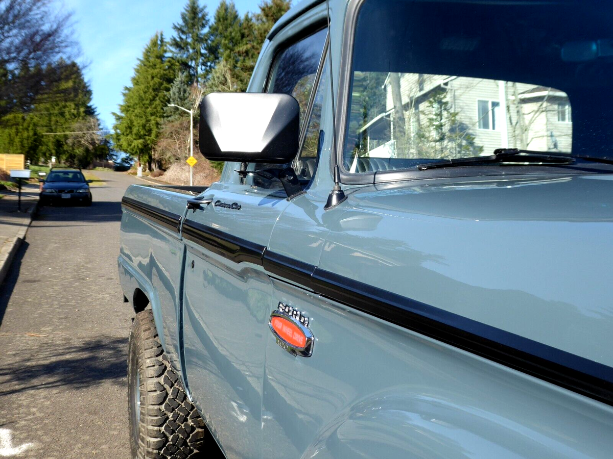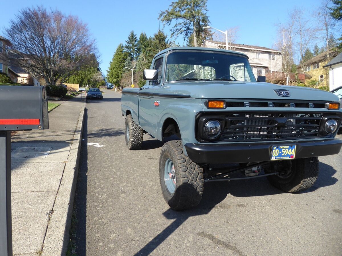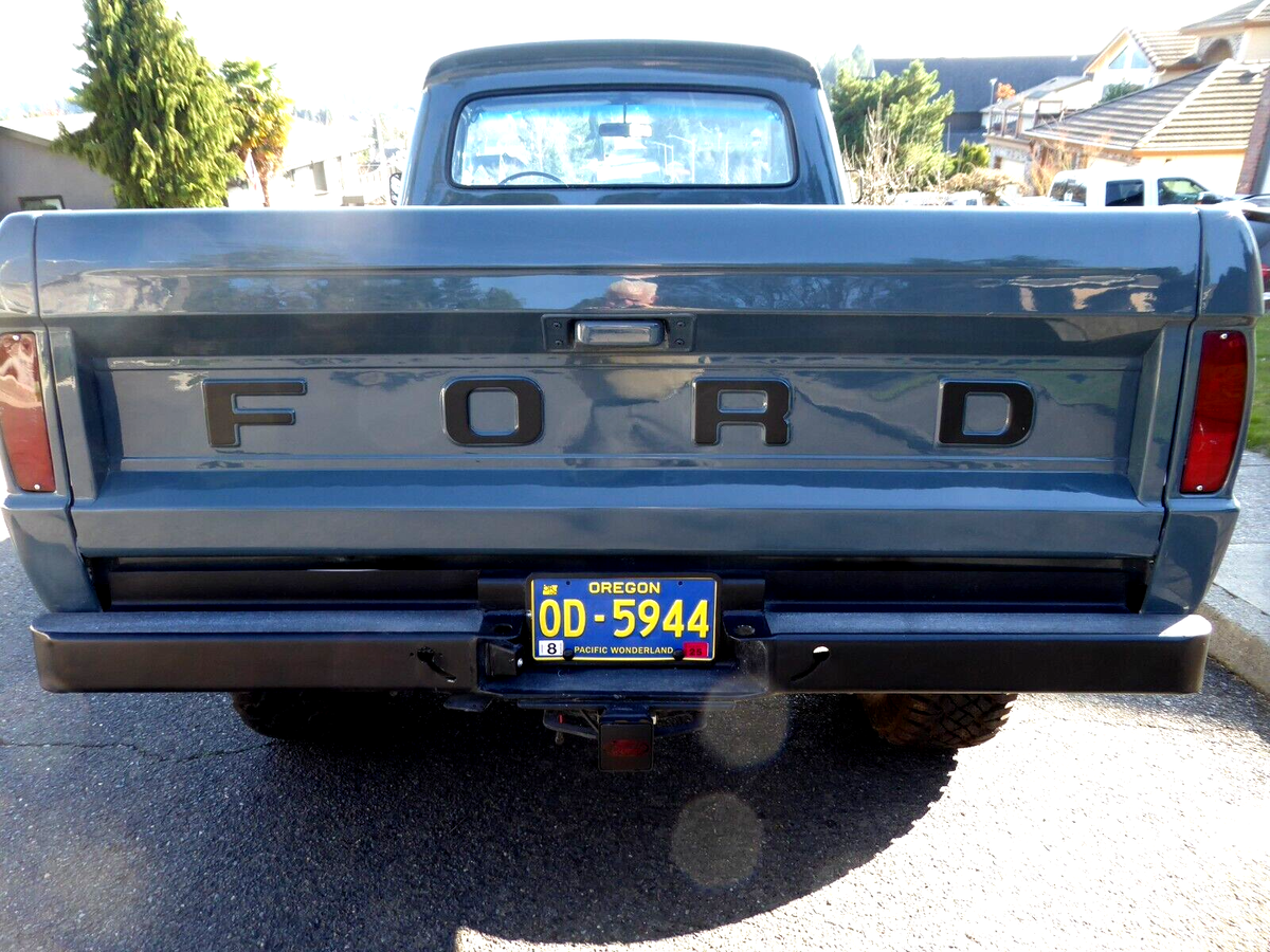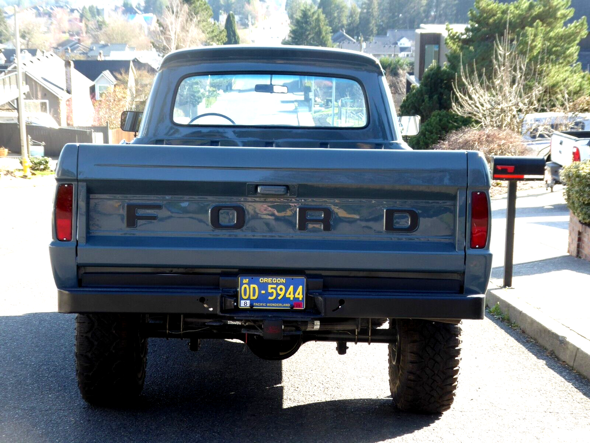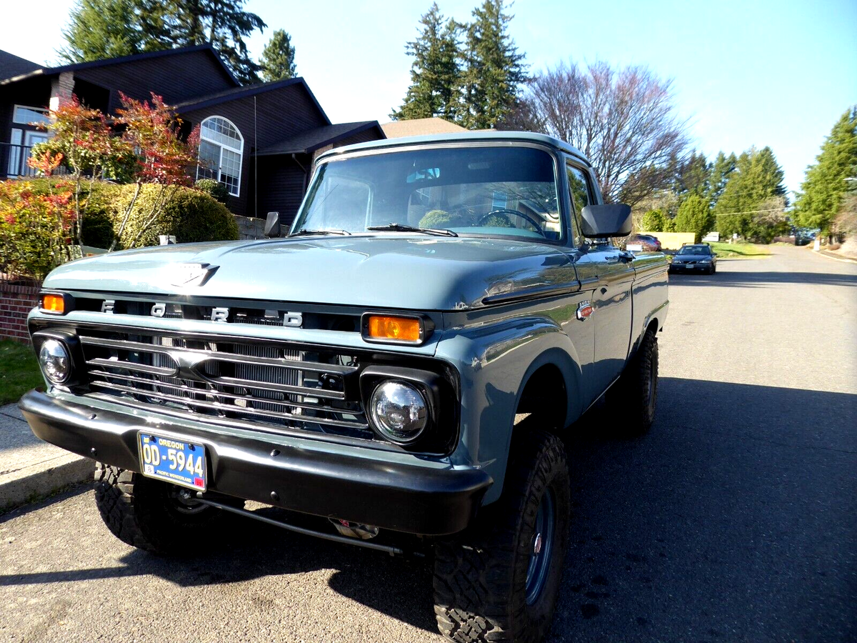 We are proud to list this beautiful example of a hard to find 1966 F100 Short Wide slick. The truck was a San Jose built factory 2wd 6 cyl 4 speed from the factory. It is NOW a 1966 SWB 4x4 302 4V C6 AT with Hydro Boost brakes and power steering, custom built C6 automatic with Ford NP205 transfer case. The front and rear differentials are from a 78 Ford Bronco and are redone with 3:50 trac loc gears. The front dana 44 is refurbished and the brakes are new discs. Driveline is Tom Woods. The brake lines, prop valve, and brakes are 78 Ford Bronco and new. Hence the F11 designation on the door tag.Engine: C8AE-6015 rebuilt .030 overbore, Aluminum intake with Holley 650 cfm carb, auto choke, Pertronix ignition and coil, new 9mm wires and plugs, electric fuel pump, and new 2 1/4" aluminized exhaust with black powder coated custom exhaust tips. A new factory style ps pump and new billet pulleys were installed with a large core aluminum radiator. The engine has a nice dress kit and large K&N air cleaner assembly. The heads are mustang milled with large SS valves and hardened seats using the Comp Cam magnum tip roller rockers( 145-150 lbs. compression) The body was excellent to start with and we just made it better. The cab and bed are ORIGINAL sheet metal, weren't dinged up and the bed had zero rust. The paint is a 2014 Jeep color called "ANVIL BLUE" Nason base with USC 7500 clear coat. Extra paint is included with the sale.We fished and seal coated the entire undercarriage of the cab and bed with BLACK RAPTOR and stripped all the emblems and side molding to be painted semi gloss black including the mirrors. The body has new fasteners, sound proofing in cab. carpet, upholstery, and headliner. We installed a new Kenwood blue tooth stereo because YOUR music is better than FM music in most cases and the PYLE speaker system sounds awesome. The heater core was replaced as was the temp control valve with a fresh quiet motor. Functions well. The tinted windshield, gasket, door gaskets, and fasteners are all fresh. The door arm rests are original now but we have new replacements on order to complete the interior. The new LED headlights have the orange halo for turn signals wired in and give AMPLE light. lol I rubbed through a spot above the radio and have an appointment at the body shop to repaint a small part of the dash on Tuesday. Other than that small cranial rectal inversion it is ready to rock. The wheels are custom 15x10 with factory centers so the hub caps would work like factory. The mud terrains are 33-12.50R15 and brand new. We used a painted front bumper and a custom rear step bumper with receiver hitch and a FORD lighted third brake light switch. The step grip is 3M and used on the rear bumper and cab sill ledger for anti slip.The tailgate is original and the hardware is redone. Most all the small parts were media blasted, etch primed and painted semi gloss black with three coats. Probably won't be too susceptible to rust any time soon.Disclaimers: The truck is very nice but built to go on or off road. There are no warranties expressed or implied. There are no warranties for merchantability period. The truck "is what it is and nothing more" We have tried to present it as it really is, not even close to perfect. We whole heartedly recommend personal inspections of the rig and hope the buyer can find the time to inspect it before purchasing or hitting the buy it now button. Any questions not already answered on the ad can be answered by contacting me( the builder) at [email protected]. Inspection appointments can be set up and we have a hoist to put it up in the air if desired. Good Luck and thanks for your interest. Wire transfer is best for immediate release of vehicle but we will accept any legal tender or good check. The vehicle and clear title will be released immediately after funds are deemed good by our bank. We are also very happy to assist your transporter of choice on pickup dates and times.
