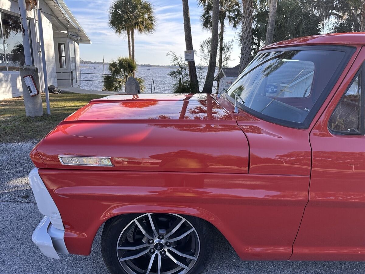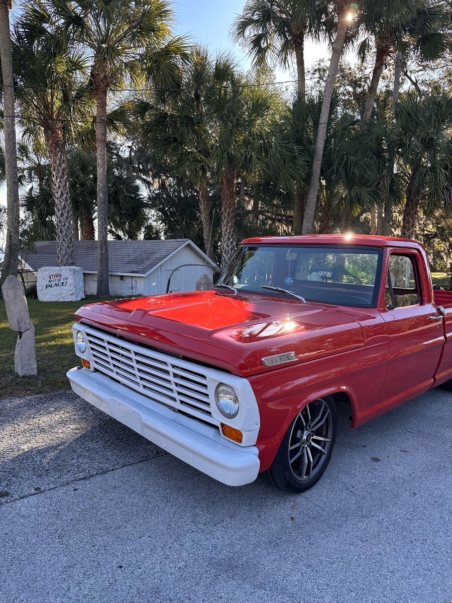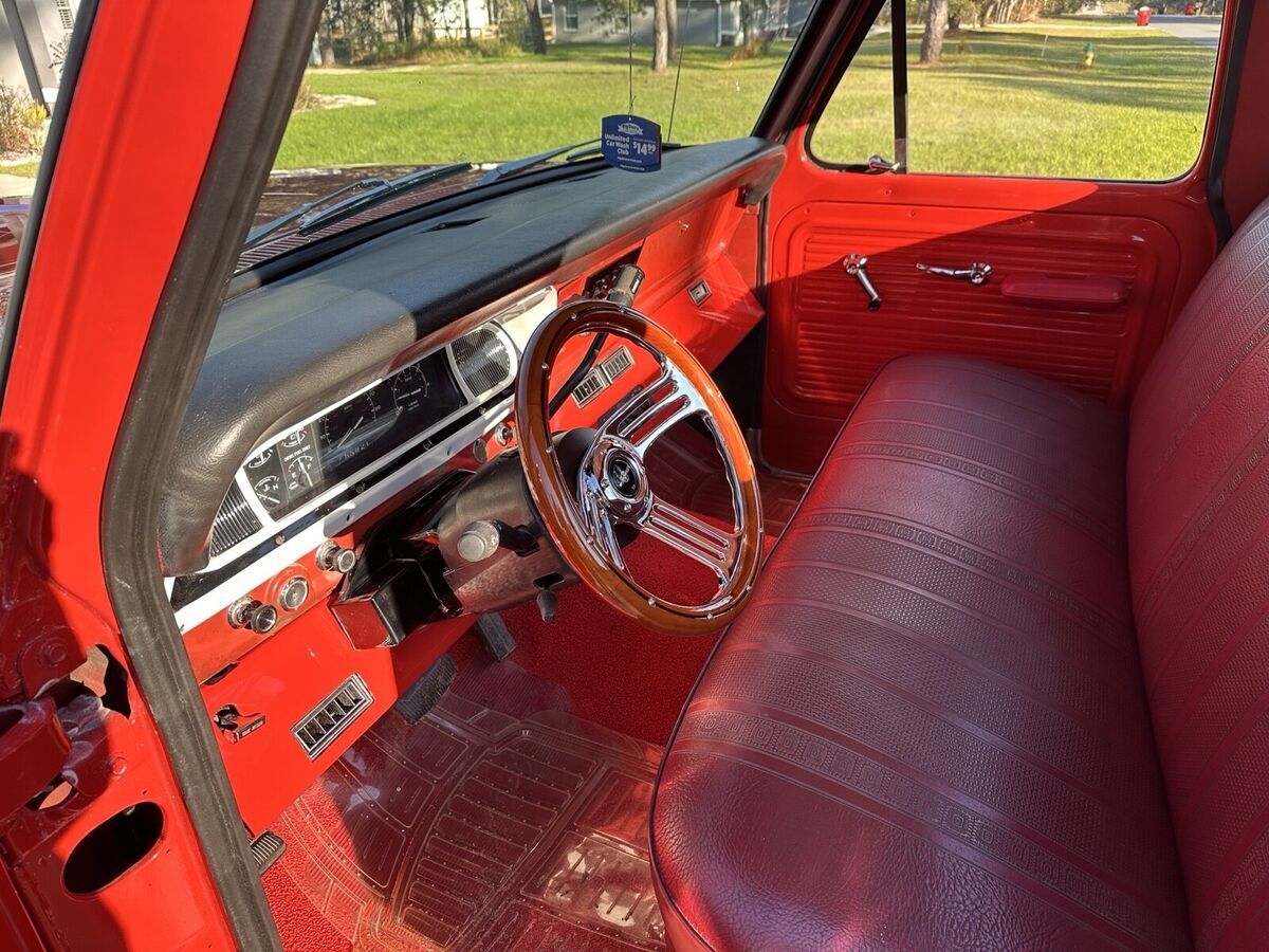 A CV front end, including rack and pinion, power brakes, 4 speed automatic transmission and a 9 inch rear axle that handles the road like most modern trucks do, was used. 18 inch Ford Wheels and tires were used to aid in the traction department and give it a muscle look. The trucks laser straight lines, and excellent panel alignment, adds to the great attention to detail that has gone into this build. To enhance the diesel motor and give it a sporty look is a bright red absolutely flawless paint job. This paint job is a testament of the precision that has gone into this build. The interior of the F100 stays true to its sporty sleek looks with the original bench seat with original seat cover. There is a small tear by the passenger side seat cover on the edge. You will be hard press to find flaws but it was hard to pass up the condition of this original seat with a new one. Modern touches such as updated gauges ( from 7.3 diesel) and a sport steering wheel expertly blend in with the trucks cool interior. There is brand new carpeting, billet hood hinges and numerous other fine details that are too many to list. You dont have to be Ford diesel enthusiast to love this truck but be prepared to be approached by all those that are!