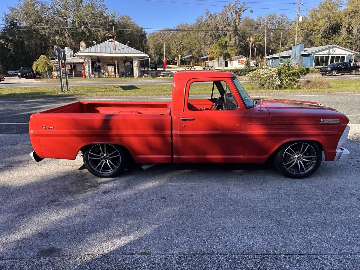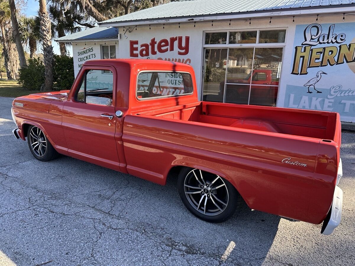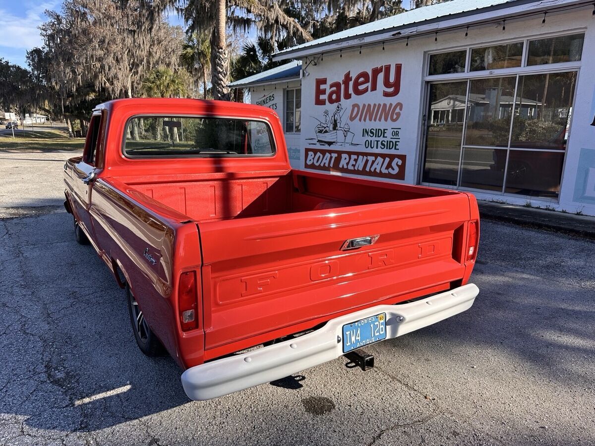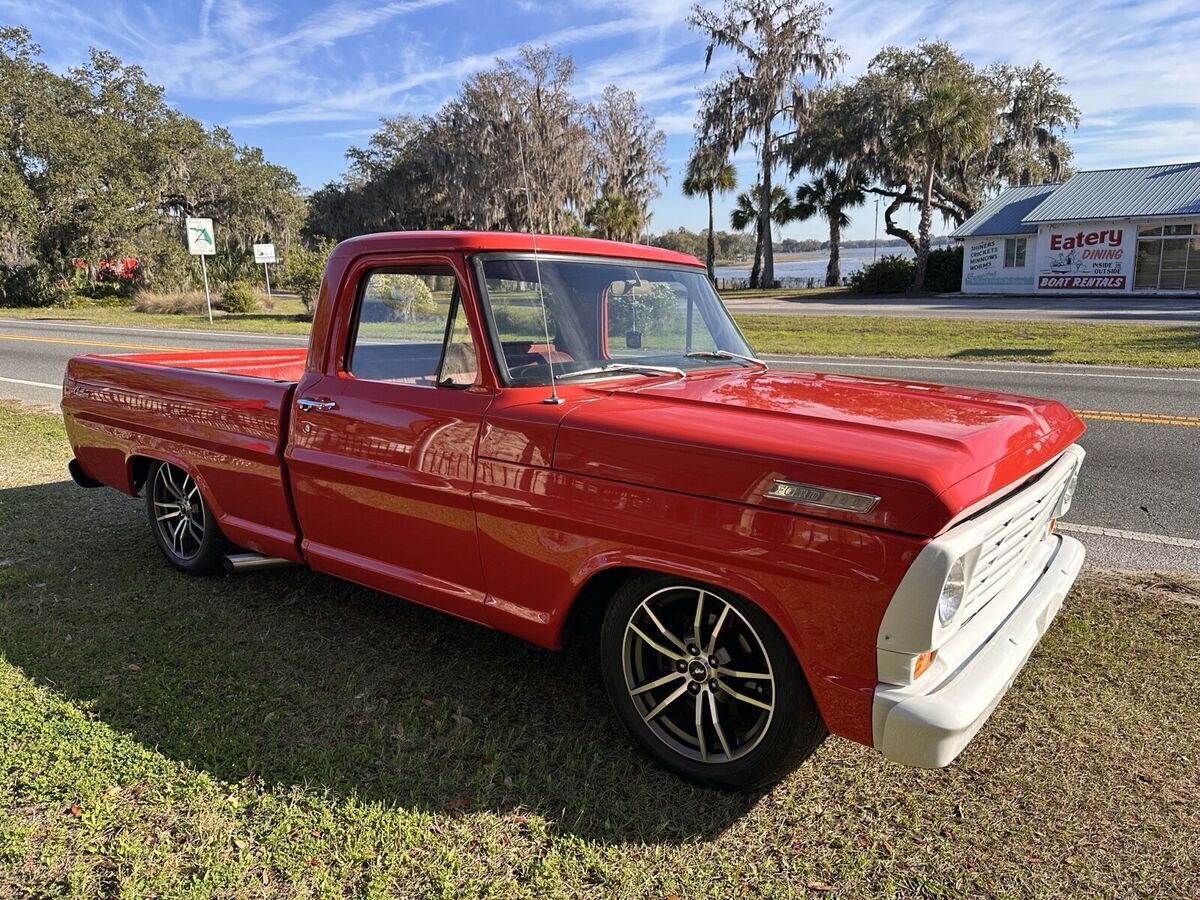 A CV front end, including rack and pinion, power brakes, 4 speed automatic transmission and a 9 inch rear axle that handles the road like most modern trucks do, was used. 18 inch Ford Wheels and tires were used to aid in the traction department and give it a muscle look. The trucks laser straight lines, and excellent panel alignment, adds to the great attention to detail that has gone into this build. To enhance the diesel motor and give it a sporty look is a bright red absolutely flawless paint job. This paint job is a testament of the precision that has gone into this build. The interior of the F100 stays true to its sporty sleek looks with the original bench seat with original seat cover. There is a small tear by the passenger side seat cover on the edge. You will be hard press to find flaws but it was hard to pass up the condition of this original seat with a new one. Modern touches such as updated gauges ( from 7.3 diesel) and a sport steering wheel expertly blend in with the trucks cool interior. There is brand new carpeting, billet hood hinges and numerous other fine details that are too many to list. You dont have to be Ford diesel enthusiast to love this truck but be prepared to be approached by all those that are!