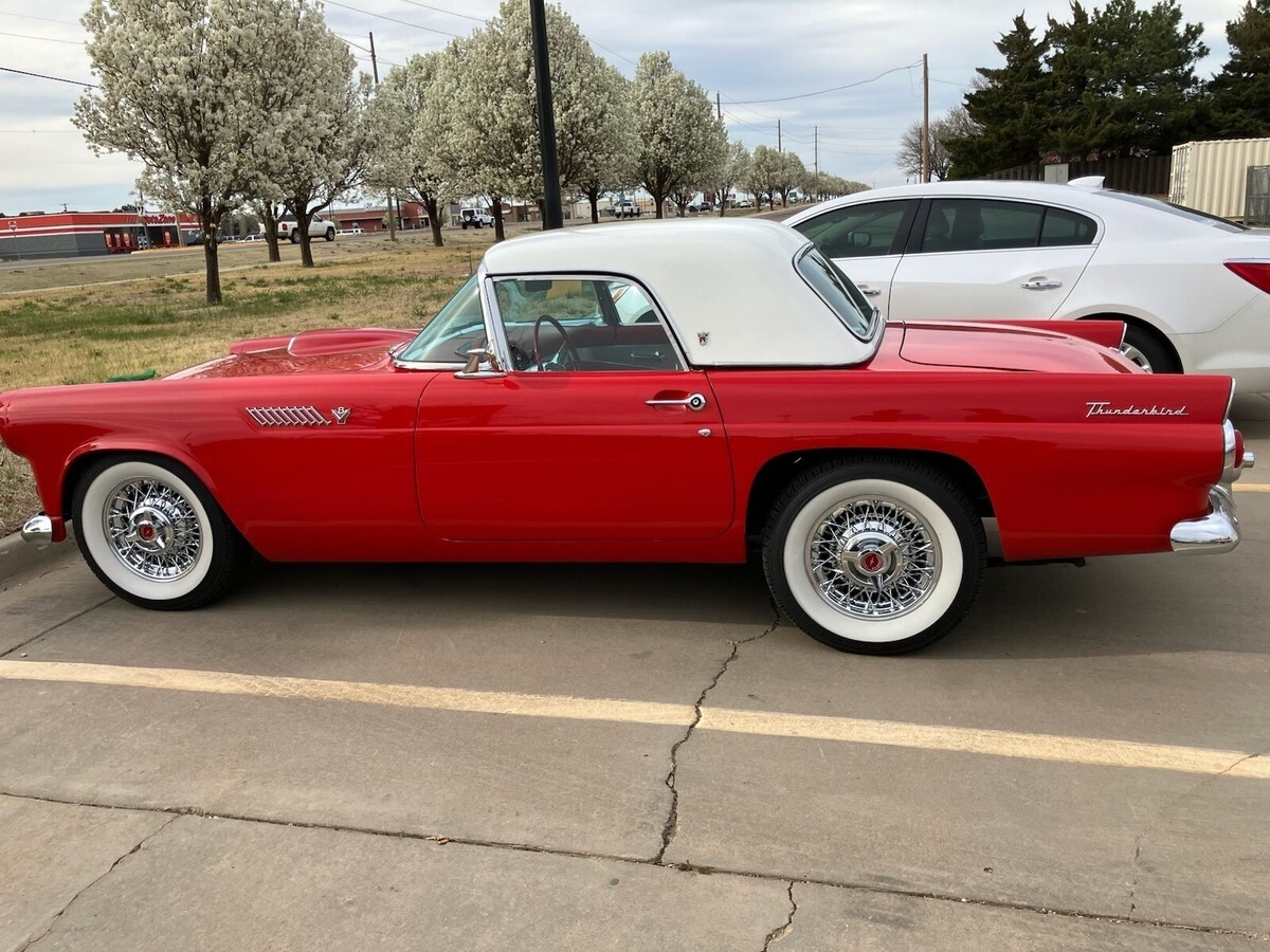 This 1955 Ford Thunderbird is a restored vehicle that has been owned for one year. It is a bright red color and has a mileage of 2400 on miles on rebuilt motor. There has been a few upgrades on the engine bay area. 12 Volt conversion, Go EFI 400 Fuel Injection, Aluminum Radiator with Electric Fan, and the engine bay area has been rewired. The Headlights and Tail lights have been upgraded to Led for high visibility. New Kelsey-Hayes reps spoke wheels and tires were installed less than a month ago. The Stereo system has been updated to a Retro looking Bluetooth system and new speakers, sub woofer, and 1000 watt 5 channel amp installed. Vehicle has power steering and Air Conditioning. All weatherstrips gaskets have been replaced on the doors, and Hardtop. Interior carpet has been replaced throughout the vehicle and trunk. This is a Convertible Hard top only vehicle. No Soft top or hardware for a soft top. I do have the original rear fender skirts and they are in excellent condition and will go with the vehicle. This 1955 Ford Thunderbird was purchased out of California and had a previous restoration done on it by the previous owner. When I purchased it I did additional work on it to modernize the engine bay area, wiring, lighting, stereo, and wheels. The vehicle title is clean. There are some minor imperfections on the vehicle but considering it's 70 years old it's in excellent condition. The vehicle runs great and is mainly used for weekend drives, making it a reliable and stylish choice for leisurely outings. The vehicle is being sold as is where is with no expressed warranties or guarantees. Thank you for checking out my listing and feel free to reach out to me if you have any questions.