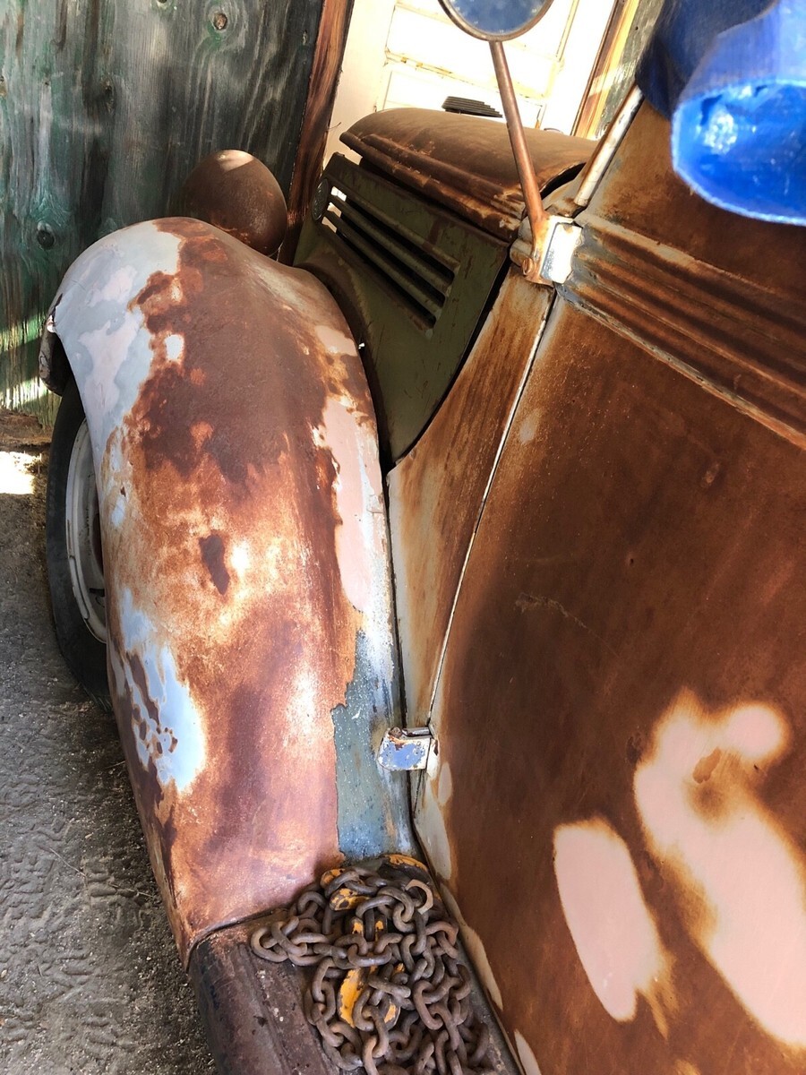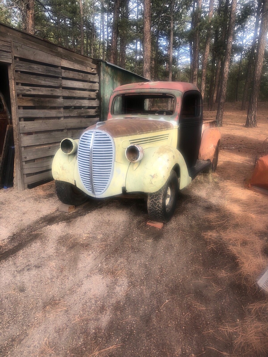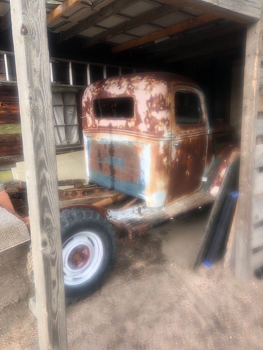 This body style was only 1938 and 1939 making the parts interchangeable, so it would be a tragedy if they are not sold as a pair. The 1939 has the yellow front fenders does have the bed on it, but no driveline. The 1938 does have the driveline including the flathead V-8, it’s missing the bed, but I do have the tailgate.