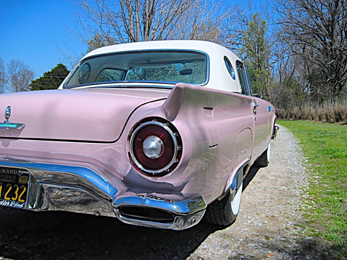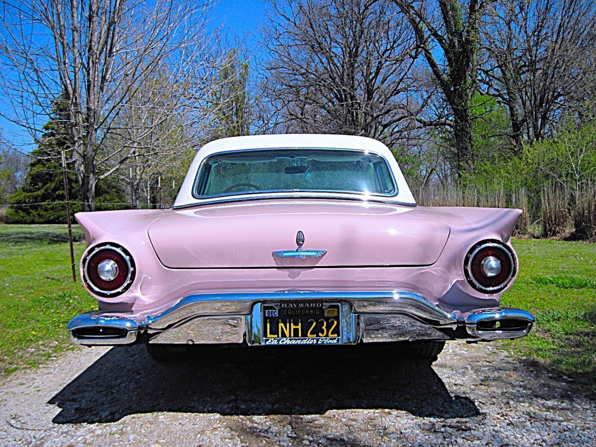 YOU ARE VIEWING THE MOST ICONIC FORD THUNDERBIRD EVER MADE, THE CLASSIC DUSK ROSE “PINK” 1957 MODEL. IT IS A DRY RUST FREE EXAMPLE, SPENDING IT'S ENTIRE LIFE IN THE VISALIA-FRESNO AREAS OF THE CALIFORNIA CENTRAL VALLEY. VEHICLE STILL WEARS THE ORIGINAL BLACK/YELLOW CA. LICENSE PLATES ORIGINALLY ISSUED TO THIS CAR, SO IT HAS A GREAT PROVENCE ALONG WITH A HUGE HISTORY FILE WITH REPAIR AND PARTS RECEIPTS DATING BACK TO THE 80'S. THIS THUNDERBIRD IS A LOADED FULL OPTION CAR WITH POWER STEERING, POWER BRAKES, POWER WINDOWS, POWER SEATS, TINTED GLASS, FENDER SKIRTS, RADIO, HEATER, AND PORTHOLE HARDTOP. THE BODY IS VERY STRAIGHT, NEVER WRECKED, WITH ALL IT'S FACTORY SHEETMETAL, AND OF COURSE IT IS RUST FREE. CAR HAS HAD ONE REPAINT IN '91 IN FACTORY ORIGINAL COLOR OF DUSK ROSE, (CODE X), WHICH HAS SOME MINOR FLAWS BUT STILL HAS GREAT GLOSS AND STILL SHOWS GOOD FOR THE AGE. THE CHROME AND BRIGHTWORK ARE VERY NICE, NO PITTING. GLASS IS FINE, NO CRACKS. ALL POWER ACCESSORIES WORK, ALONG WITH GAUGES, LIGHTS, TURN SIGNALS, ETC. RADIO COMES ON BUT DOES NOT PLAY. INTERIOR IS CORRECT AND VERY NICE. DASH PAD HAS SOME DISTORTION FROM AGE BUT STILL LOOKS GOOD AND IS VERY SERVICEABLE. DOOR PANELS, HEADLINER AND SEAT (WITH ORIGINAL "T-BIRD" EMBOSSMENT) ARE NEAR PERFECT (SEE PHOTOS). CAR RUNS AND DRIVES AND STARTS RIGHT UP, WITH MUCH OF THE MECHANICS BEING REBUILT AND SEVICED OVER THE YEARS. THIS IS NOT A SHOW CAR, BUT A HIGH QUALITY DRIVER CONDITION CAR THAT HAS BEEN WELL MAINTAINED AND HAD MUCH RESTORATION OVER THE YEARS. PLEASE ASK QUESTIONS OR INSPECT BEFORE BIDDING!!!! ANYONE WITH NEGATIVE OR LESS THAN 5 FEEDBACKS PLEASE MOVE ON. I WILL ACCEPT CASH OR BANK TO BANK WIRE TRANSFER AS THE ONLY FORMS OF PAYMENT. THANK-YOU.