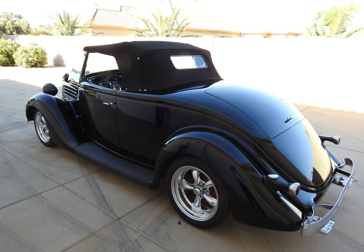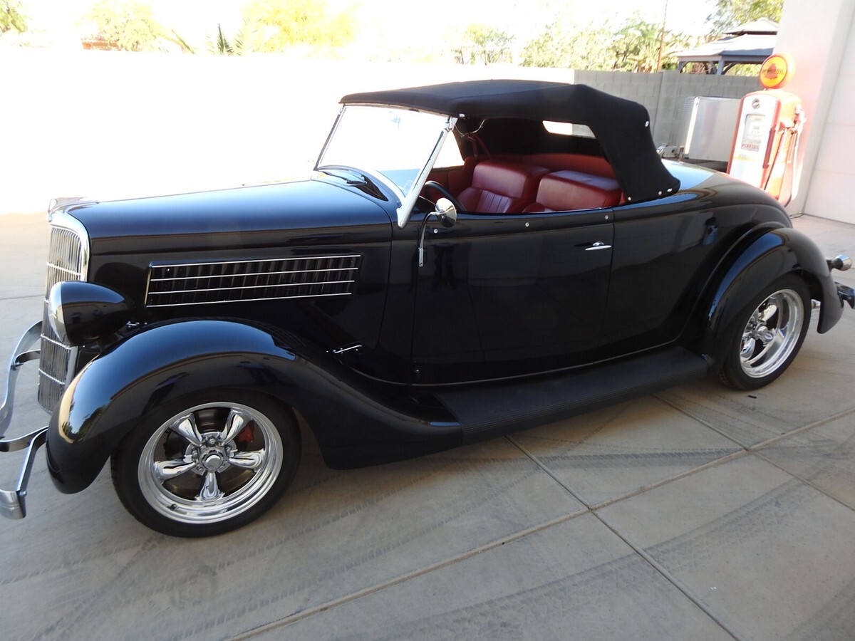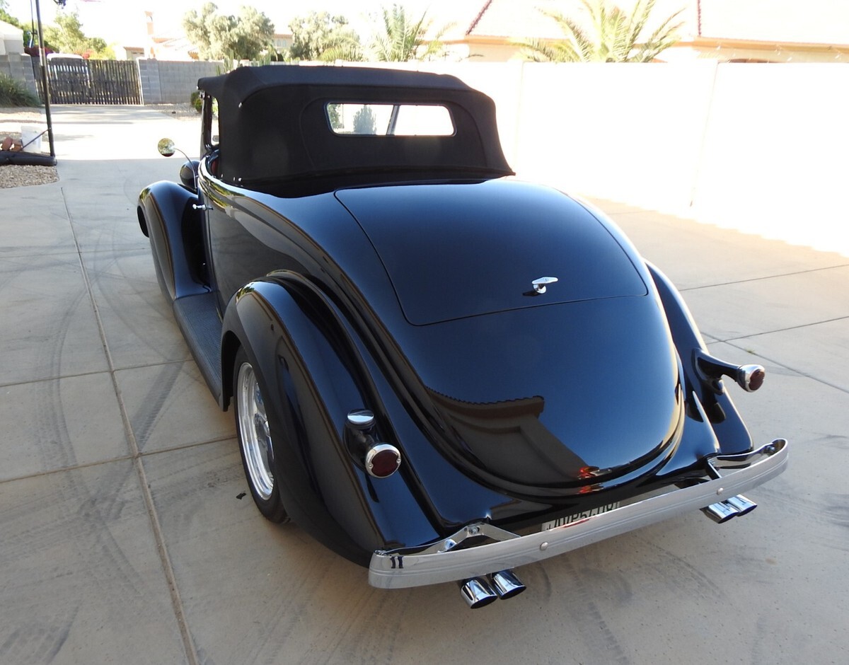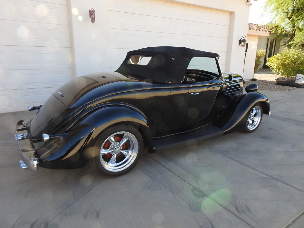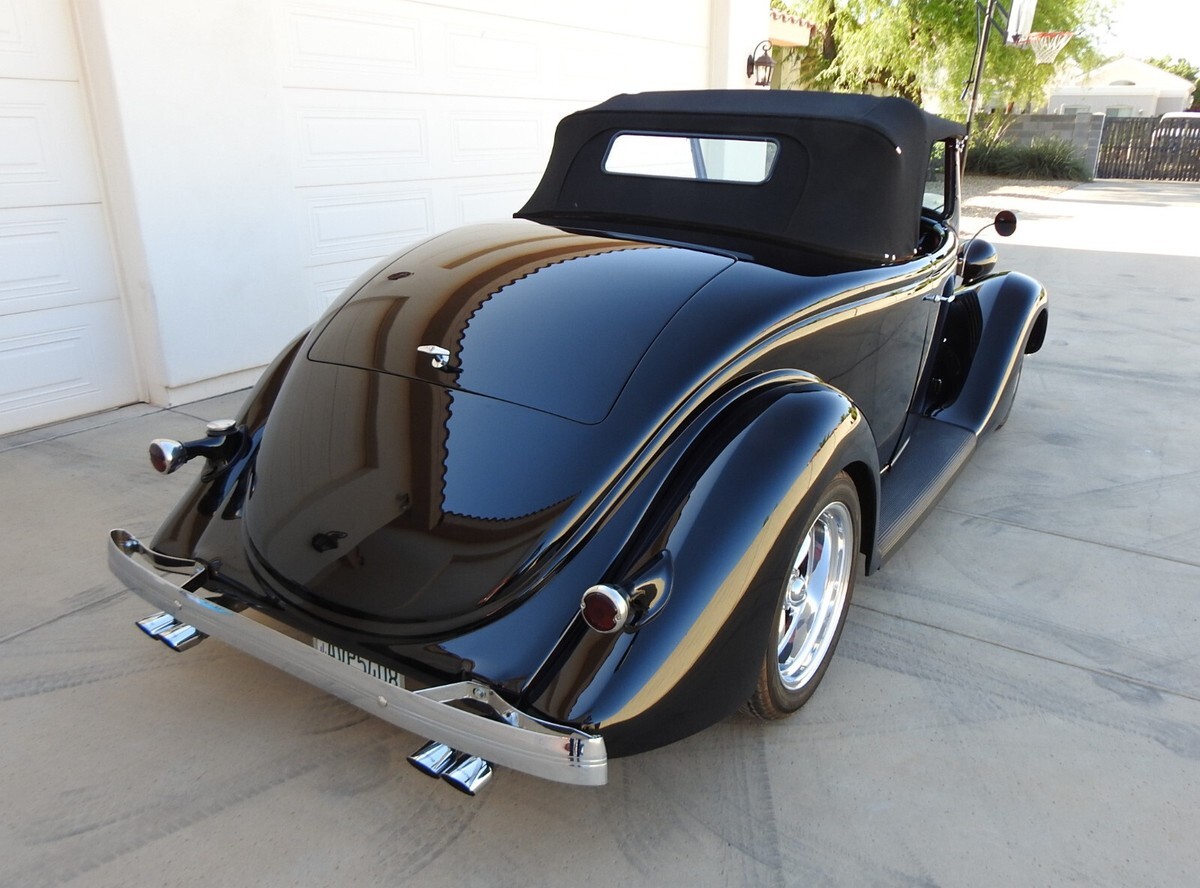 Early Ford roadster production numbers were well below the other body styles, and '35 Roadsters are some of the hardest to find. This '35 Roadster from this estate was built from the ground up, not a cosmetic built but one to keep and drive. And with only 882 miles showing on the odometer it is hardly broke in. All steel, no fiberglass on this ride. The jet black two-stage paint literally looks a mile deep. (If you break your bathroom mirror you can shave be looking into one of the doors!) Stock Roadster windshield posts, not chopped or laid back. Stock hood with stainless steel handles on both sides. Halogen headlights are set into stock headlights to light up the night.
