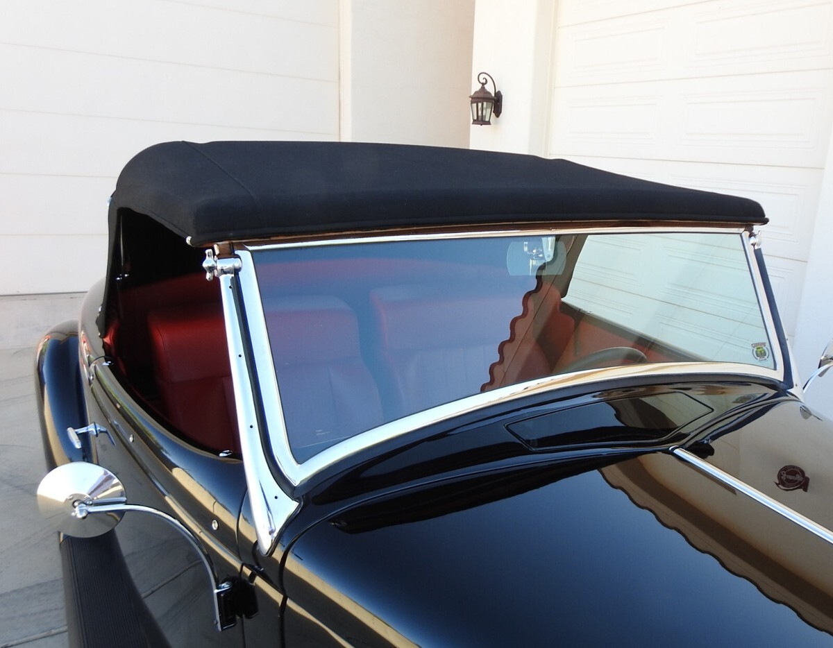 Black Hartz cloth top lays on chrome top irons and dropping the top is done with ease. Red leather covers the Harley Davidson pickup bucket seats and they are power seats. A Lokar shifter controls the Turbo 350 transmission. 1940 Ford dash was grafted into the Roadster with a full compliment of Dakota Digital gauges. Matching clock in the glove box door. The Billet Specialties Banjo steering wheel sets on a Flaming River tilt column that controls the Flaming River power rack & pinion steering. There is a package tray built behind the seats that is done in black. The trunk is stitched in the same red leather as the seats.