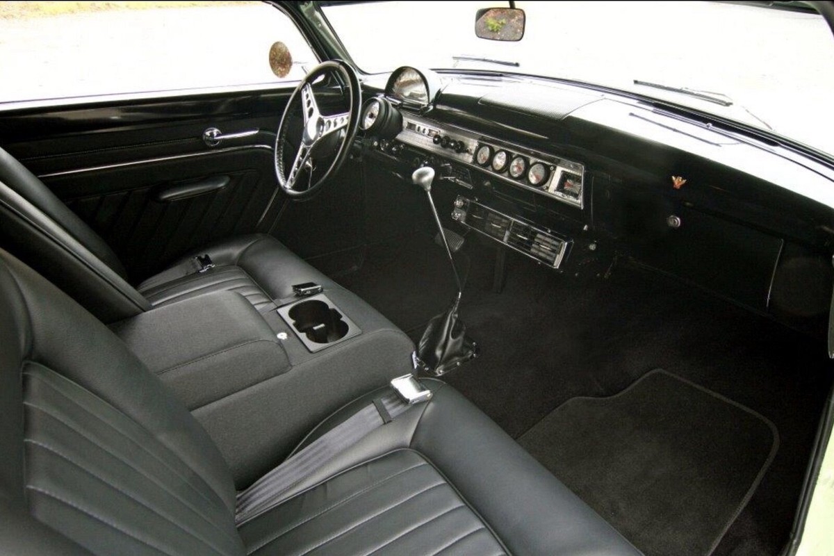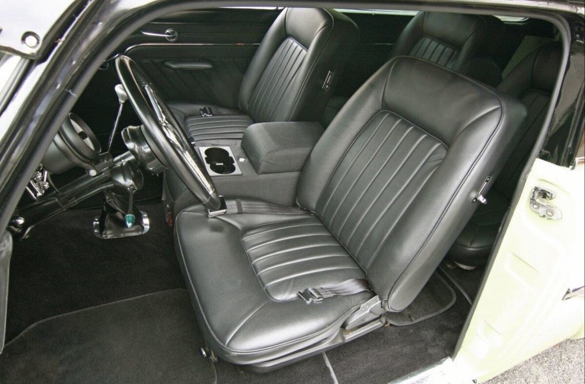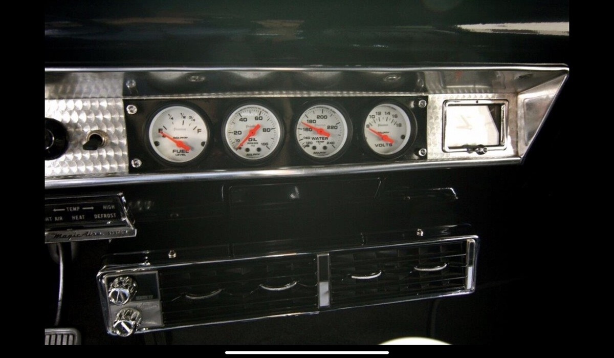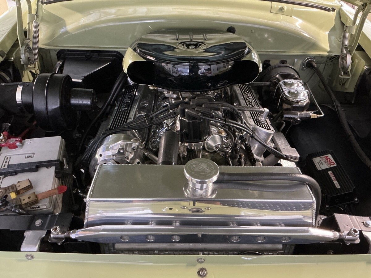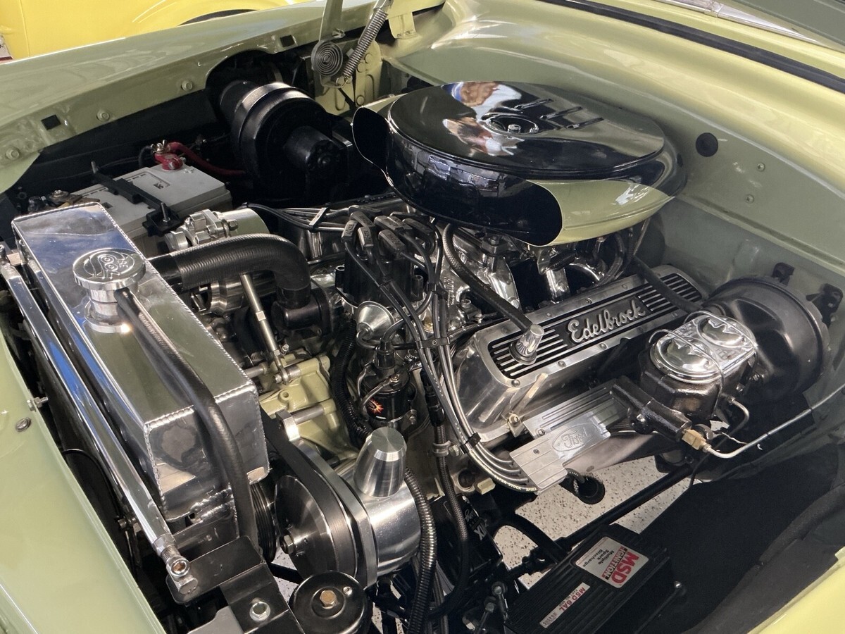 351 Windsor 350 hp motor, Chopped 5 inches shaved door handles front clip mustang ll by Fatmans, 4 wheel disc brakes AODE automatic 4 speed trans, Posi Rear 3.25:1, Edelbrock Al heads, cam,polished manifold, 4504 carburetor, manual choke, March kit alt,ac,ps,pulleys setup, Vintage Air AC, Custom BeCool polished radiator, headliner rugs side door panels replaced, Lokar shifter, Michelins, Halibrand rims