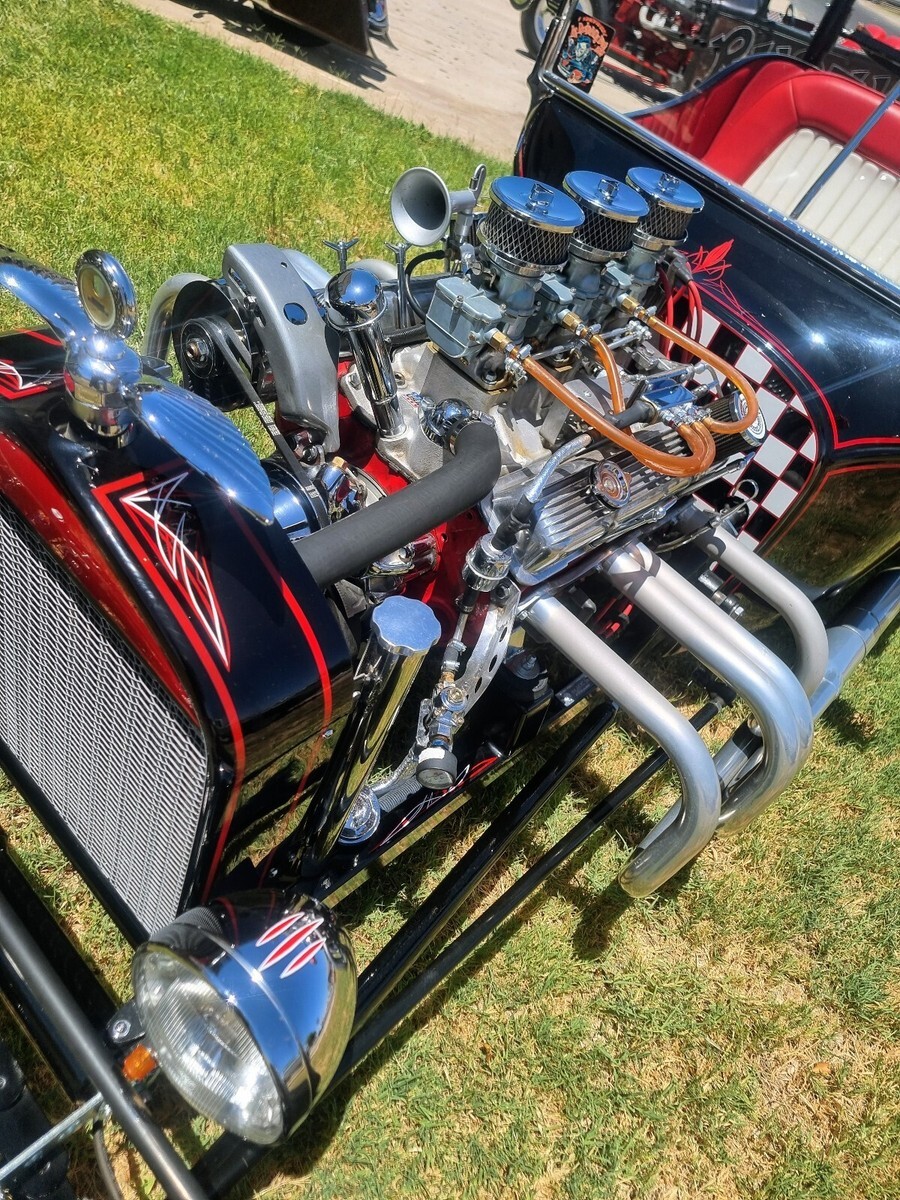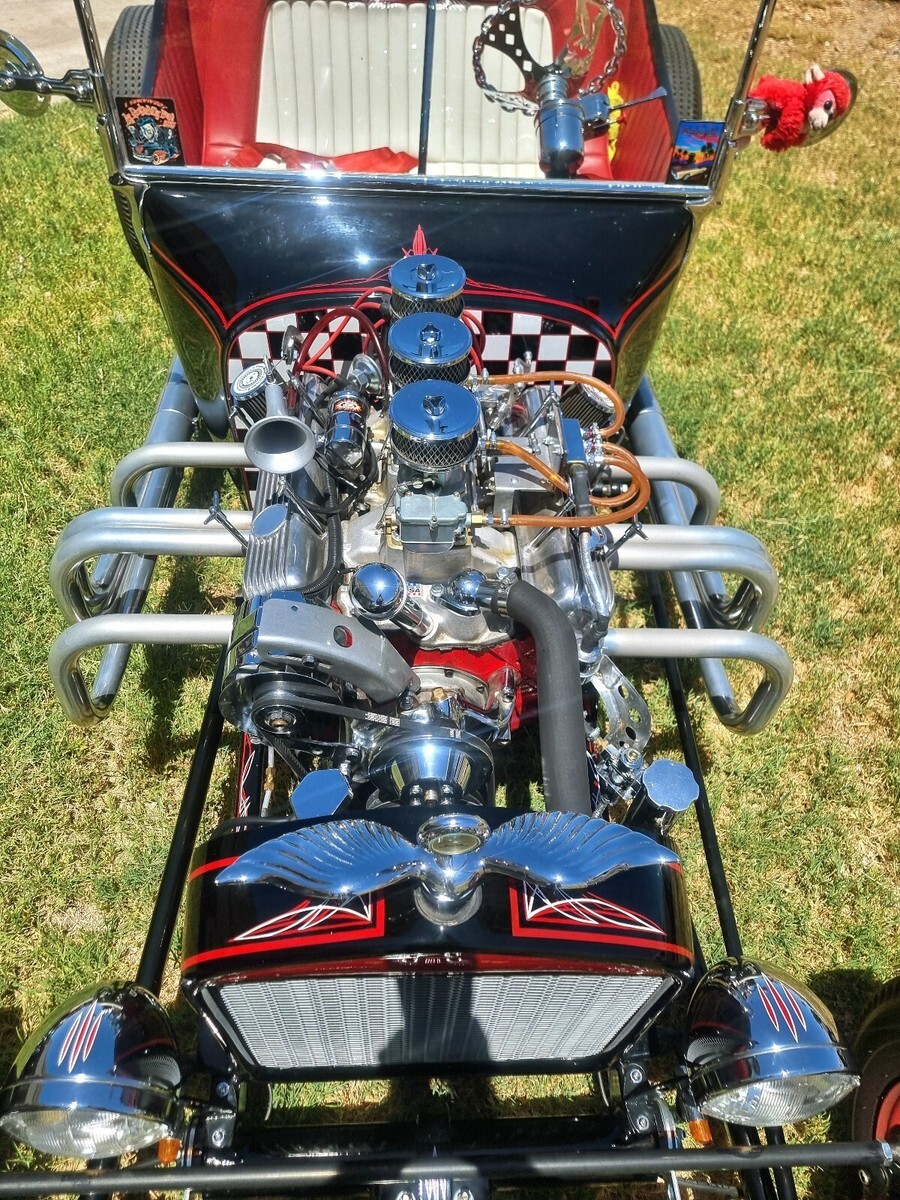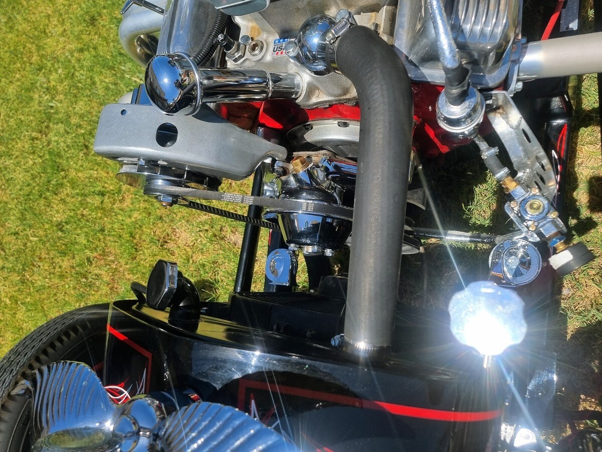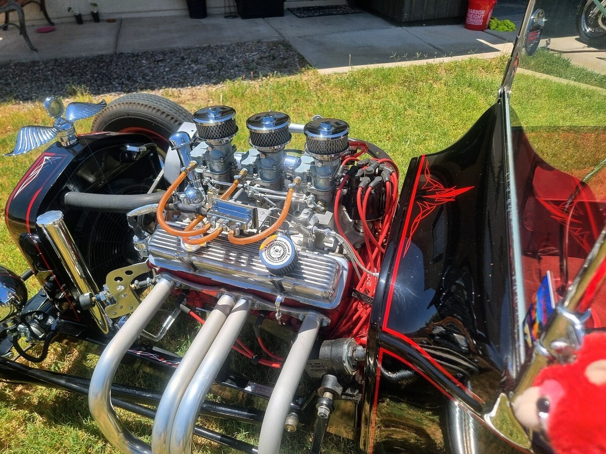 Powerful Chevy 350 motor with three synced up power hungry 2 barrel carbs. This baby is loaded with power, chrome, and more chrome. With the headers that allow that beautiful rumble. Automatic transmission with super cool shift lever. Wide white wall tires with the nice red smoothie old school wheels. As you can see, this baby is loaded with goodies. Will not disappoint and as it has for us, it's guaranteed to be a show winner!