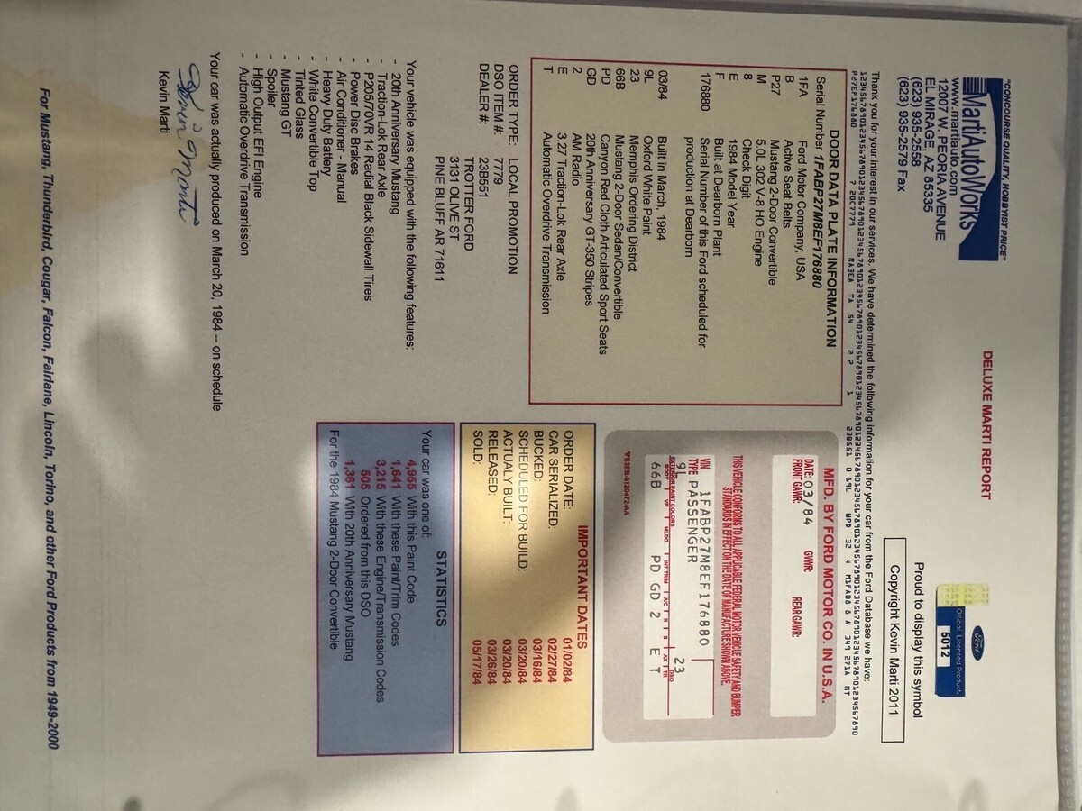 This is a 1984 mustang GT 350, 20th anniversary edition. I have owned the car 13 years and it’s a fun little driver that makes you smile when you put the top down. The car comes complete with a Marti report shown in the photos.