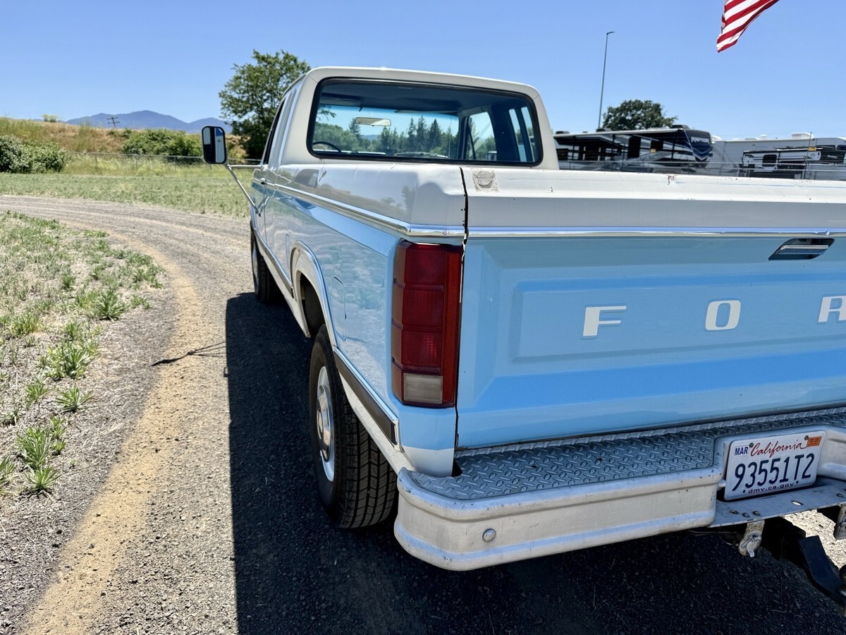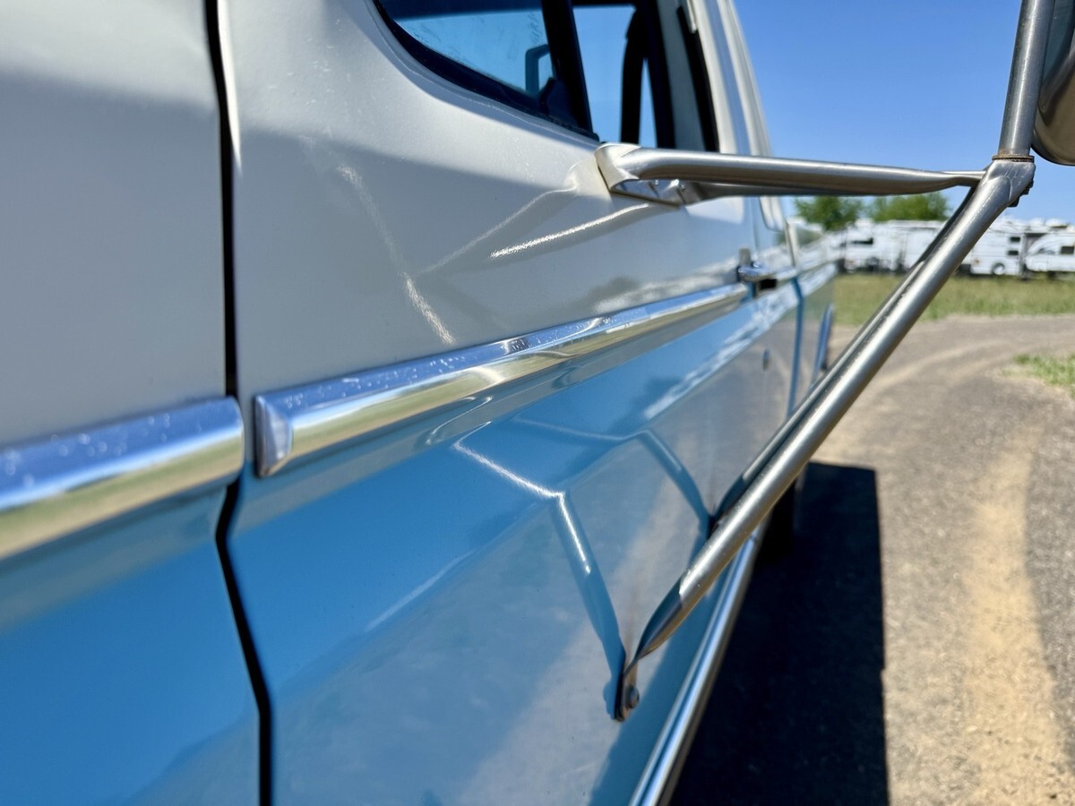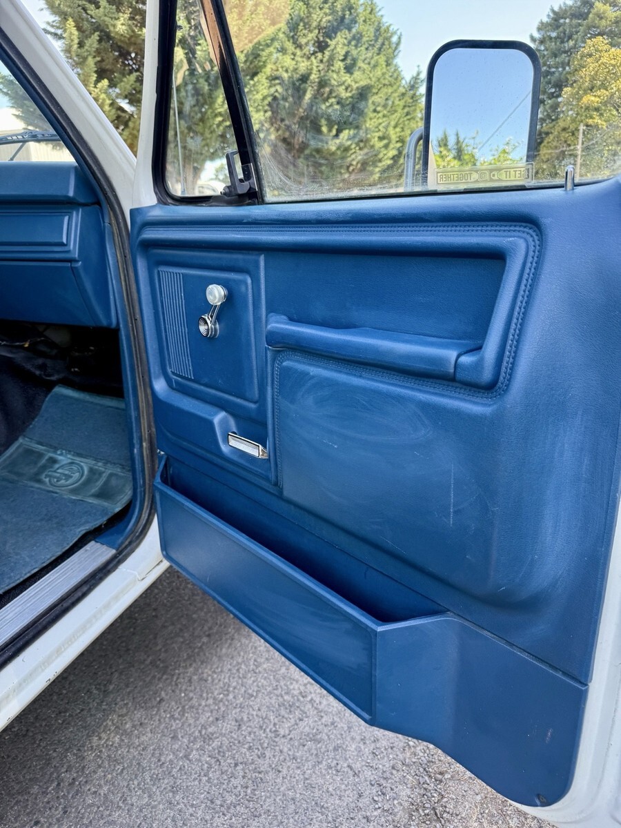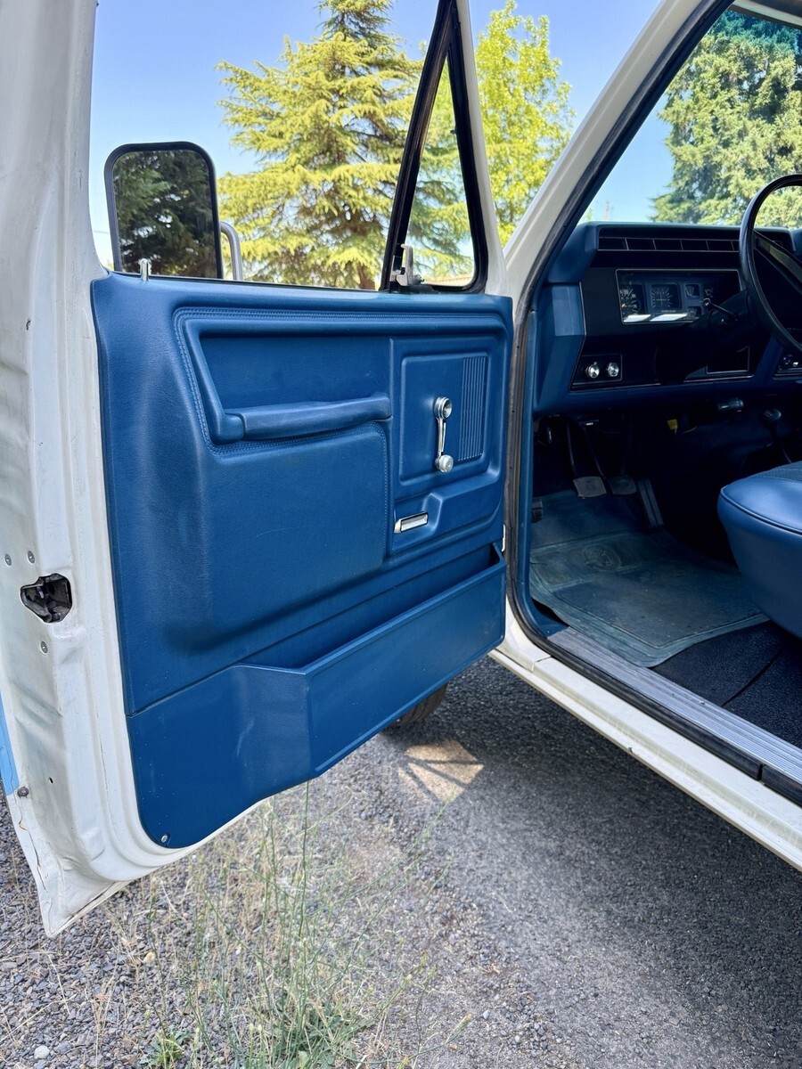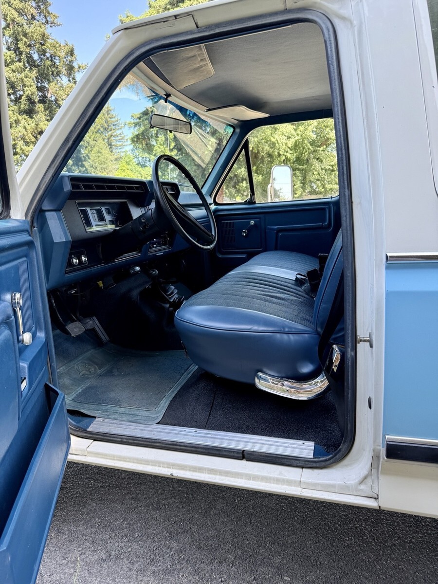 This 1983 Ford F-250 pickup is said to have spent time in Oregon and California before the seller’s 2024 acquisition, and it now shows 71k miles. Finished in blue and white over Dark Harbor Blue vinyl and cloth, the truck is powered by a 5.8-liter Windsor V8 that drives the rear or all four wheels through a four-speed manual transmission and a dual-range transfer case. It is also equipped with a receiver hitch, a chrome-finished grille surround and front bumper, 16″ steel wheels, a heater, rear jump seats, and a Pioneer multimedia stere