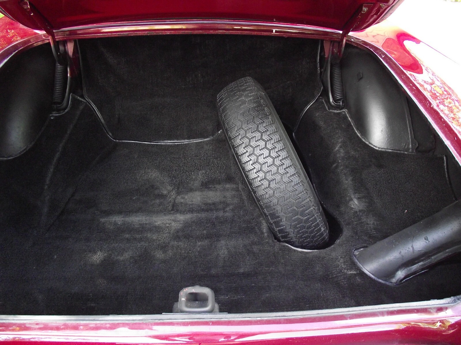 The Paint and Body shop had the soft top repaired and fitted. The hard top was fitted, received weather-stripping and new glass, windows, liner, and latches added, and top was painted the same Ruby Red as the car body. Also the body paint was touched up.