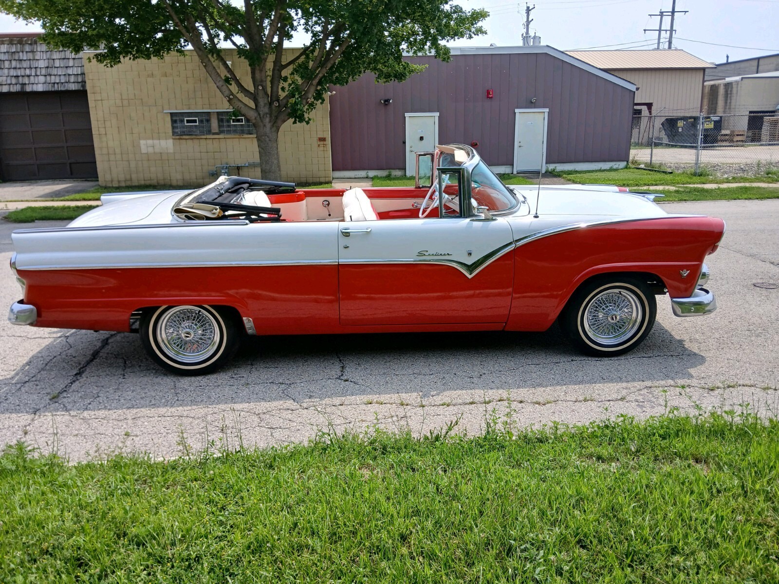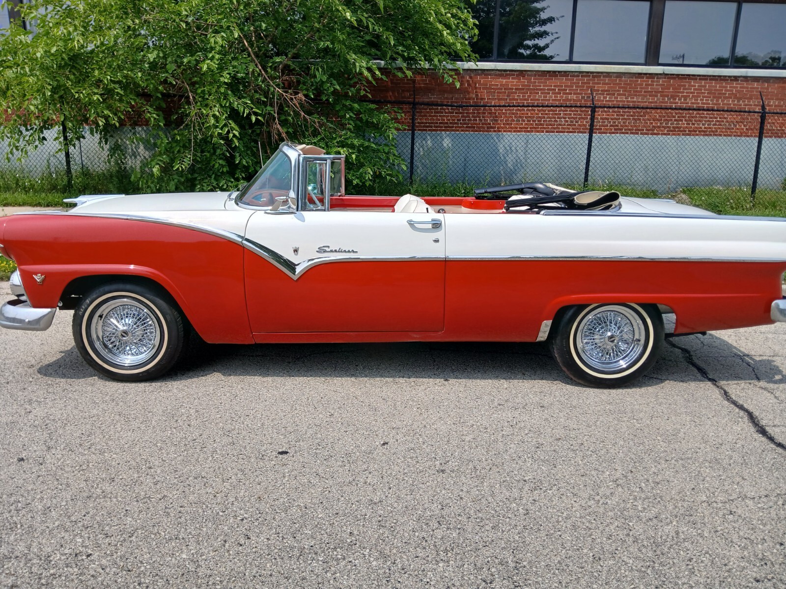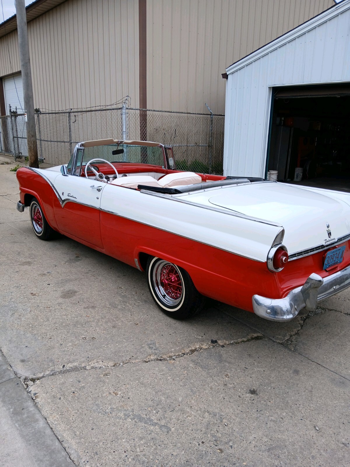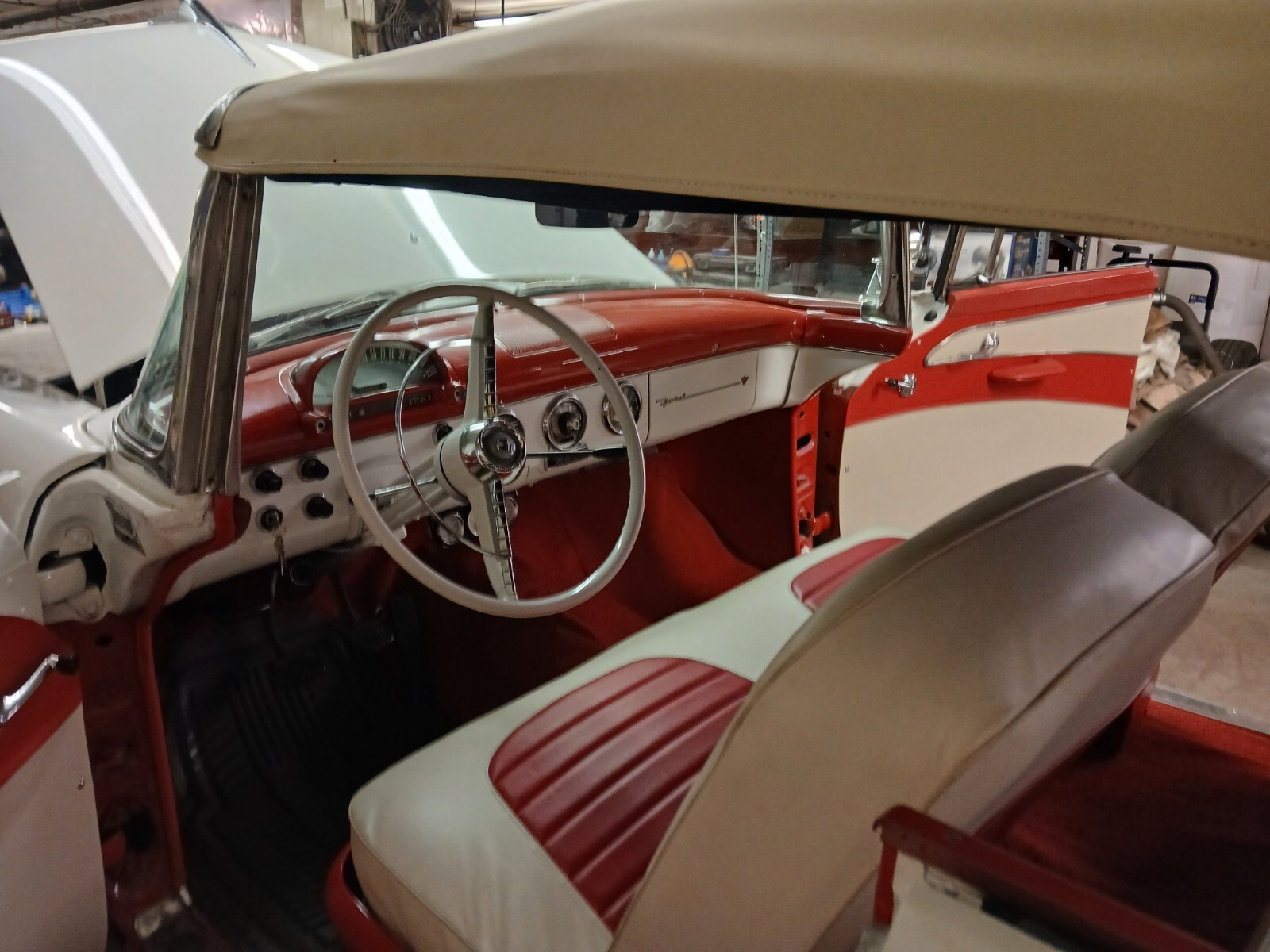 1955 Sunliner. Recent restoration. New top, pads, rear window and power top system. New interior, seats, carpet, door panels. V8 no power steering or power brakes. Three on the tree. Clean WI. title. 12 volt electrical system. Runs good drives good. Wipers, radio,heat, and speedo does not work. Chrome wire wheels with additional red baskets to change up the look.