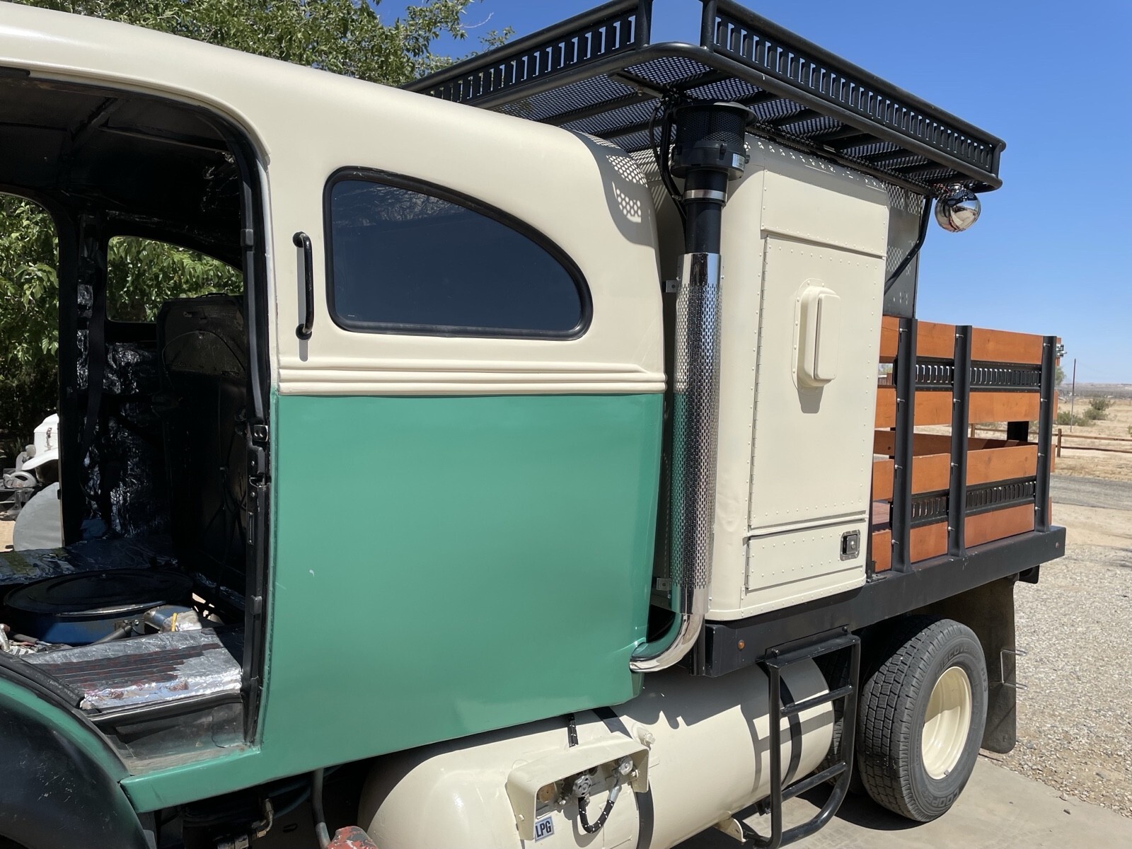 1980 F350 diesel chassis Dakota Digital Gages and controls, Vintage Air front A/C- Heater, power windows, Heated mirrors, nice stere, cruise contro, 1971 Lincoln 460 big block is Propane powered, C6 transmission, Borg Warner transfer case, Gearvendor overdrive unit, Dana 50 TTB front axle Dana 70 dually w/ limited slip rear axle 3.54 gears, Disc and Drum brakes with Hydro booster all heavy duty built for towing camping or fun, rear Sherpa 25,000 pound winch and 12 Volt air conditioner for the sleeper. Two 73 gallon LPG tanks. Two Optima Batteries. Two large toolboxes and spare behind Aluminum sleeper. Cedar tongue and groove 6’ bed with 3’ sides that remove and store on top rack when towing gooseneck trailer