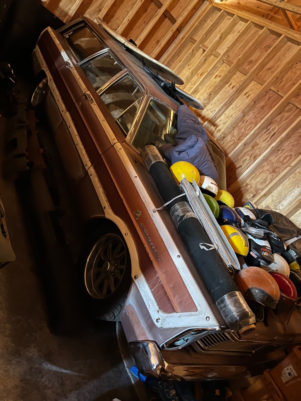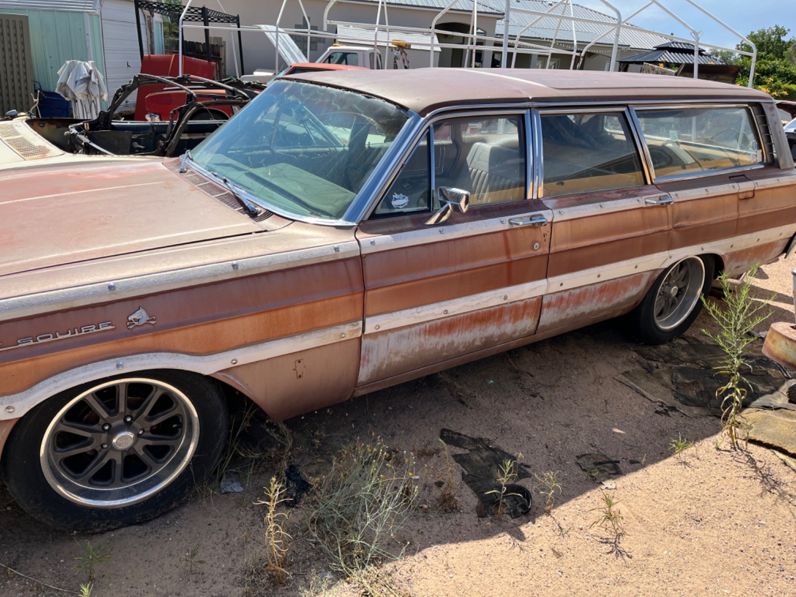 Up for grabs is one 1965 Ford Country Squire station wagon 98% rust free, floors are like new never any rust I installed killmat sound deadener and new carpet kit. It’s been converted to 4 wheel disc brakes and it has brand new US mags 18”-8 in the front and 18”-9’s in the rear . I have a new headliner for it it will need to be installed. It had a 352ci automatic I took that out and bought a bb ford C-6 HD transmission for it but it will need an engine I was setting it up for a 429 or a 460 power plant. Clean title in my name . Really cool wagon that I will never get to it so my loss your gain type thing . I will be adding more pictures as soon as I can. I will entertain 5000 without wheels and tires And also the surfboards do not come with the car. I was going to build it like the picture with the rendering . I already slammed it but not to low it has a very nice stance . Oh and I do have the roof rack and it’s complete and nice condition