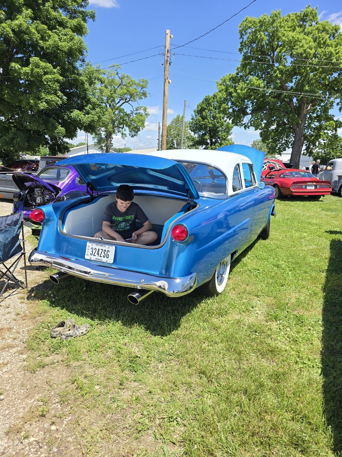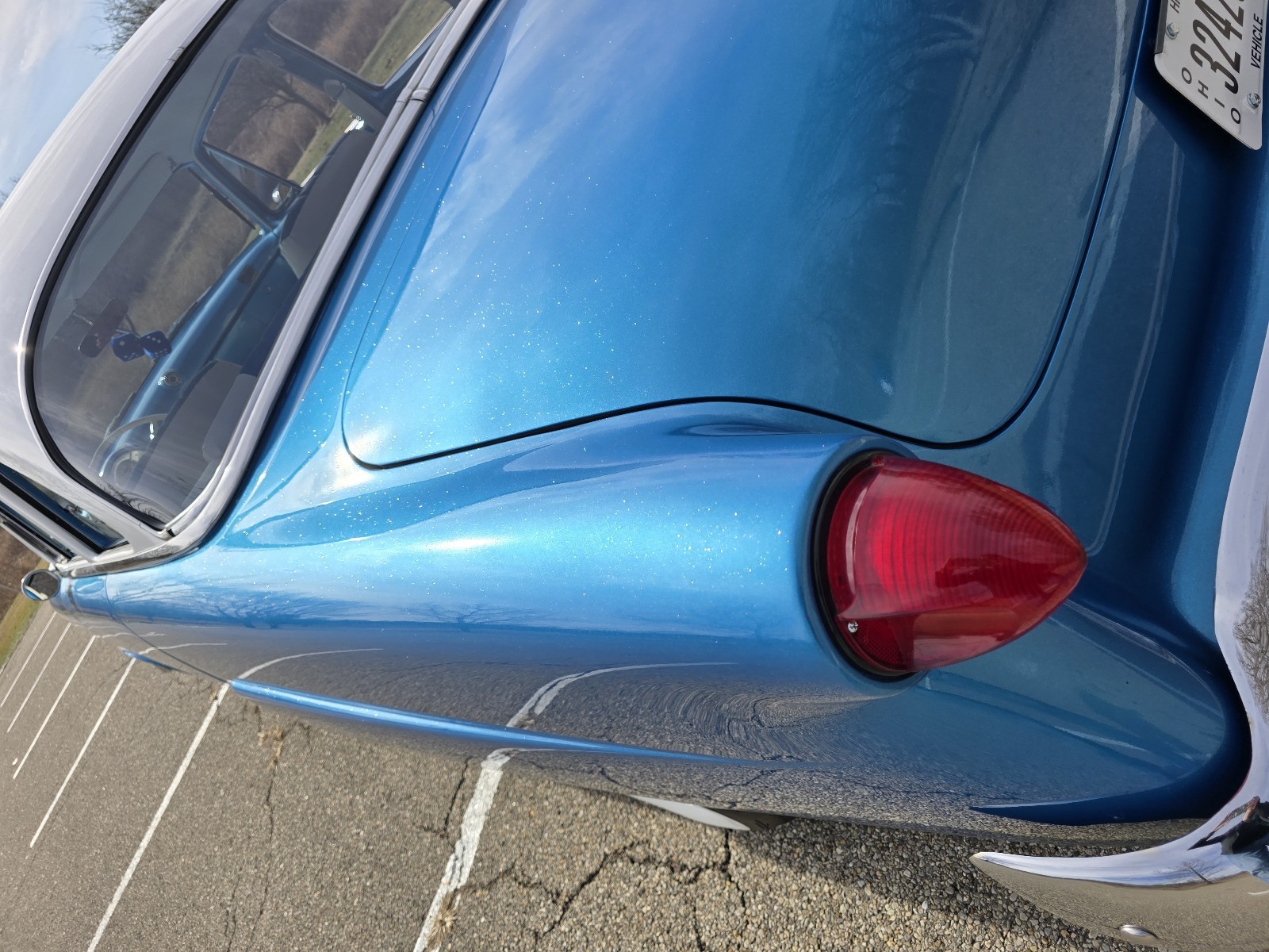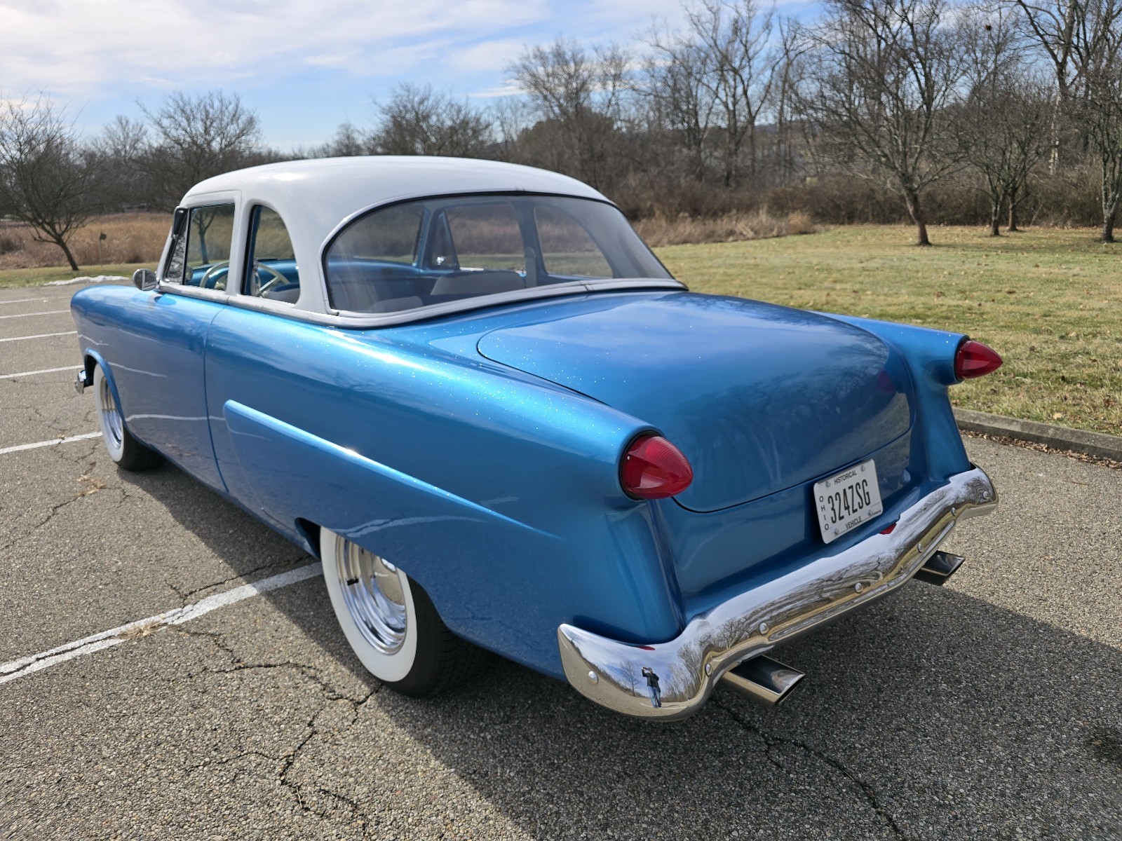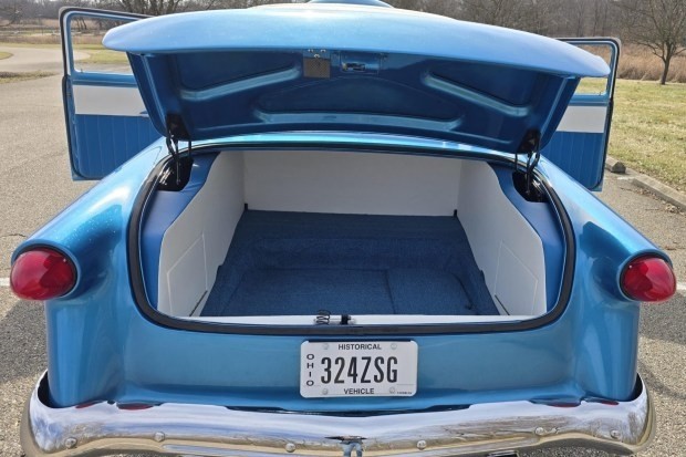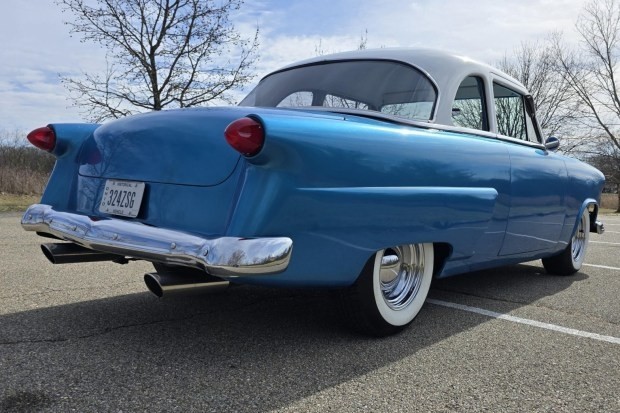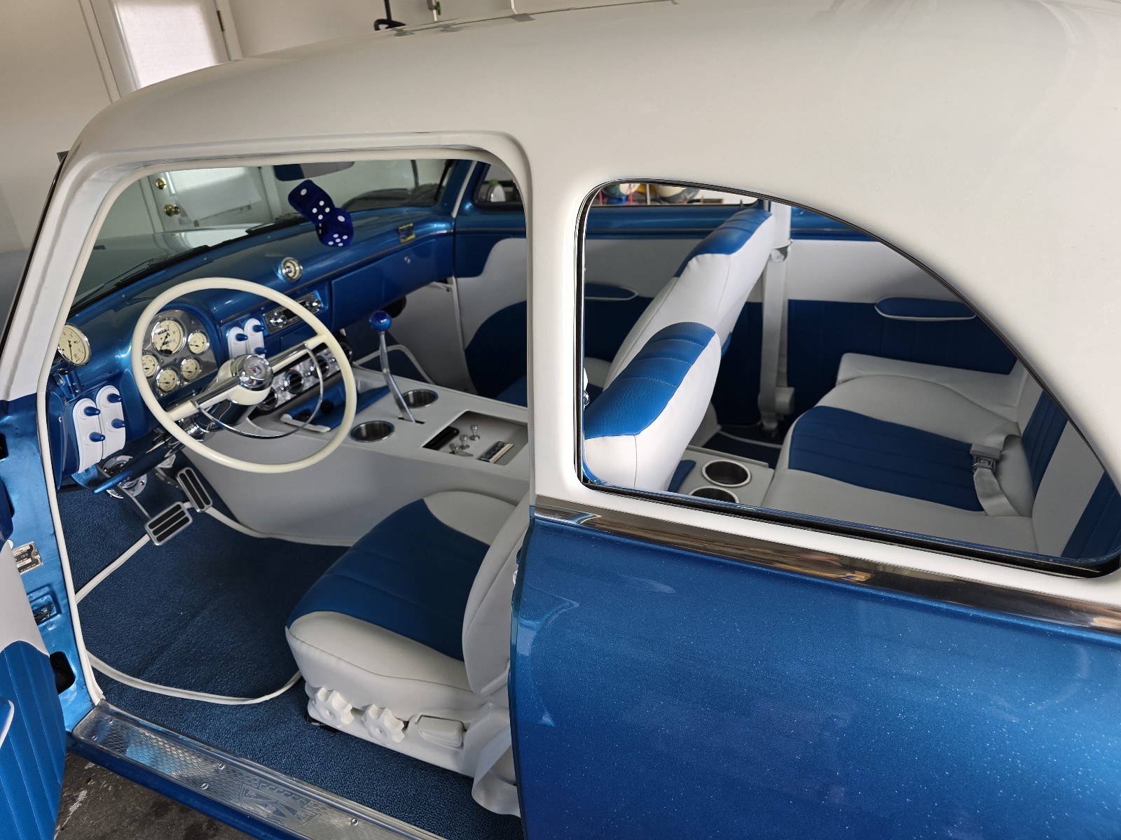 Work consisted of custom body modifications and a new custom paint in blue and white pearl with metallic flake, re-trimming the custom interior, lowering the suspension, adding power disc brakes, and installing a 351 Windsor V8, a Ford AOD overdrive automatic transmission, and an 8.8″ rear axle with a limited-slip differential, 31-spline axles, and 3.73:1 gears. It also has chrome smoothie-style wheels, a billet serpentine drive system, ceramic-coated headers, Flowmaster mufflers, and an Edelbrock intake manifold and a 650-cfm carburetor as well as Vintage Air climate control, a Bluetooth stereo, AutoMeter instrumentation, and power windows.