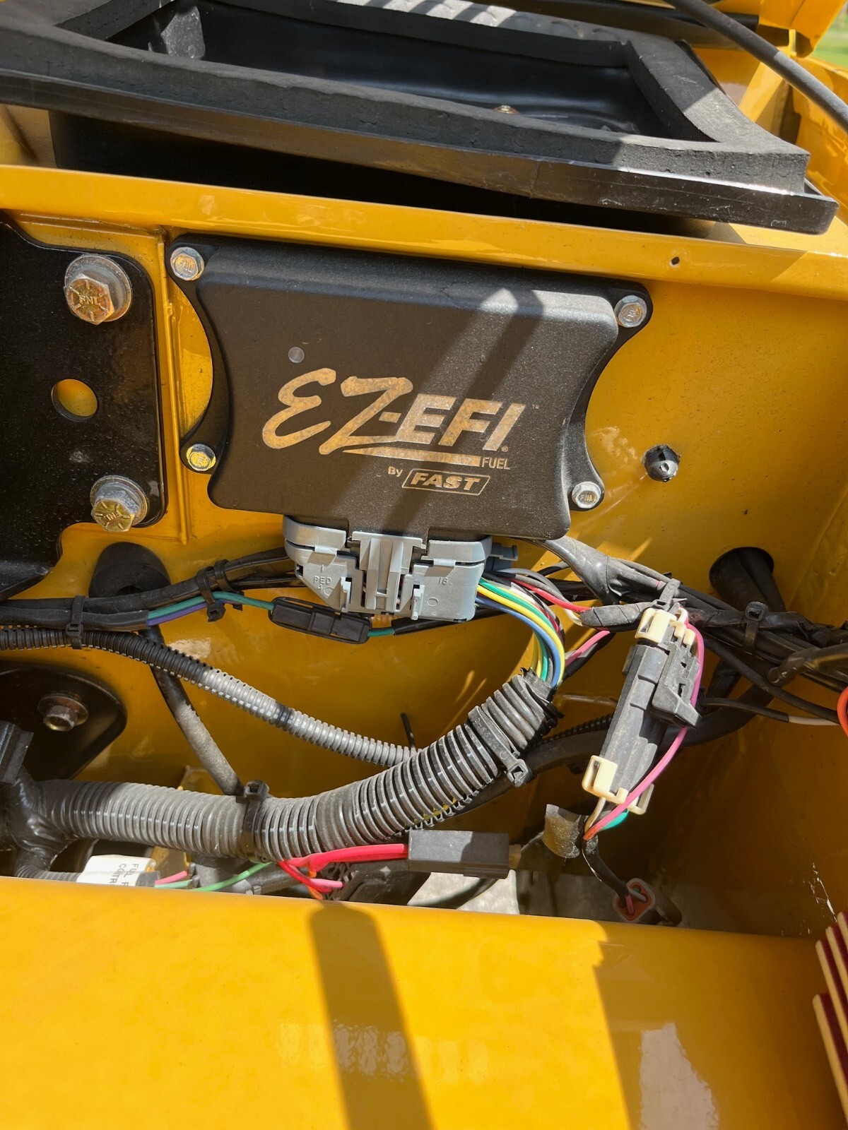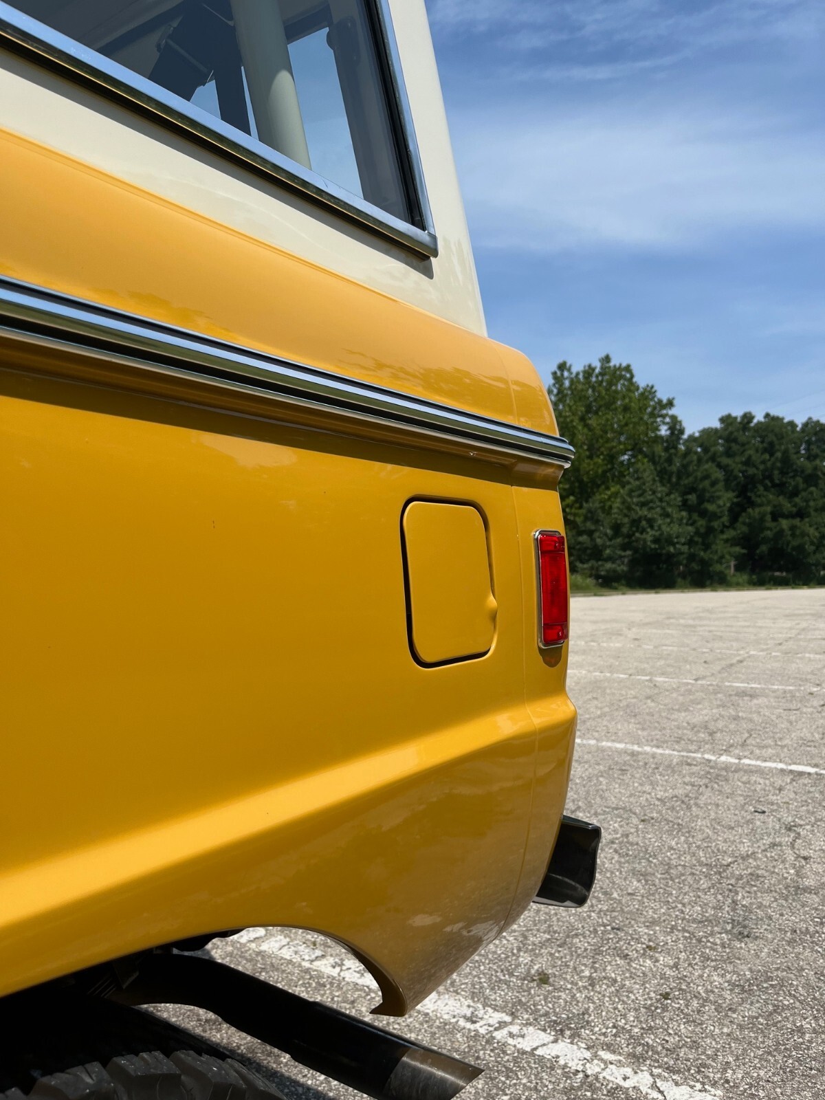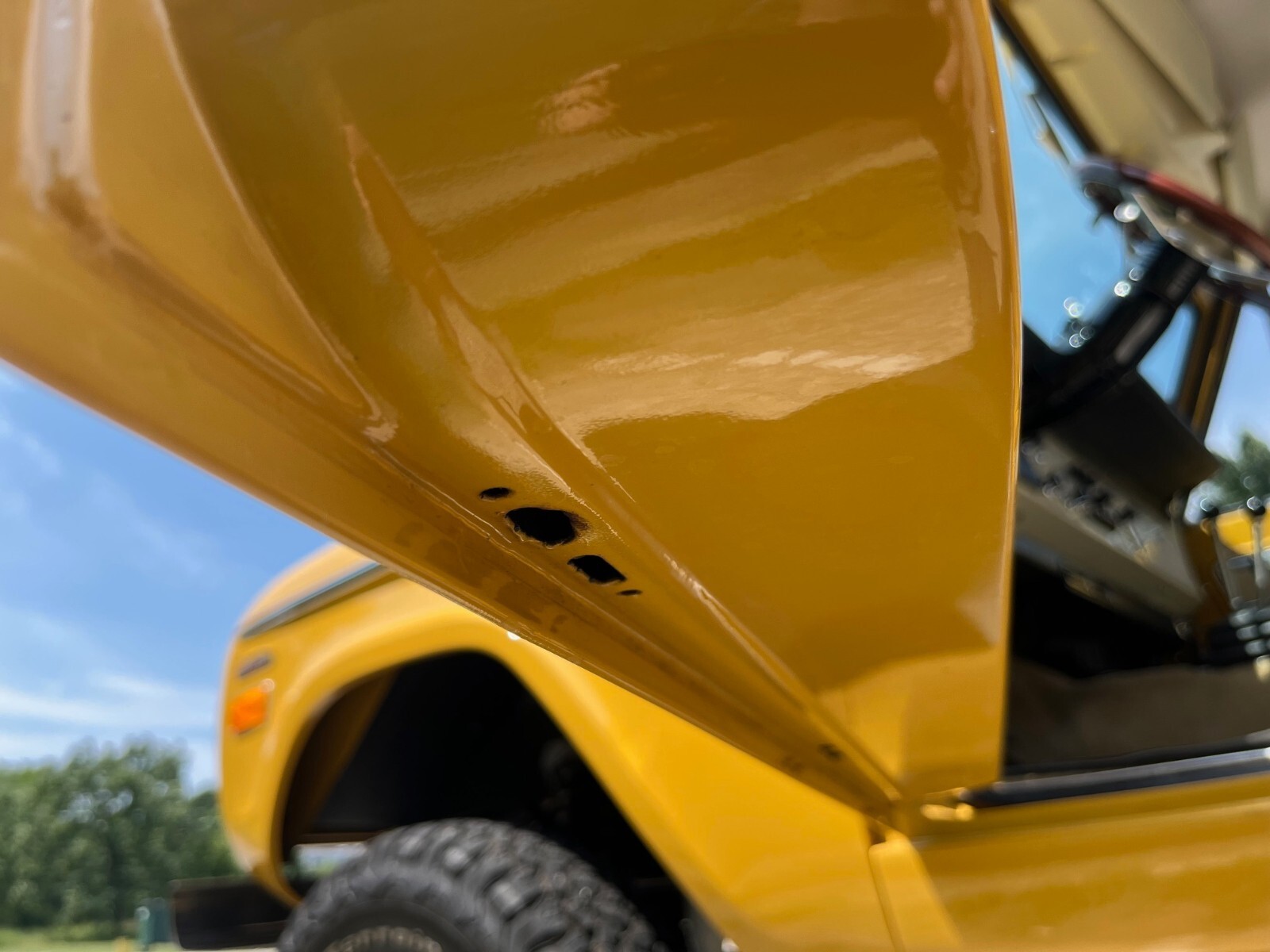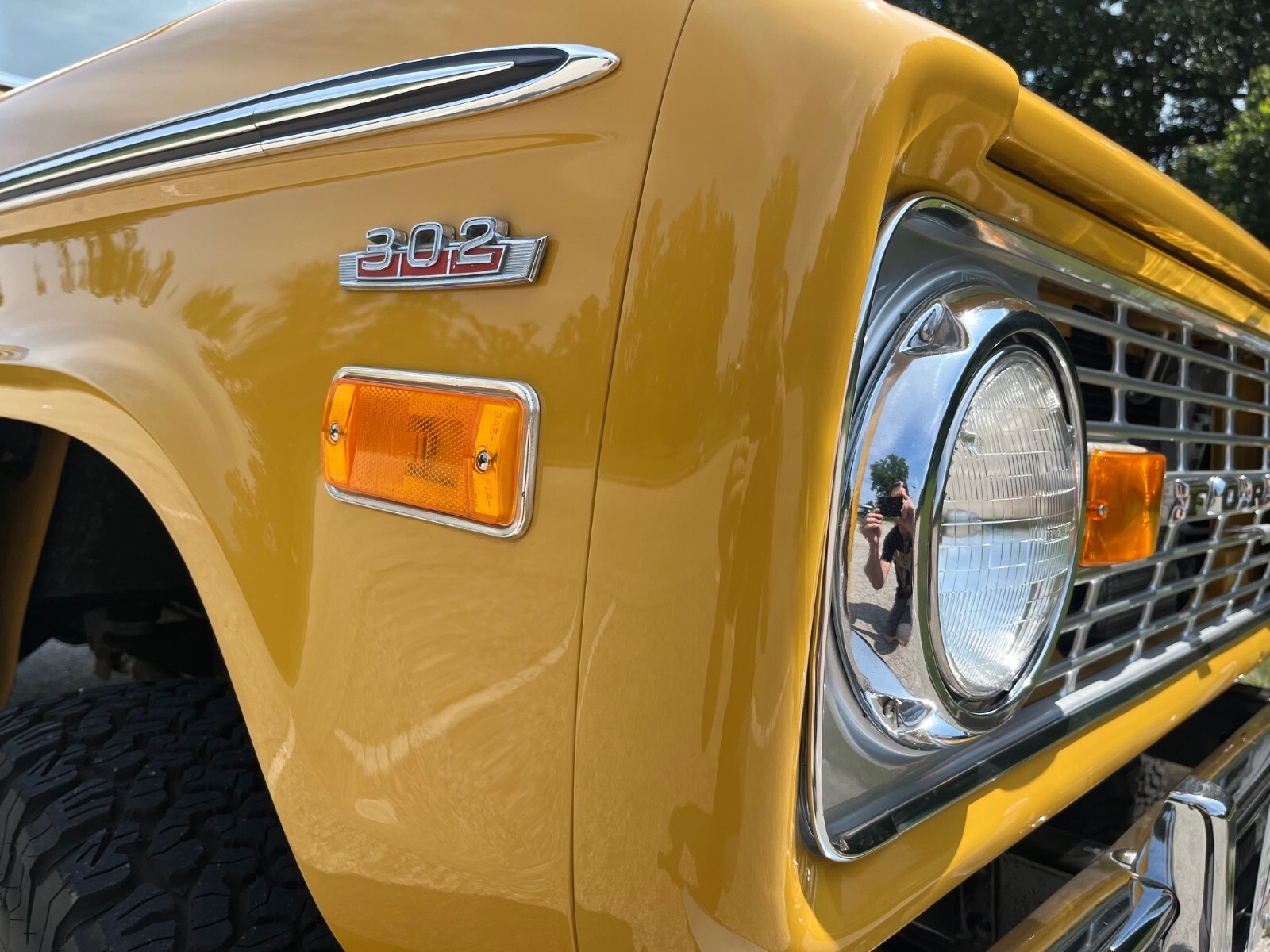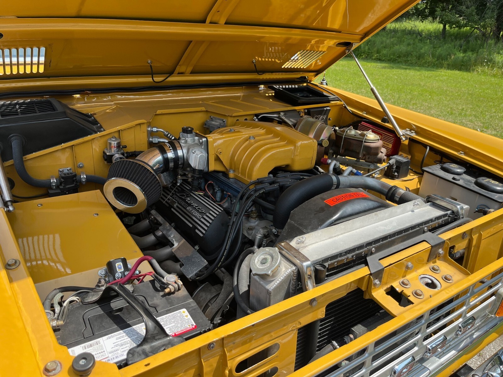 Vehicle is powered by a rebuilt 302ci V8 crate engine. The 120 mph instrument cluster and odometer shows just over 3,500 miles since rebuild. Fast fuel injection system provides efficient fuel delivery. A single 24 gallon B.C. Broncosfuel tank replaces the original dual tanks. Enginecompartment upper intake is paint matched in Prairie Yellow. Engine is mated to a rebuilt Ford AOD automatic transmission and a twin-stick two-speed Dana 20 transfer case.