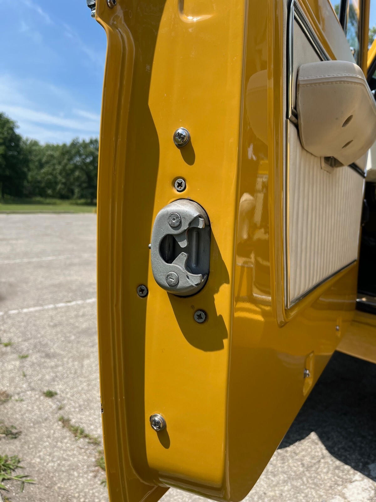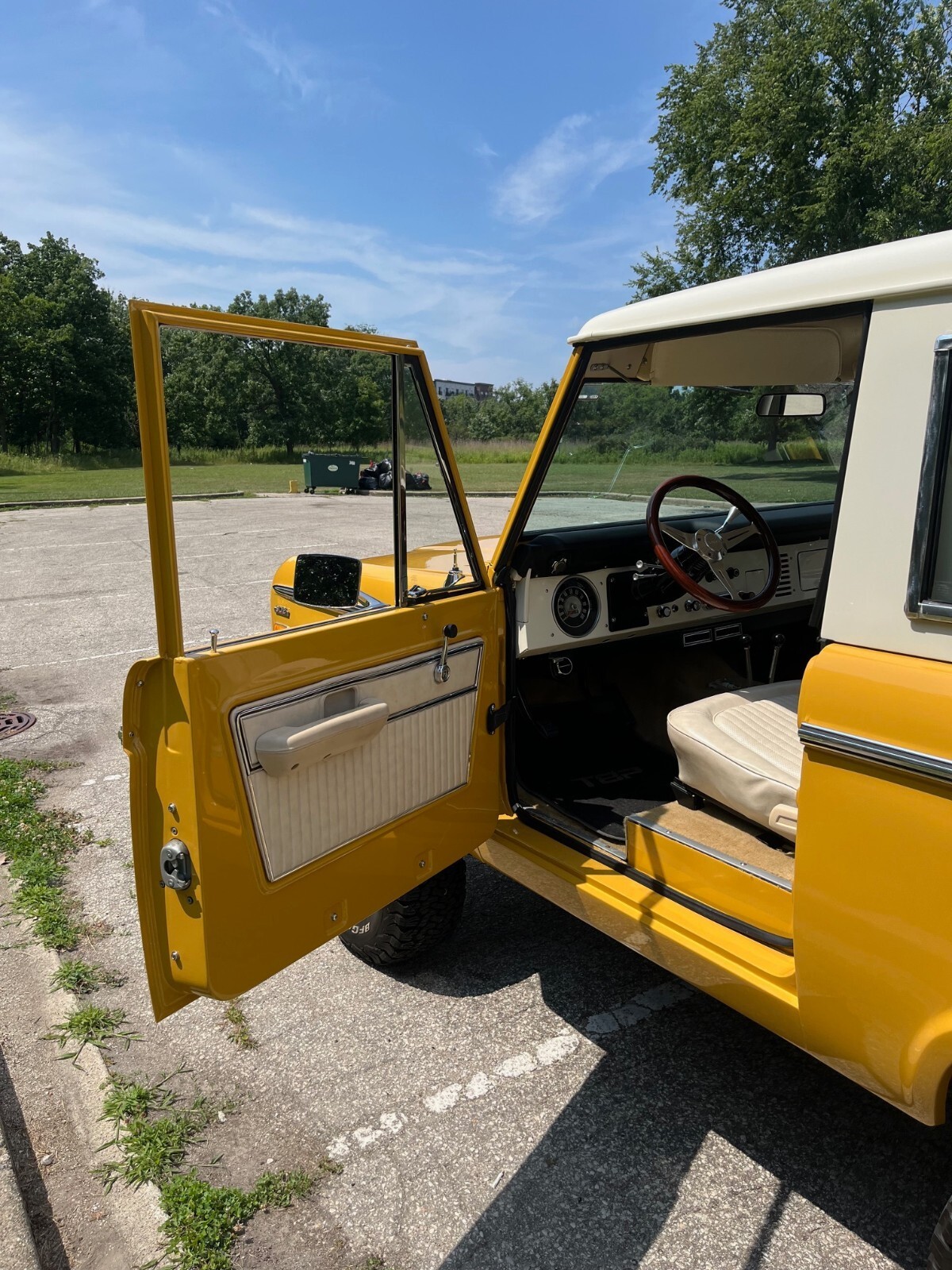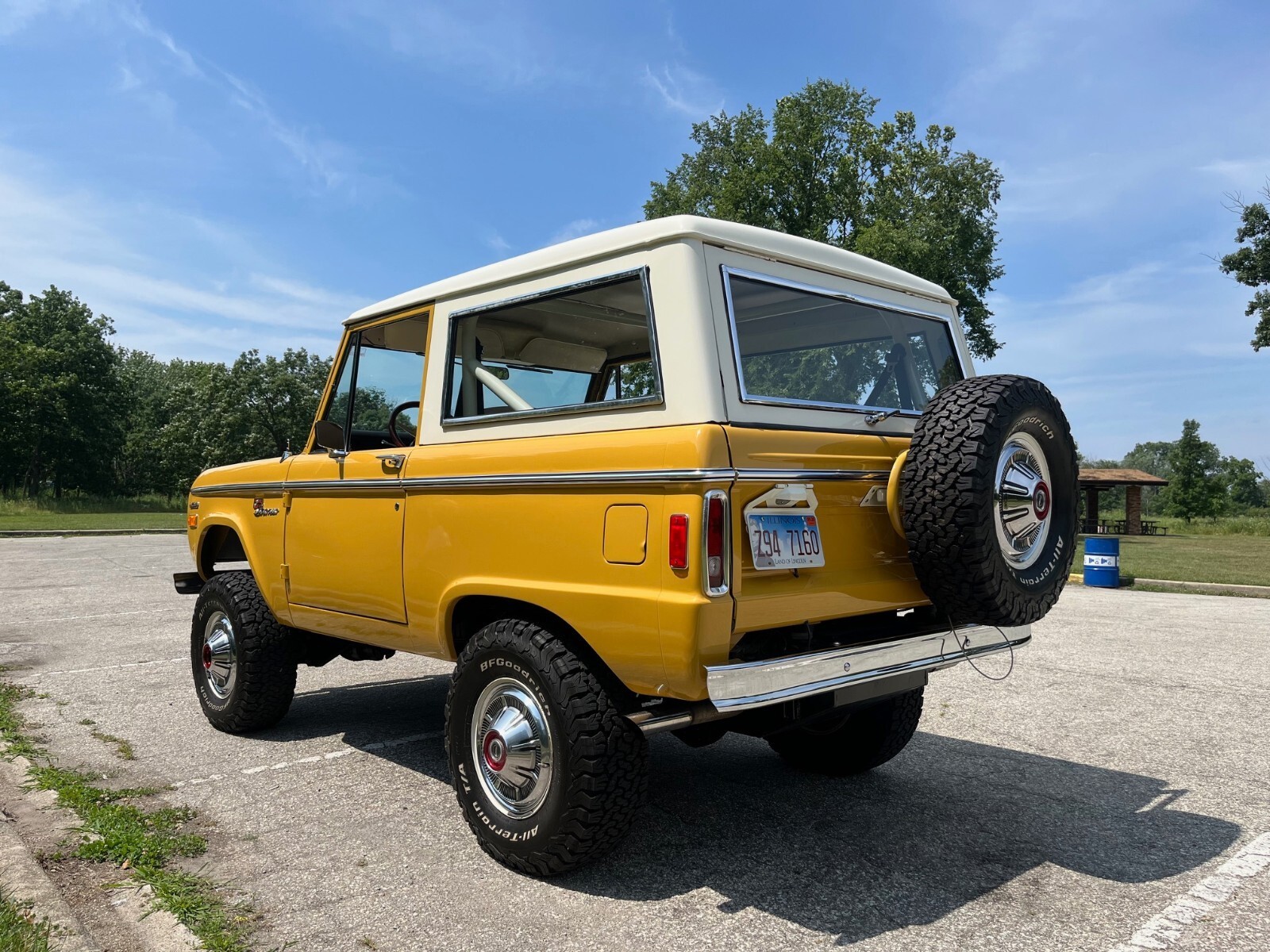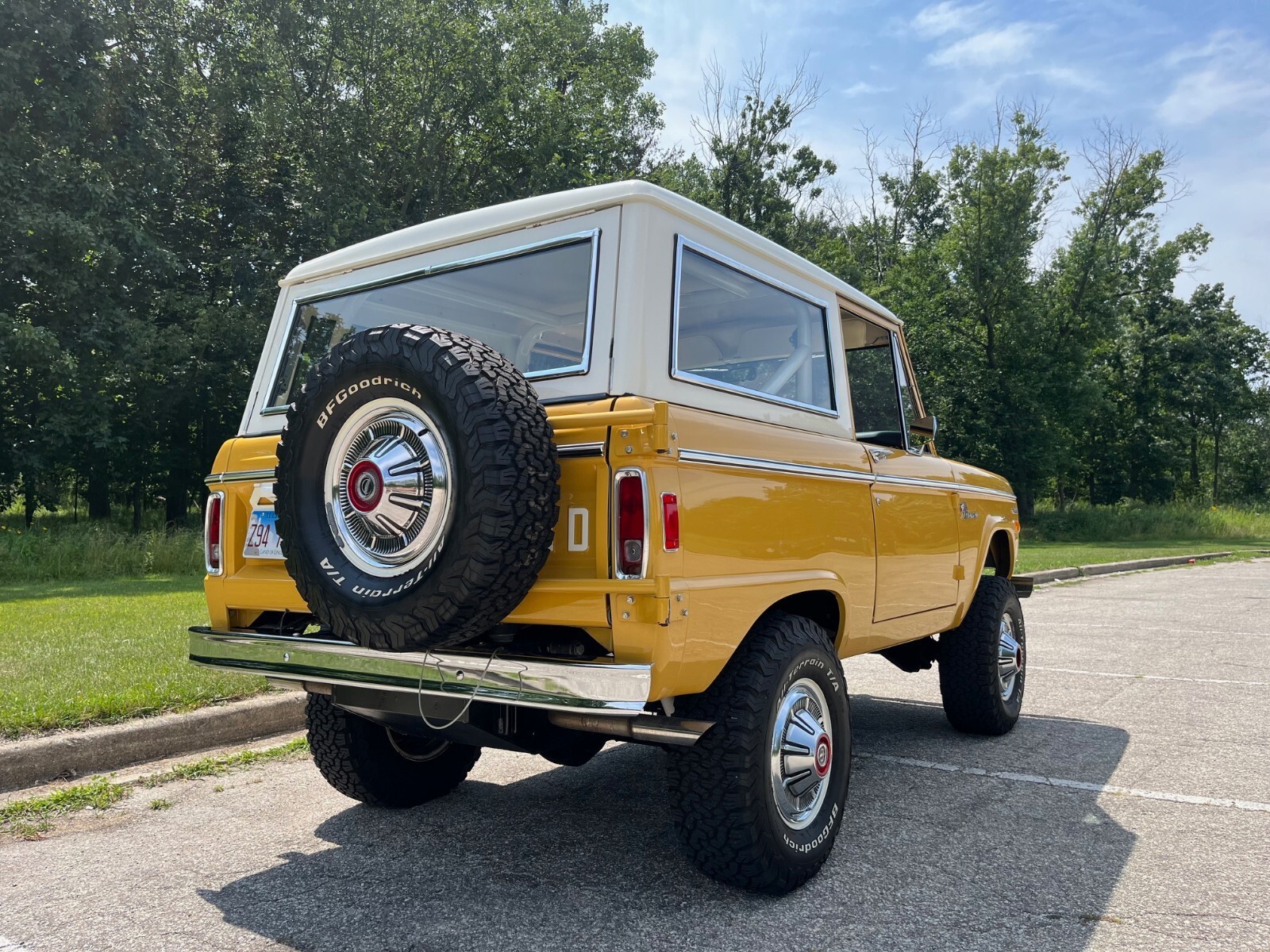 1969 Ford Bronco paintedfactory Ford Prairie Yellow. Grille insert was painted factoryFord Argent Silver.The hardtop was painted Ford Wimbledon White. Afull, frameoff, rotisserie restoration was completed in 2014 by Early Bronco specialist, Bronco Connection of Norfolk, Nebraska. Ford 15" wheels received original style hubcaps and ride on 31 x 10.50 x 15" BF Goodrich All-Terrain T/A radial tires. A full size spare is provided on the swing out tire carrier. The windshield and hardtop windows received factory stainless trim accents, the body has the factory Sport beltline trim, the bumpers are factory chrome with front bumperettes. The hardtop has never been removed since the restoration.