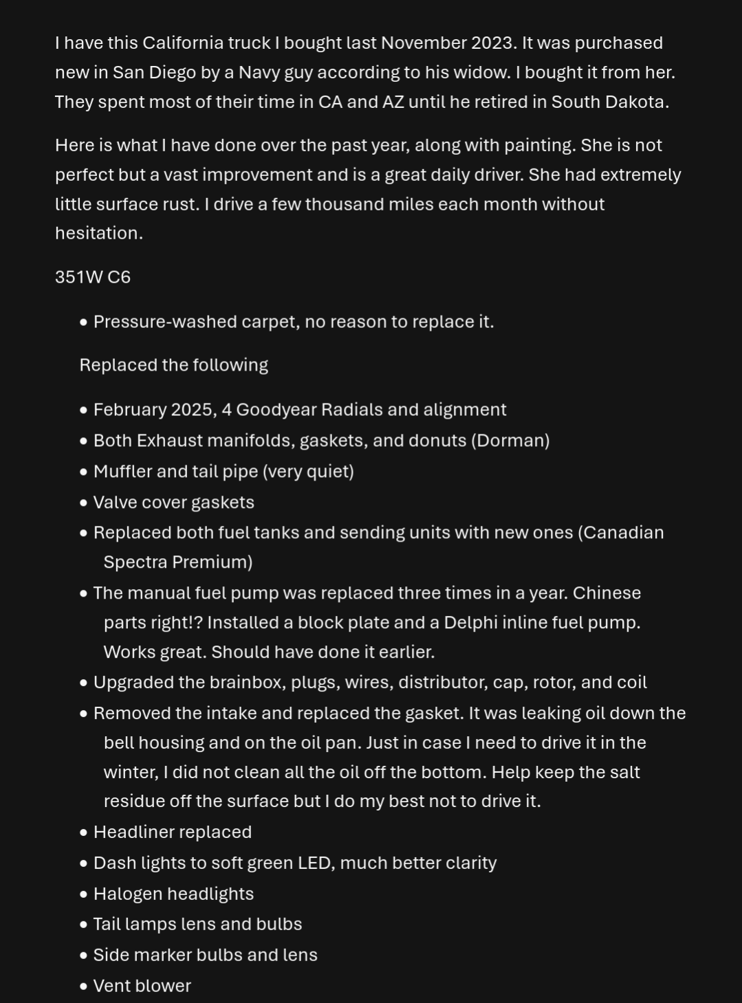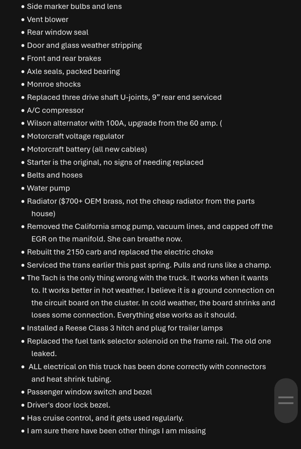 I place the majority of the information list in the photos. It is my daily driver. I drove it from South Dakota to Florida and back. She is very dependable and would make someone an excellent first truck. I am selling because I don't need two trucks.
