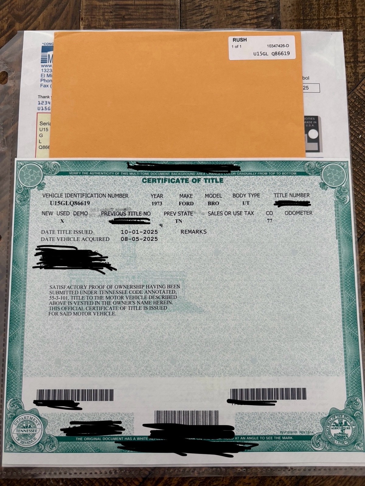 This is a clean title, vin tags, Marti report, and bill of sale only. No body or frame because it was not savable.