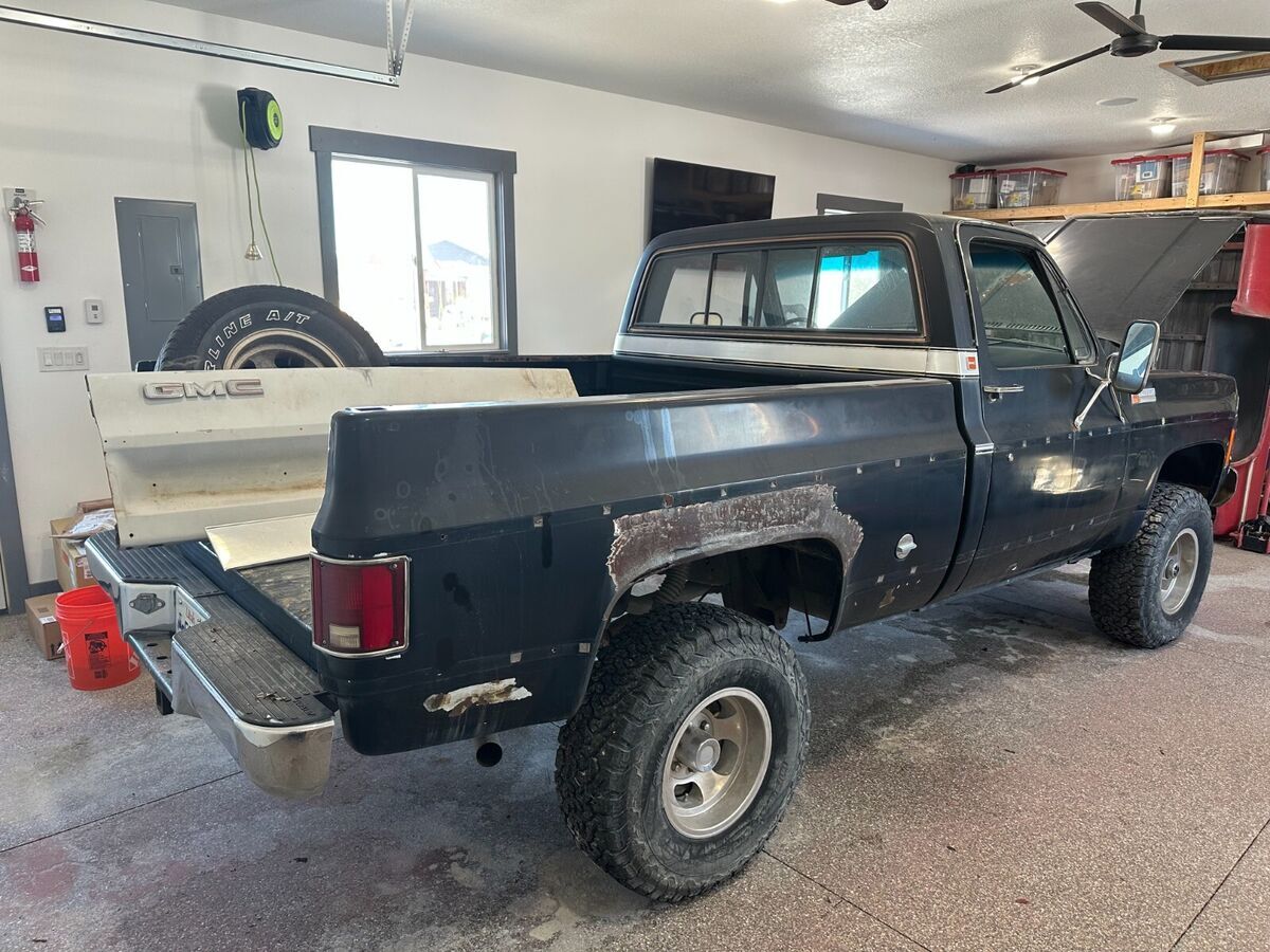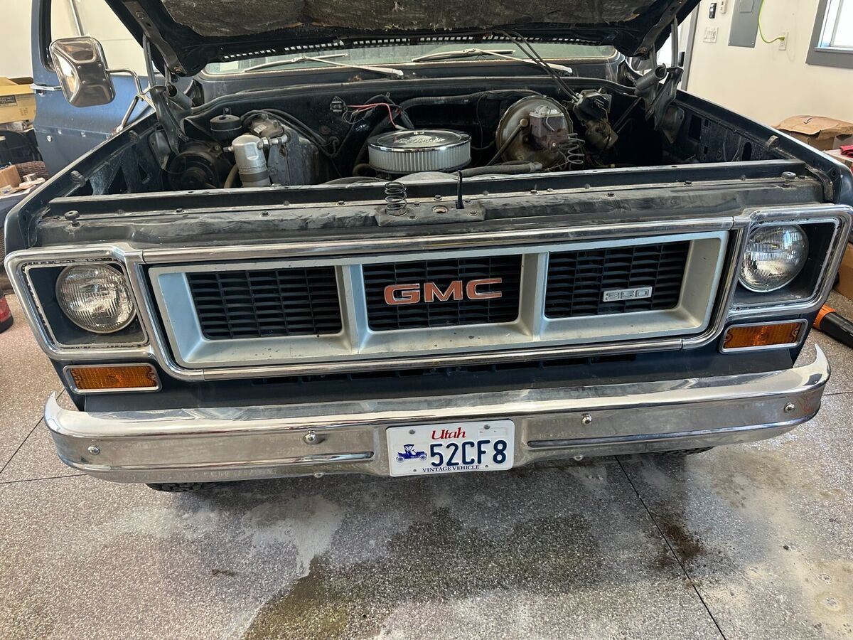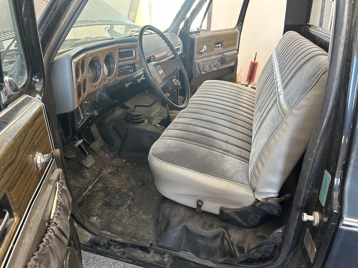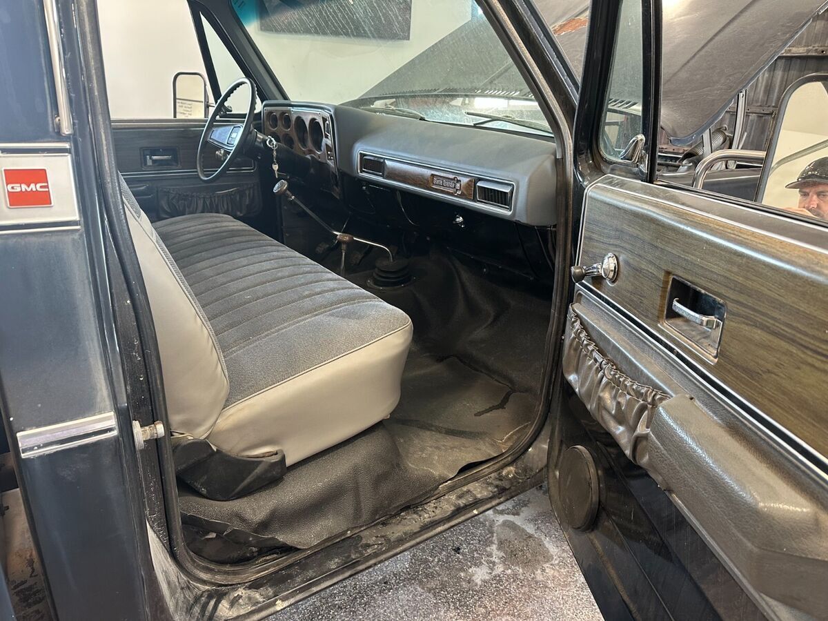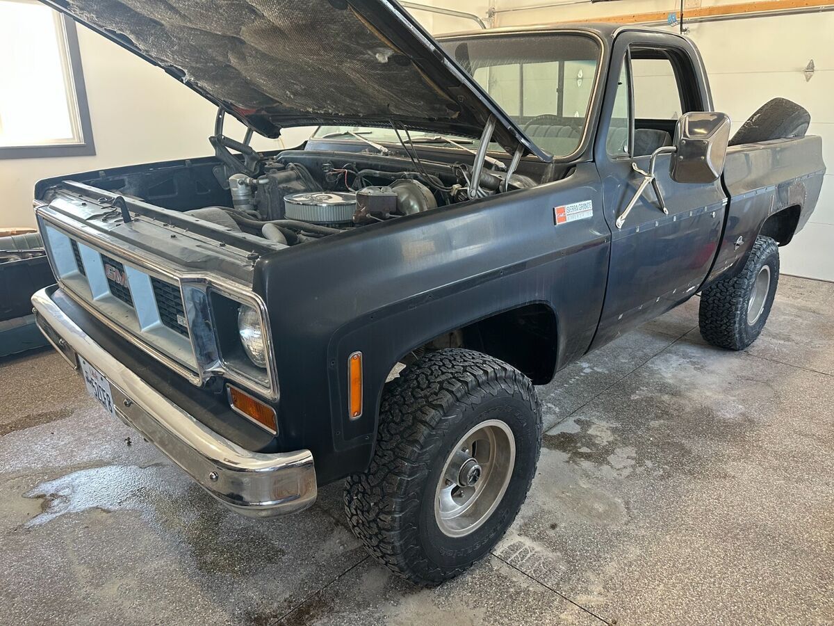 1974 GMC Sierra Grande 4X4 inblack (rare). I am the second owner. How many of these are out there? Under the hood is an SBC 350 with approximately 20k miles installed by the previous owner. In the last 3 years, new complete dual exhaust with flowmaster mufflers and ceramic headers installed, rough country 2-inch full suspension left, braided brake lines, steering stabilizer, seat recovered and new flooring. Selling with several new in box parts including twofuel tanks, woodgrain dash bezel, and exterior trim. This is a one-of-a-kind, highly desirable black in color, second owner truck.