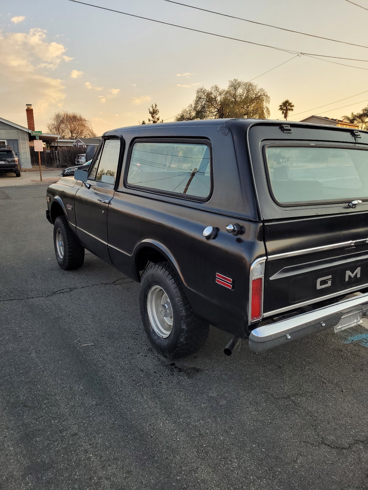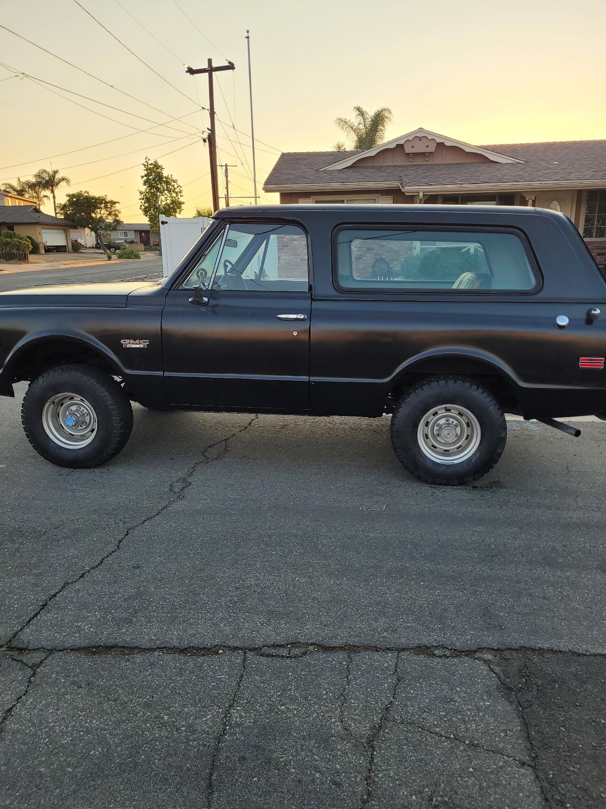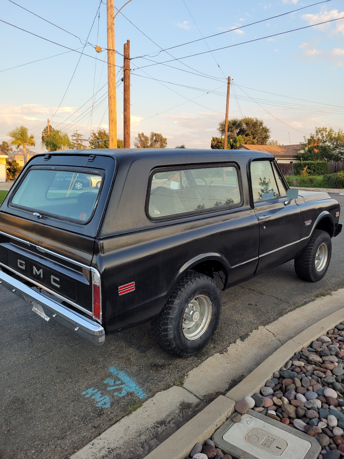 This is a 1972 GMC JIMMY We inherited the truck 3+ years ago. Drove it home approx. 150 miles with no overheating. NOT regulary driven.Solid truck with no cancer. Small area of rust near tailgate.Top looks to have a couple of patches but no leaks. Hatch nas a crack near hinge. A/C cab but missing compressor. No center console. Originaly Orange but painted black in the late 90's. Some cracks in the paint but still driver quality. Original bucket seats but need to be redone. CST Trim per the attached SPID. Not a SHOW truck but good driver quality. Tires show some dry rot. All glass is good and original. Manual choke and carb sticks. Not regularly driven and stalls sometimes while idling. I tried to be as thorough as possible. Drive as is or take it to the next level. Clean signed title. Please ask questions before bidding (see pics). I reserve the right to end auction early. Bid to win. I'm open to offers but NO DREAMERS. I know what the truck is worth. Do your research and get permission if needed before bidding!!! SOLD AS-IS