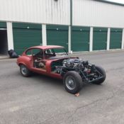 This Jaguar Replica hasNON-powered disc brakes in front, and drum brakes in the rear. It does have a dual master cylinder. I have been told that the brakes are Ford. The front end suspension is upper andlower control arms with shock absorbers at all 4 corners. The rear end is a live rear axle.