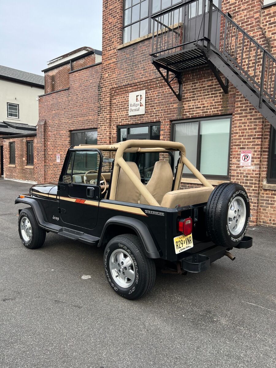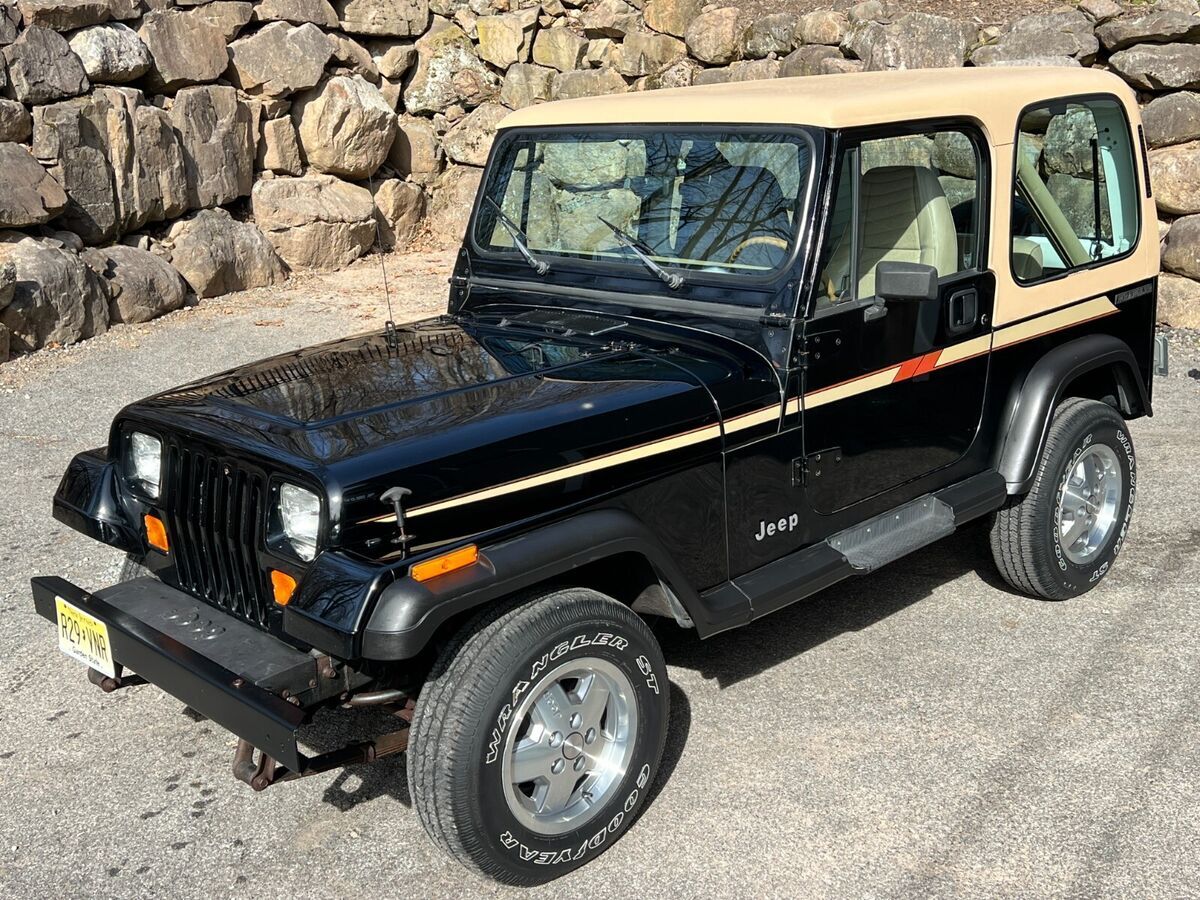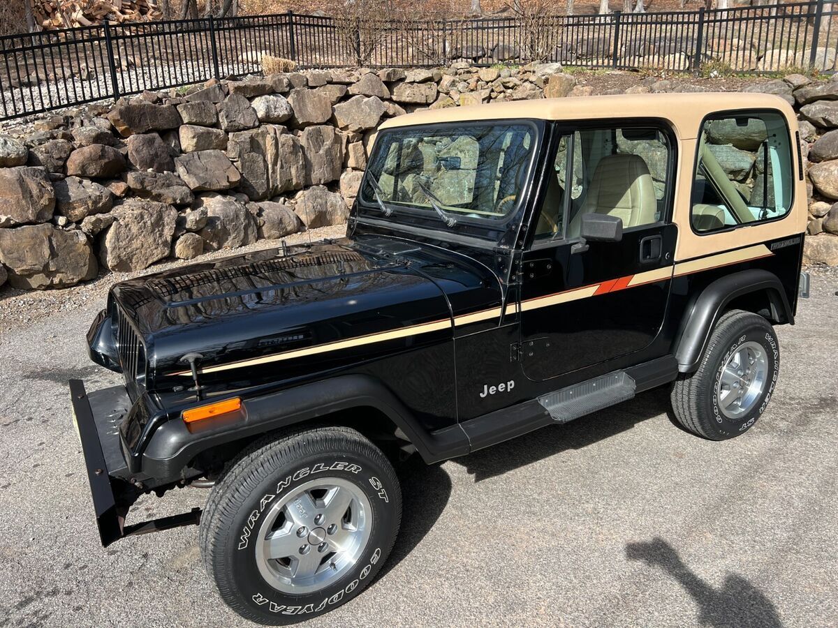 Garage kept original owner from 1991-2024. Black paint is deep and glossy. Straight body, and hardtop is excellent with new hatch struts and no gouges in hardtop. Solid underneath no rusty scale on undercarriage components. Factory undercoated and not recoated since.Floor pans solid. Interior is clean. Wear/tear on side of driver's seat, a standard light tan material that is replaceable, not like the center section with JEEP logo.