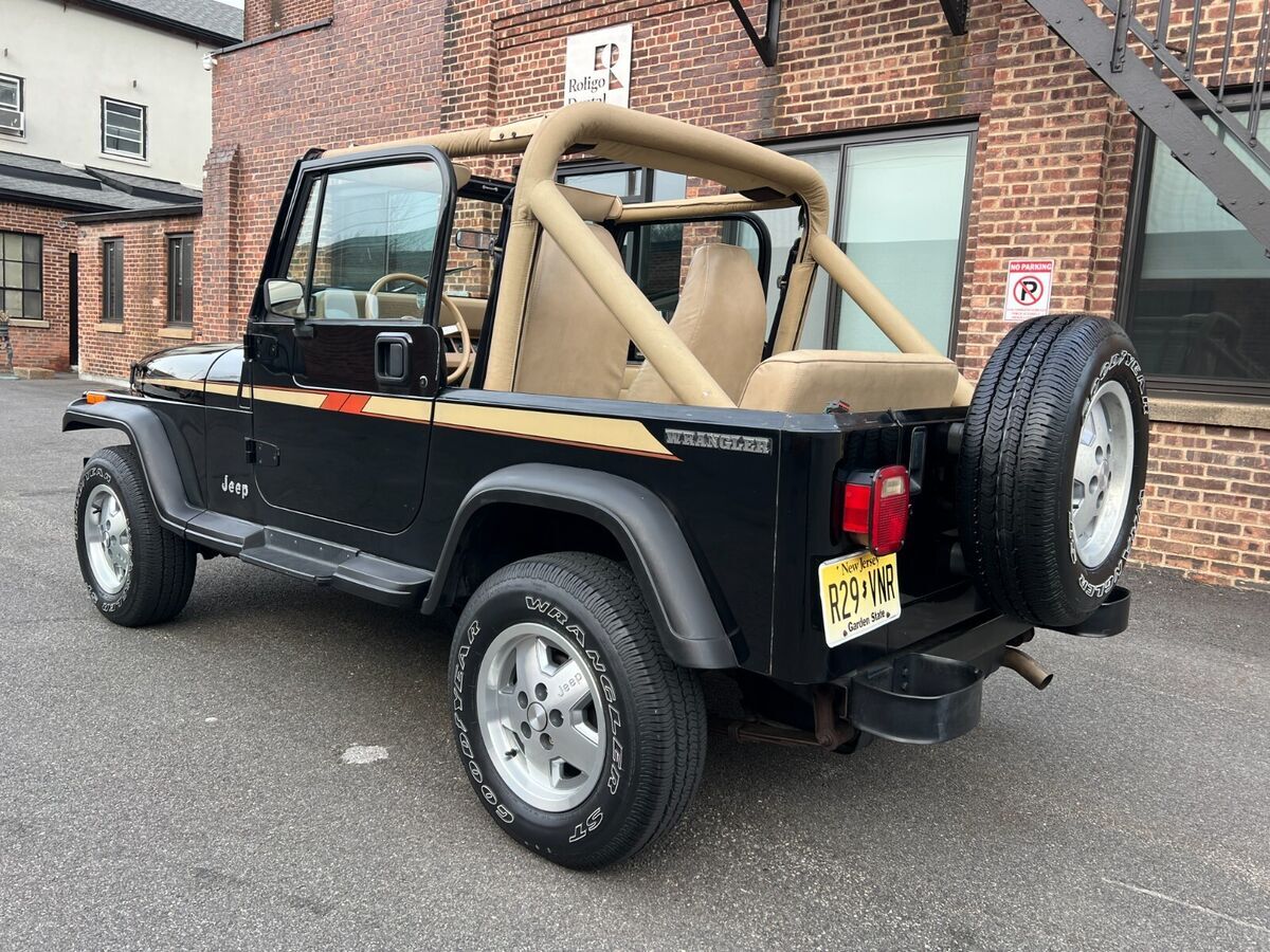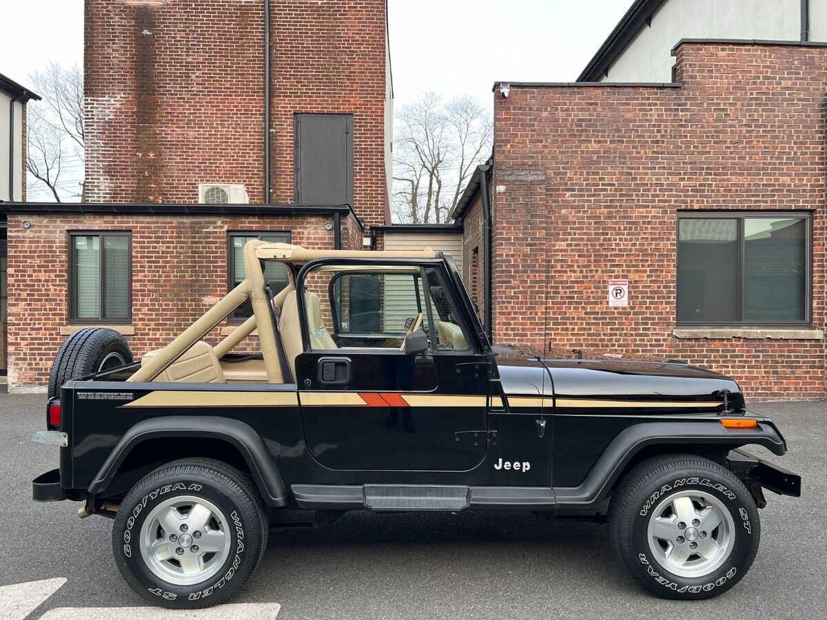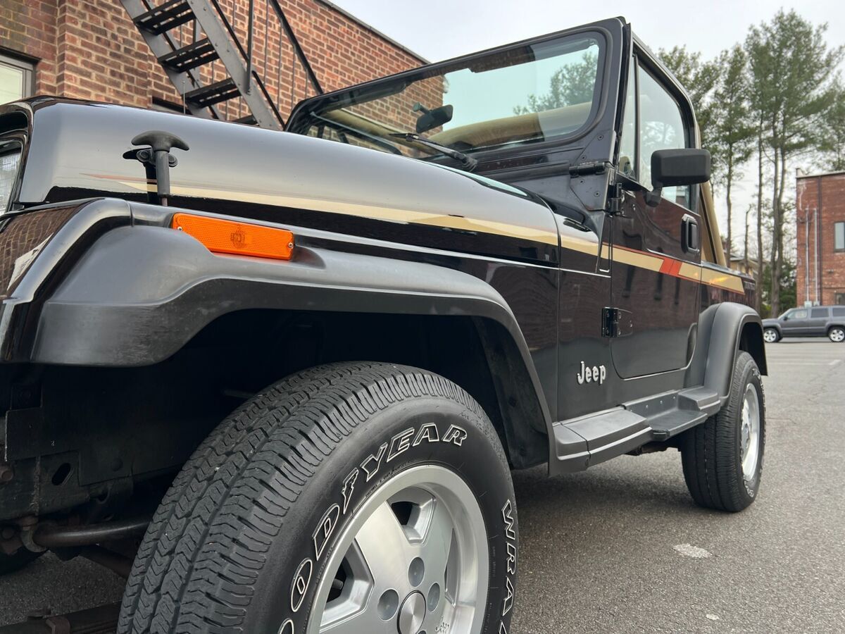 Garage kept original owner from 1991-2024. Black paint is deep and glossy. Straight body, and hardtop is excellent with new hatch struts and no gouges in hardtop. Solid underneath no rusty scale on undercarriage components. Factory undercoated and not recoated since.Floor pans solid. Interior is clean. Wear/tear on side of driver's seat, a standard light tan material that is replaceable, not like the center section with JEEP logo.