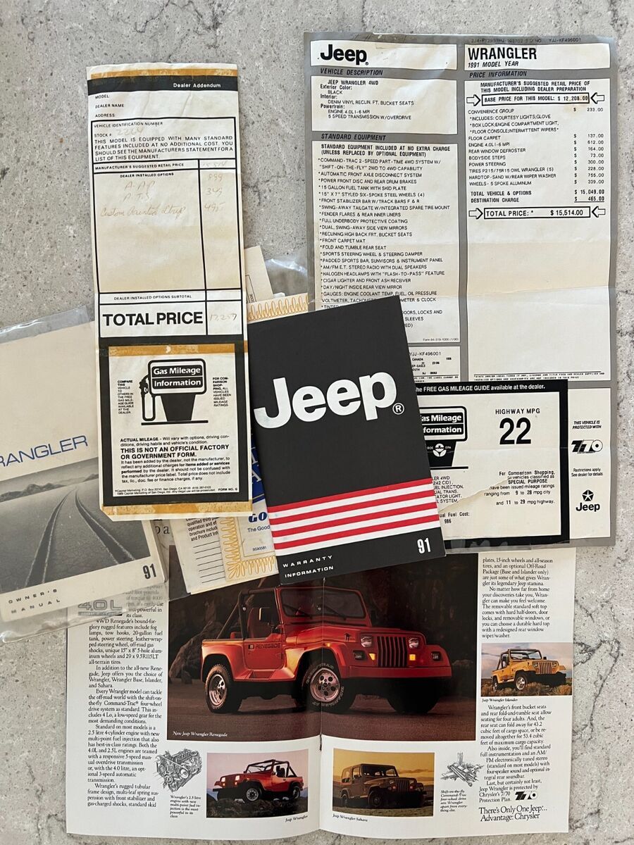 1991 first year of the 4.0L engine and last year of the slanted roll bar. Sale includes original window sticker, original radio, dealer installed soundbar, Owner’s manual, color dealer sales brochure, warranty cards, manual for 1990’s aftermarket radio,…