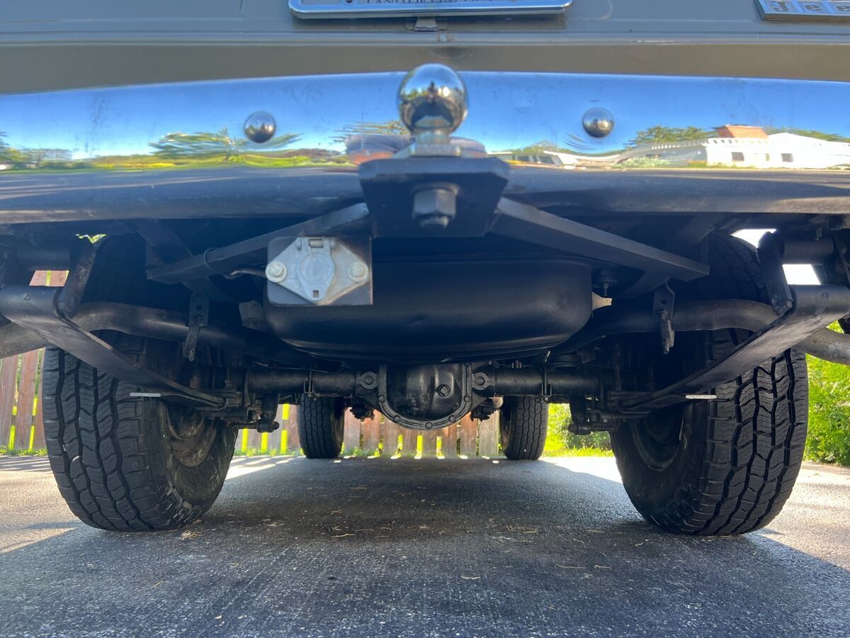 The vehicle features an olive paint job accented by chrome bumpers, a chrome roof rack, and a rear ball hitch for added functionality. The paint presents well overall, though some prior repair work on the hood is showing wear.